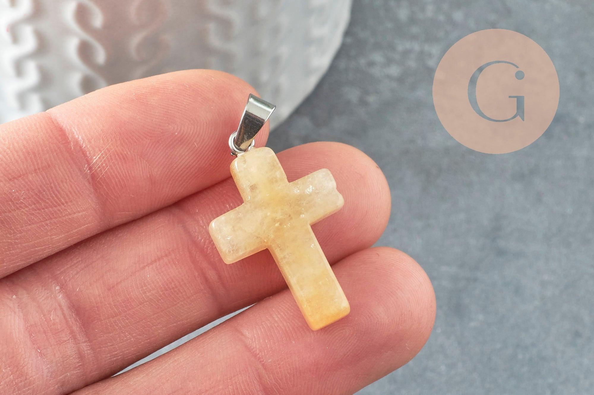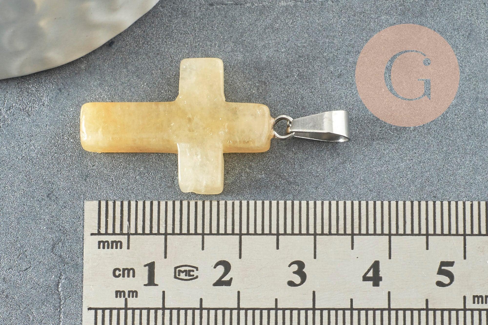 Natural yellow topaz jade cross pendant stainless steel 29mm, stone pendant, silver support, natural jade jewelry creation, x1 G5699