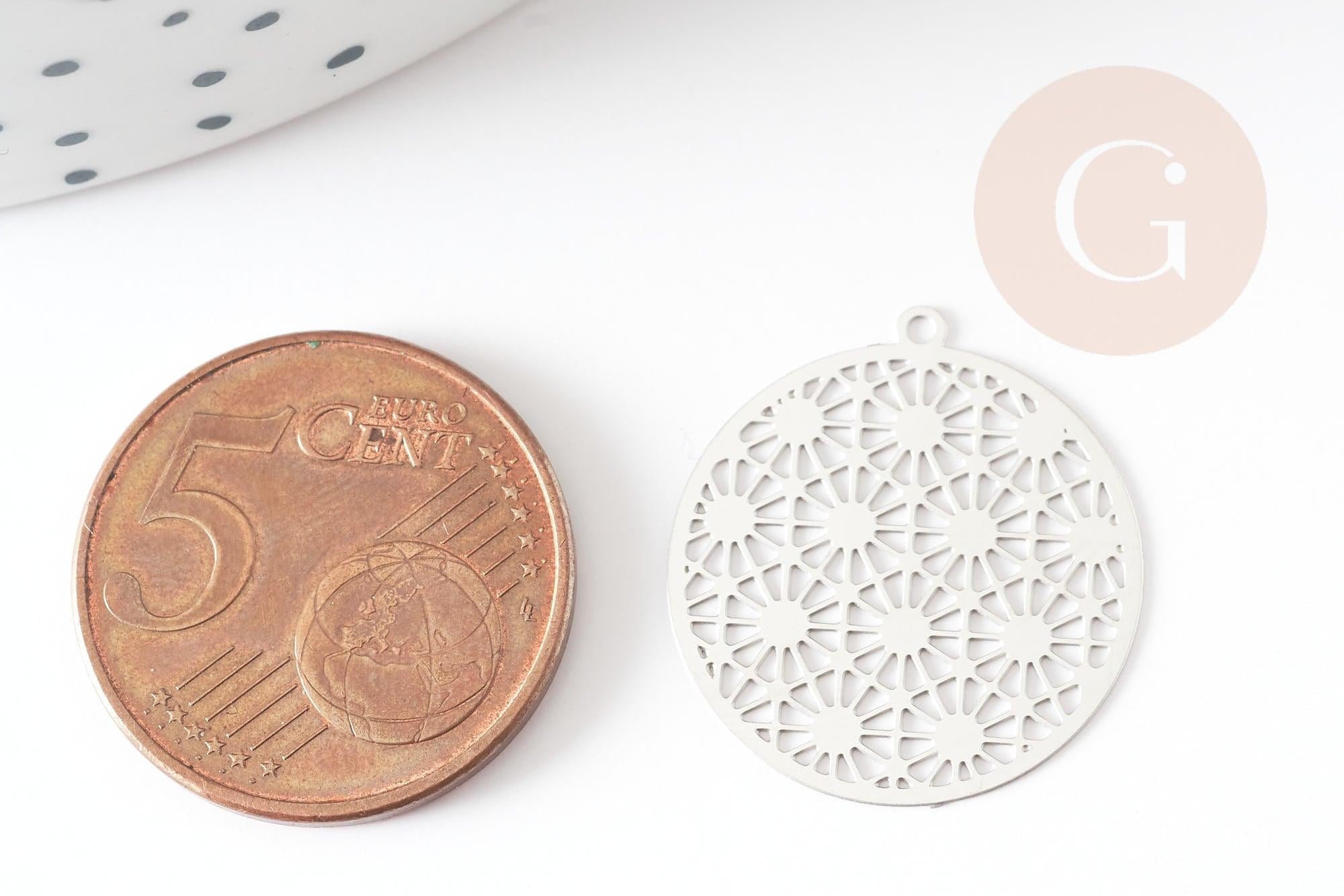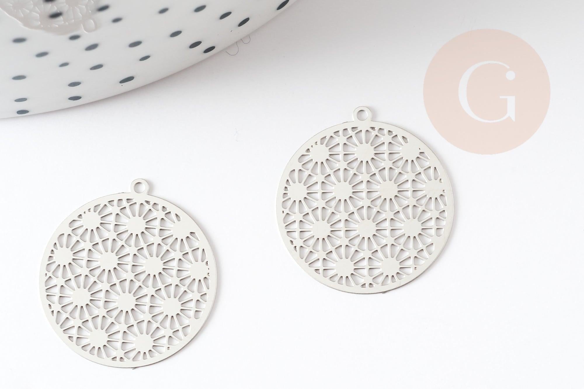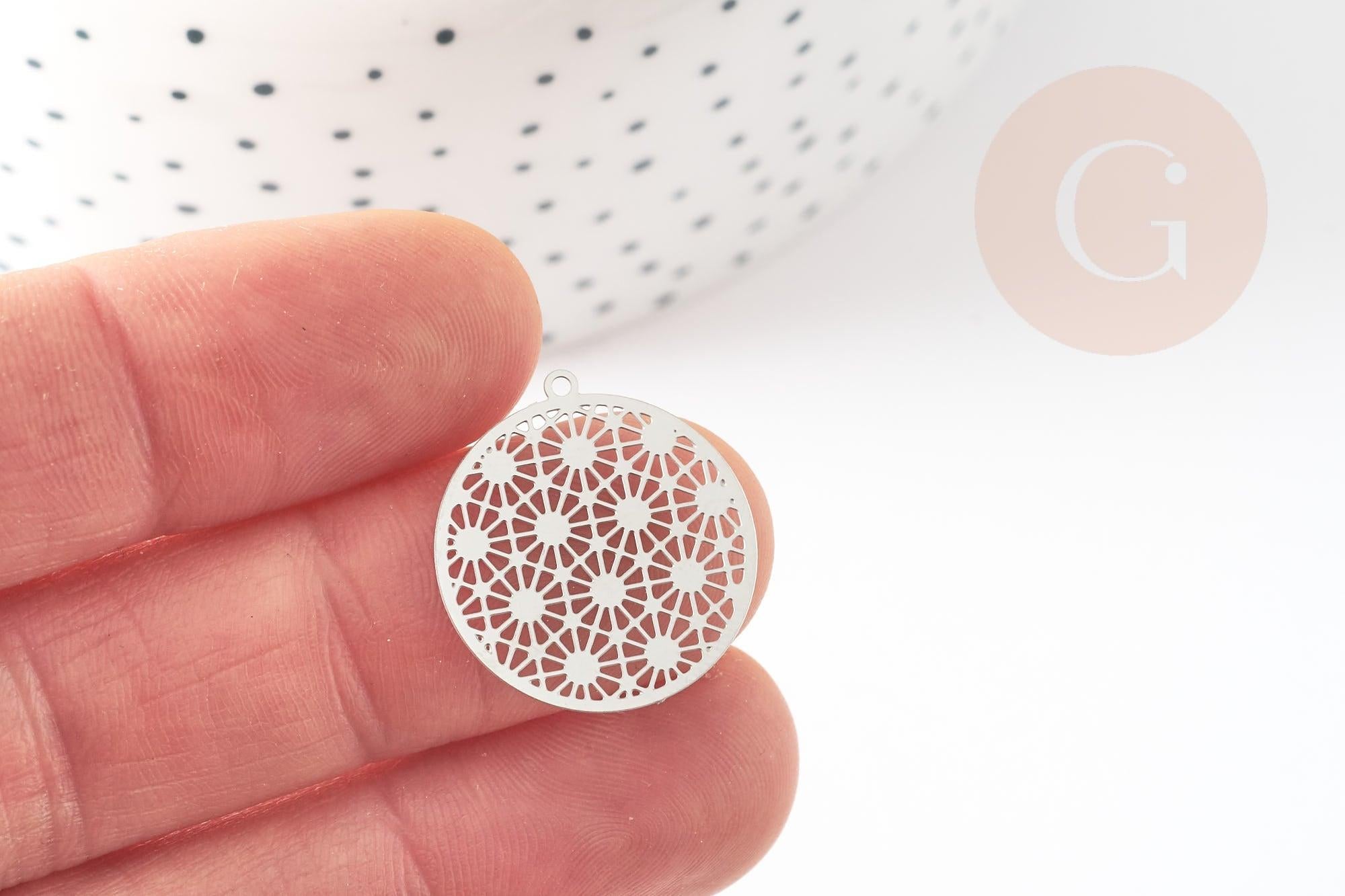 Pendentif estampe filigrane rond acier argent, Pendentif très fin et léger, 21.5x20mm ,x2 (G4111)