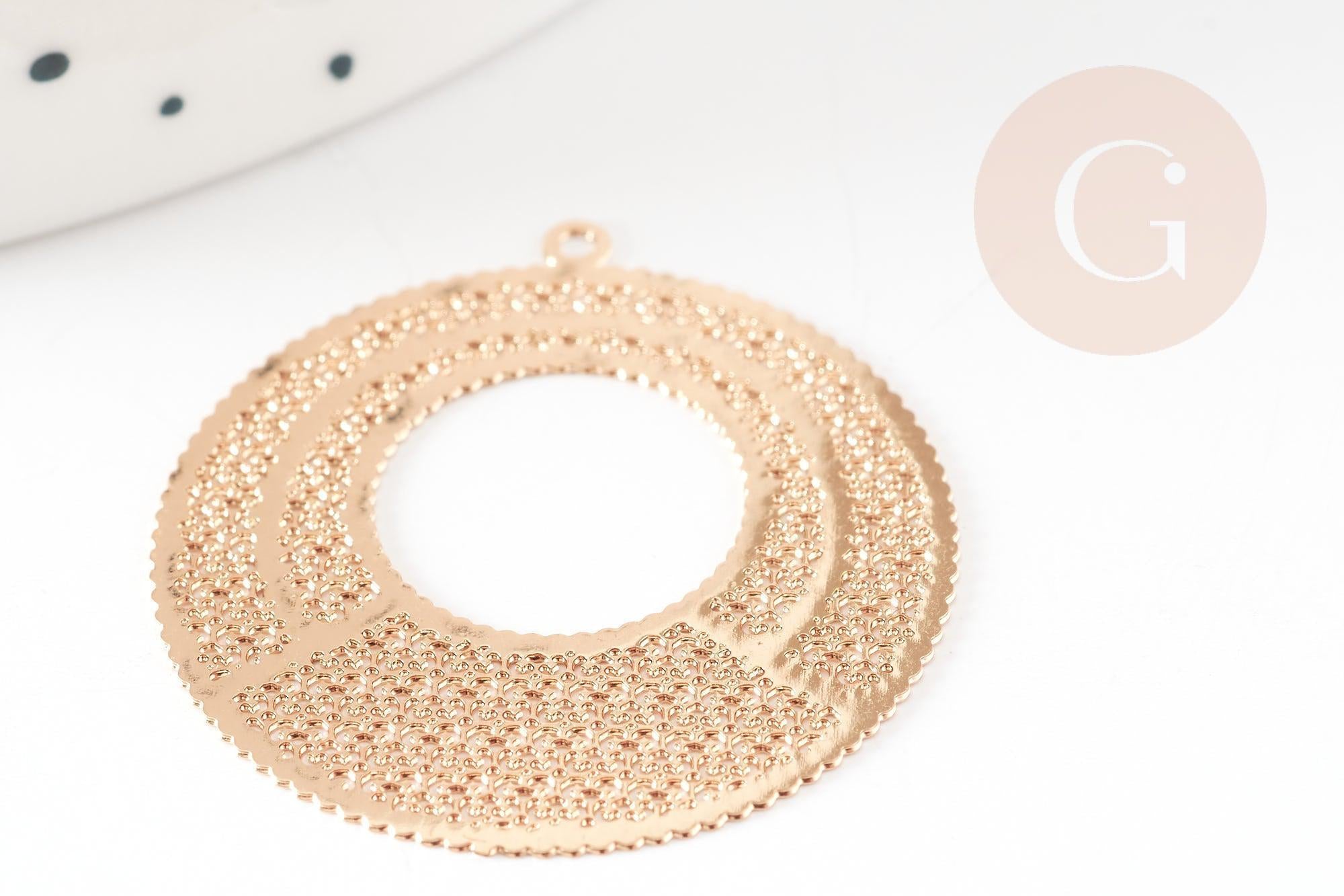 Discover our 33 mm round filigree lace print pendant in gold-plated brass . This pendant combines finesse, lightness and a delicate aesthetic to create unique and refined jewelry. This set includes two round print pendants in gold-plated brass.
