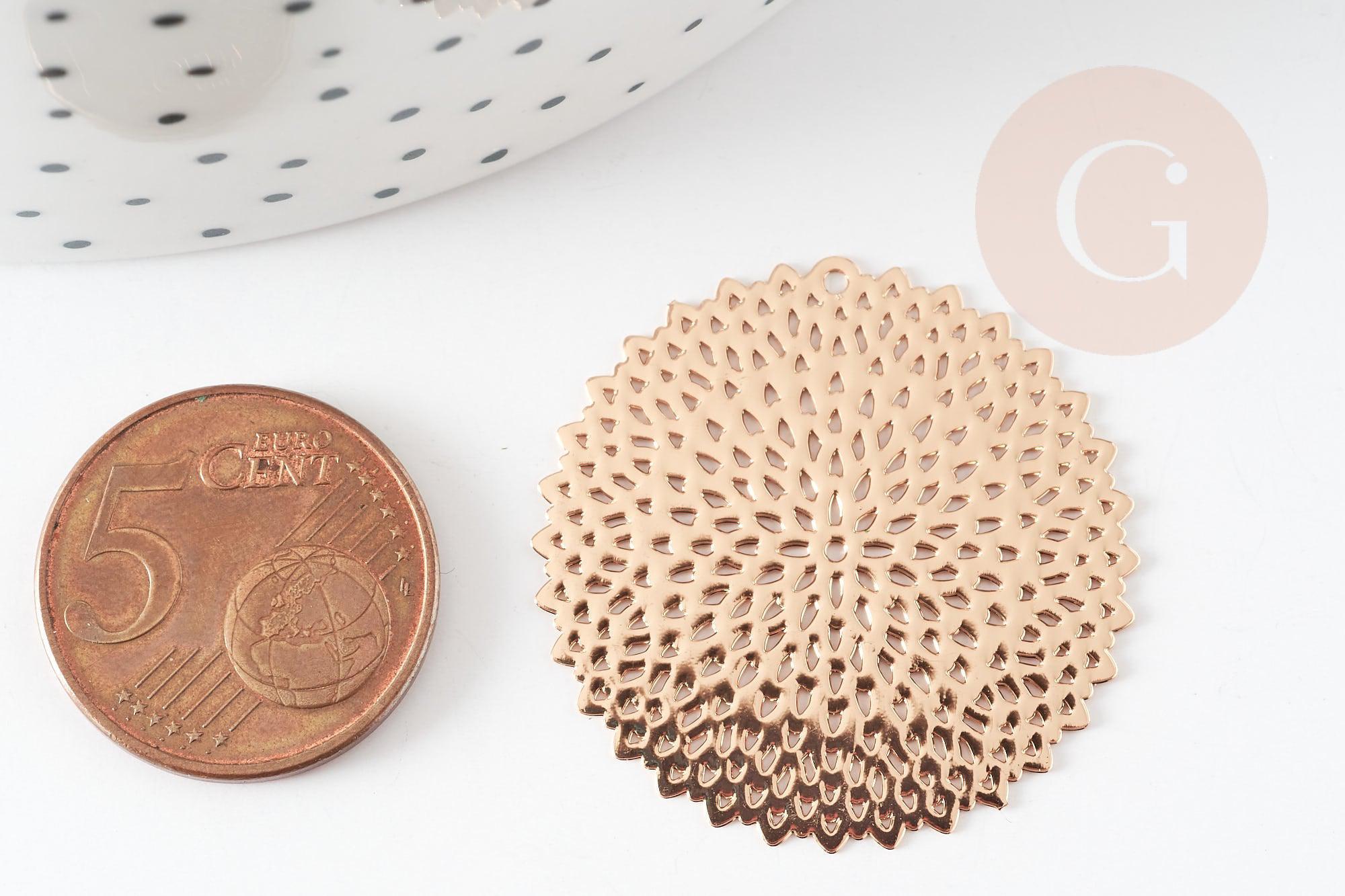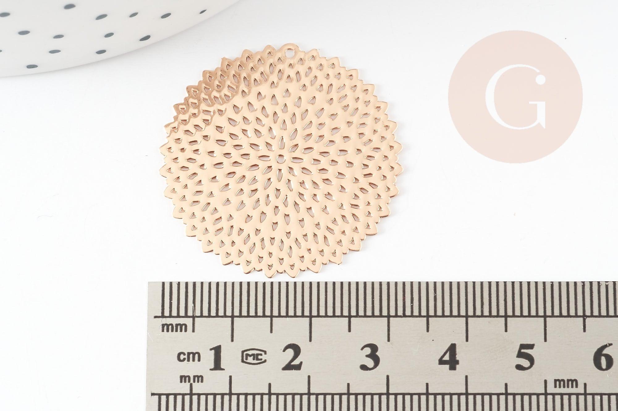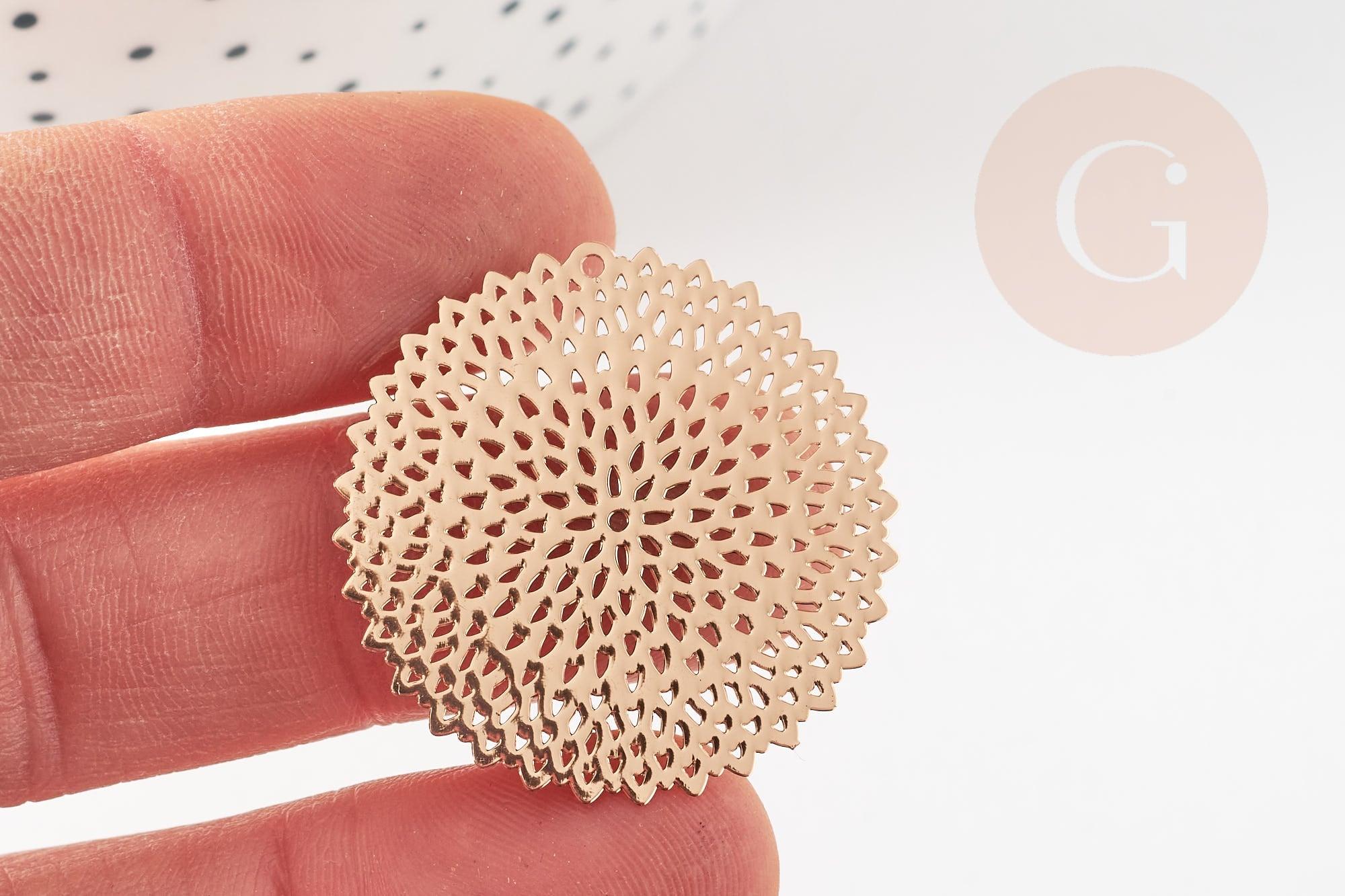 Discover our round filigree print pendant in the shape of a rosette in gold-plated brass measuring 32 mm. This pendant combines elegance and lightness to create a unique piece of jewelry.