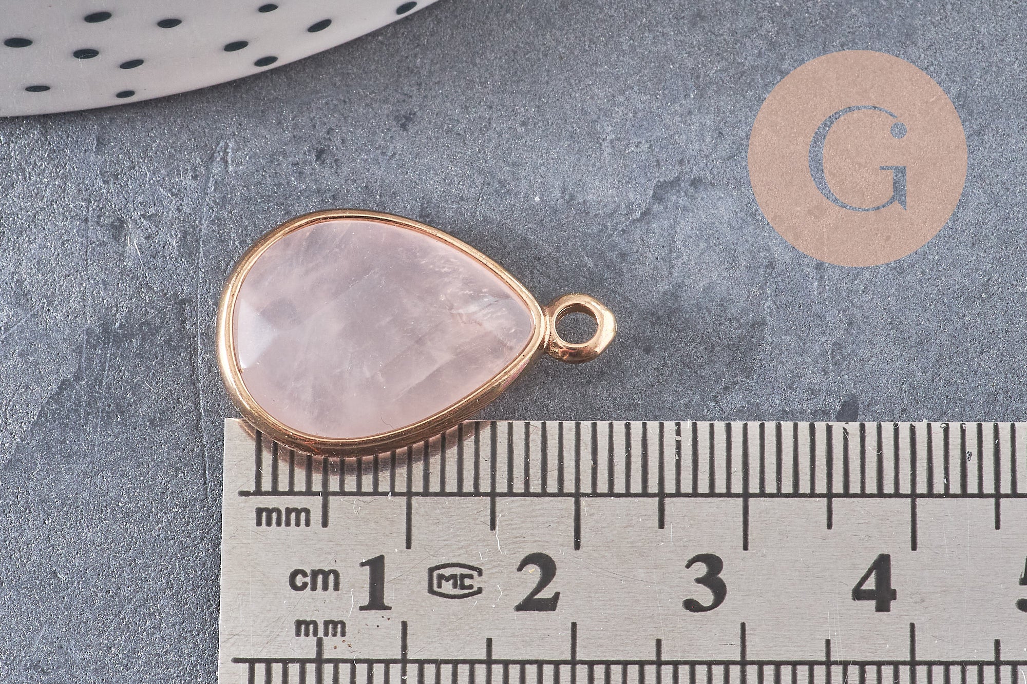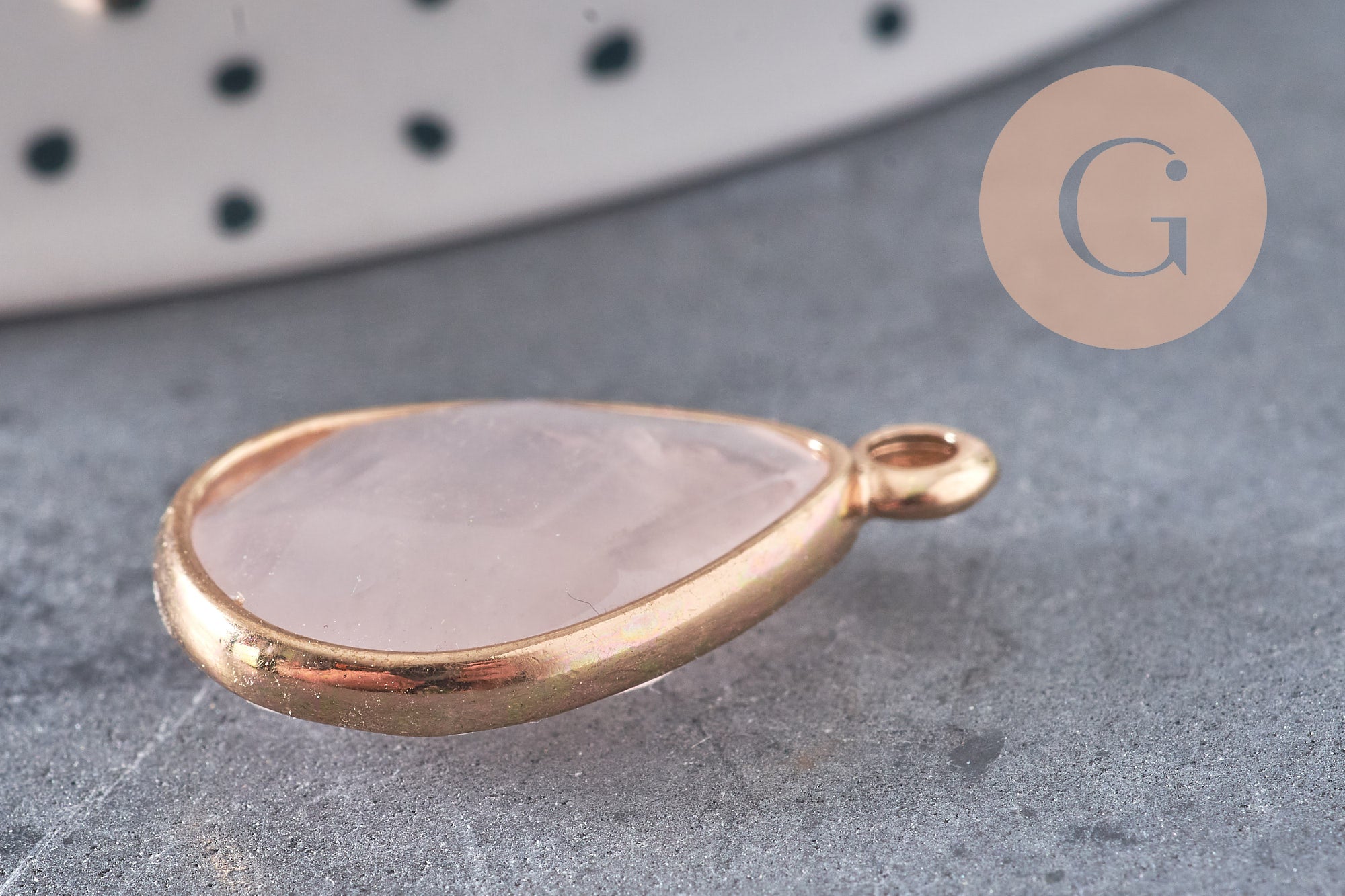 Fall for this small natural rose quartz pendant with its golden brass drop-shaped support.