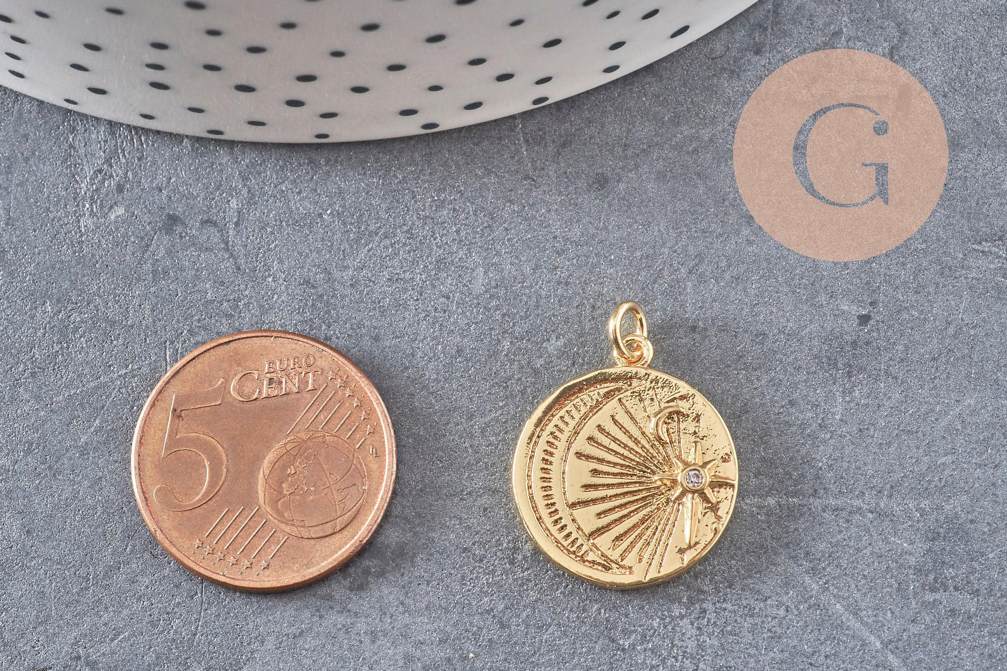 Round moon pendant engraved in 16K gold-plated brass with a star and zircon, 20.5mm, a gold-plated pendant with crystals for jewelry making, x1 (G5960)