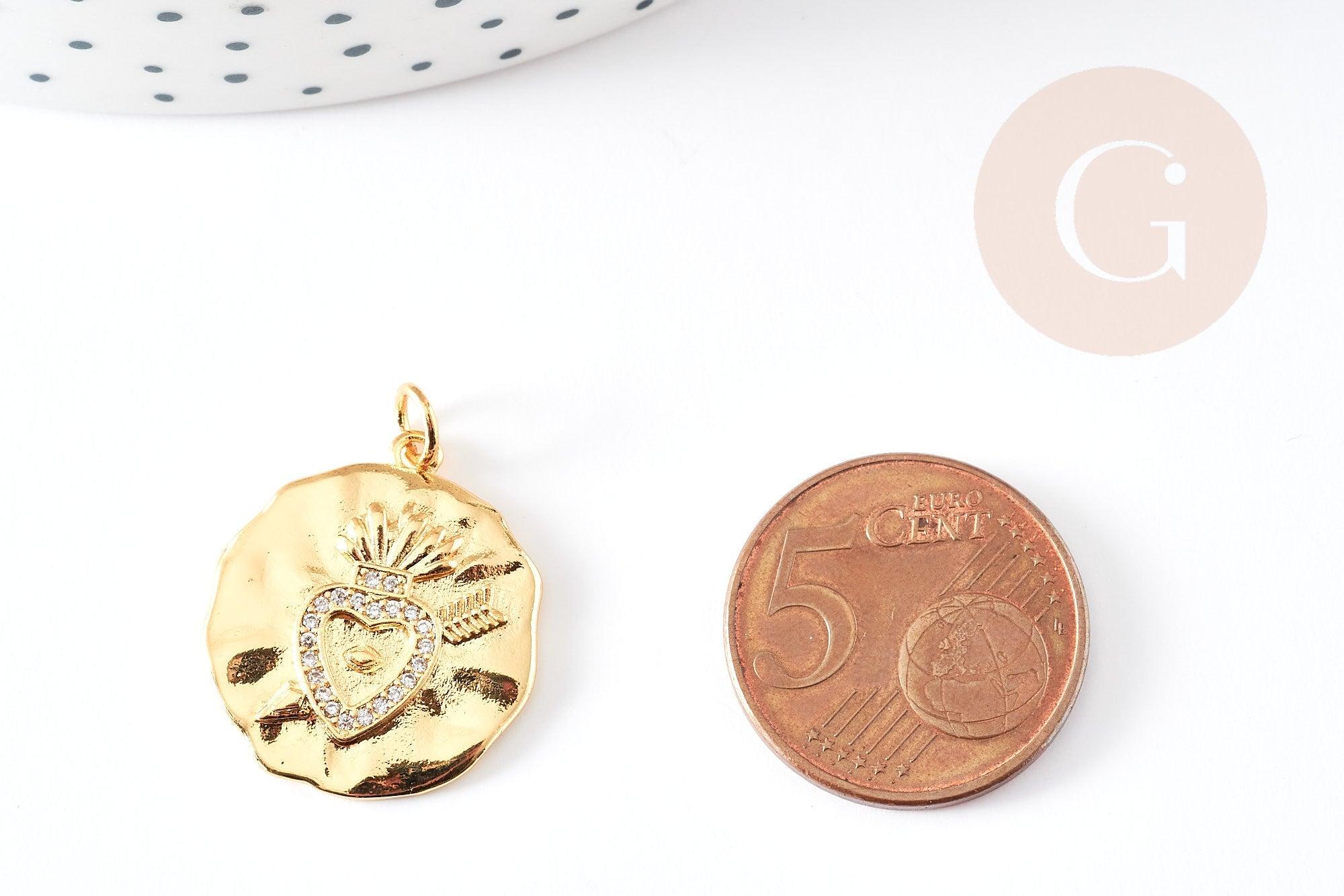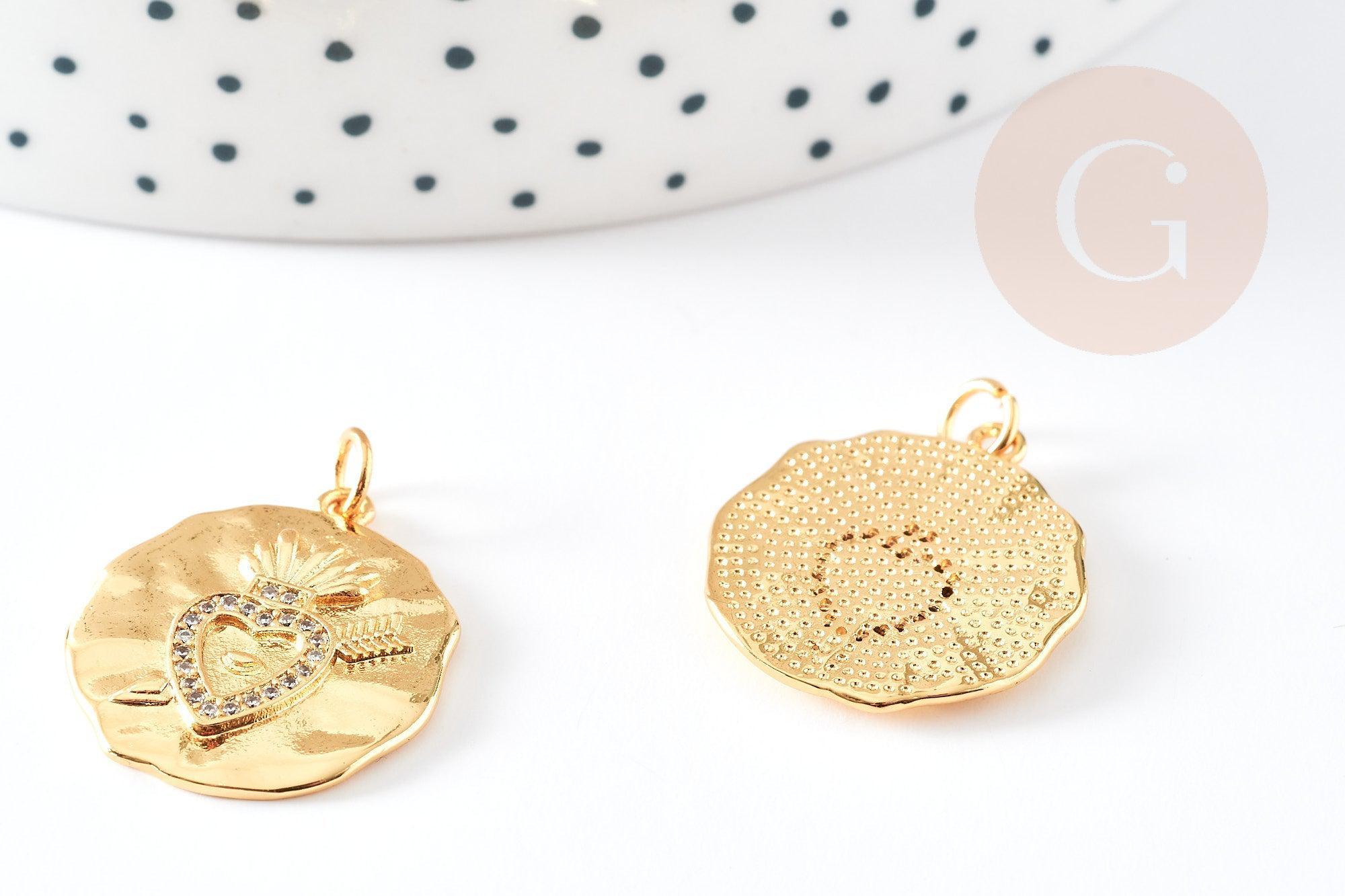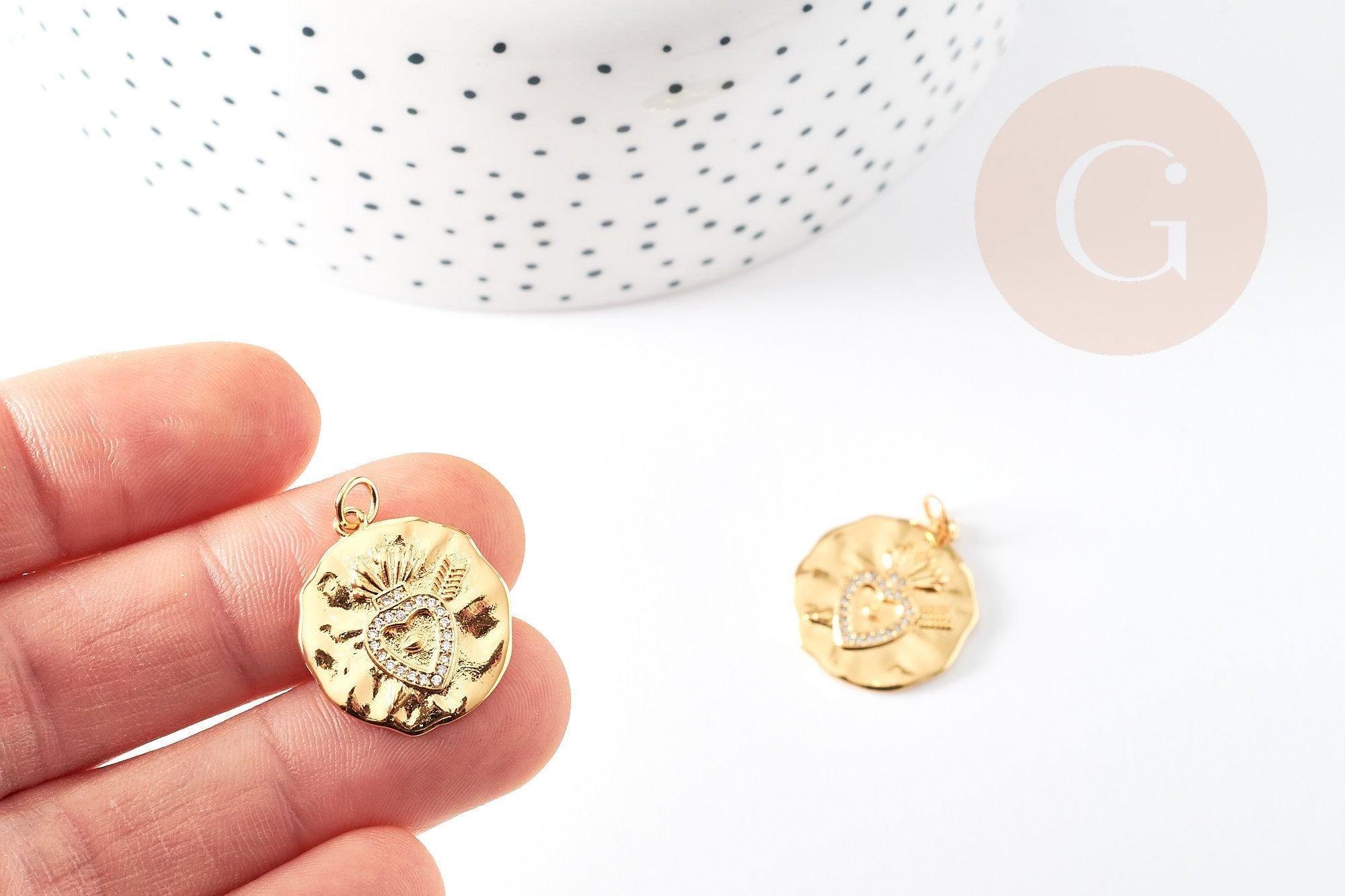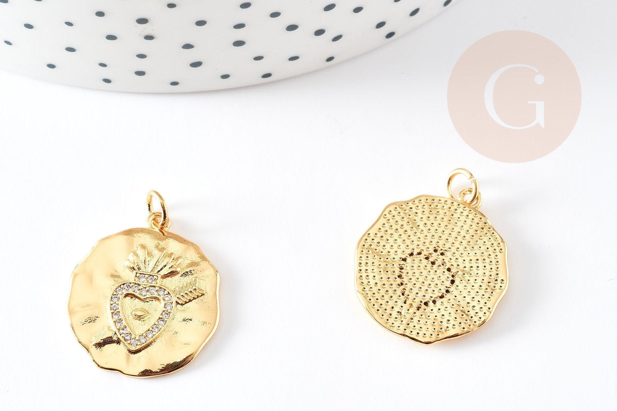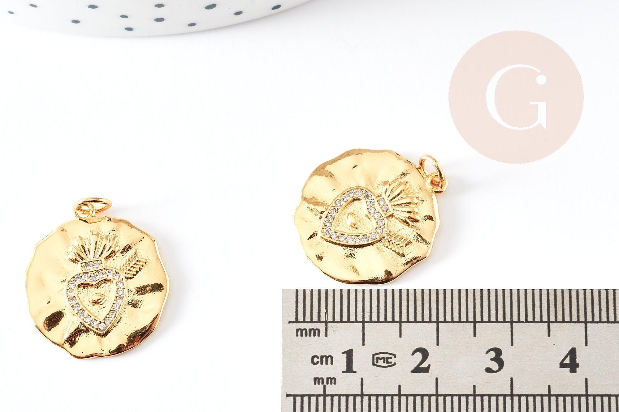 An adorable sacred heart pendant in 18K gold-plated brass to use in all your creations. It is decorated with small white zircons all around the heart.