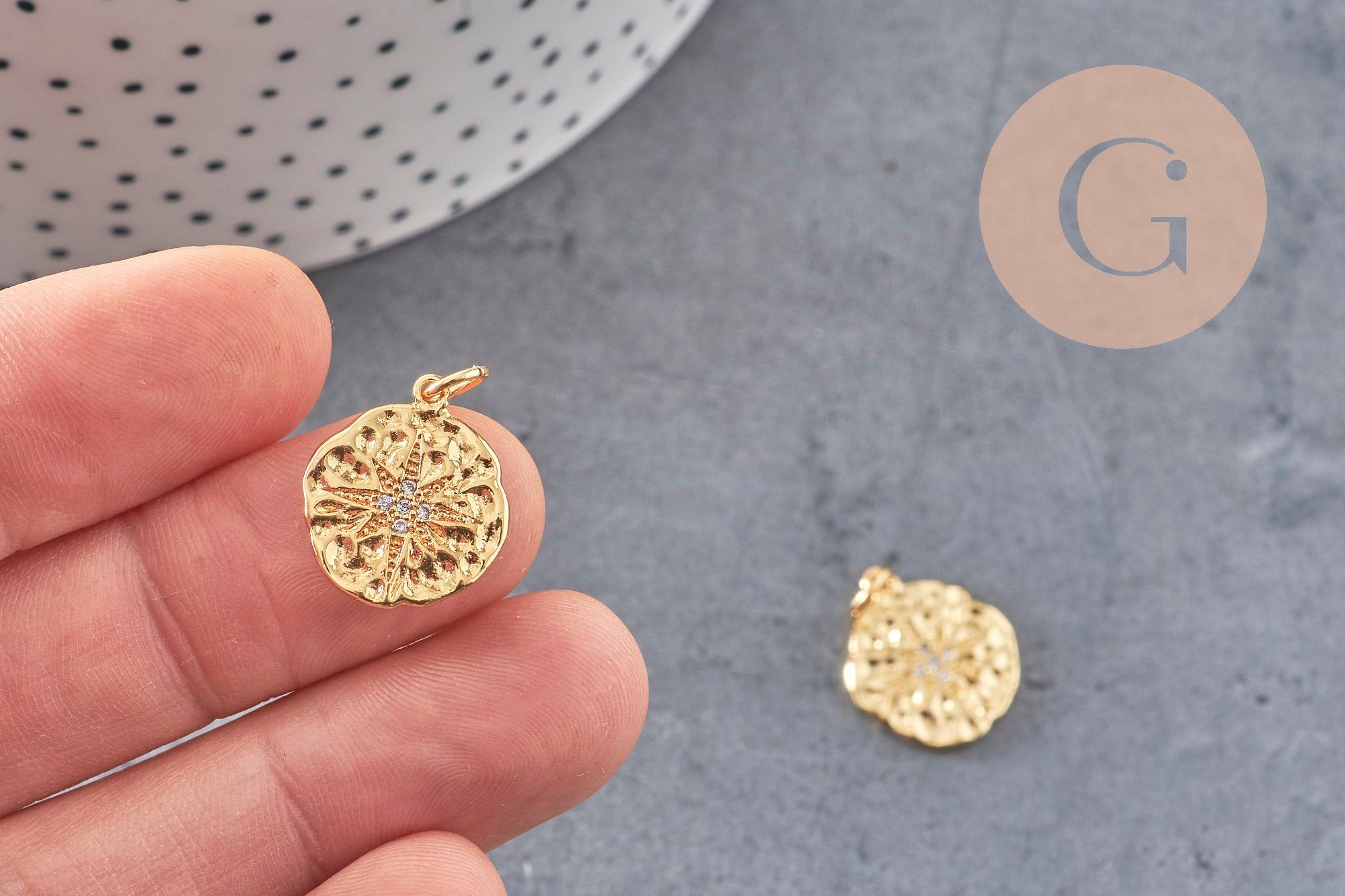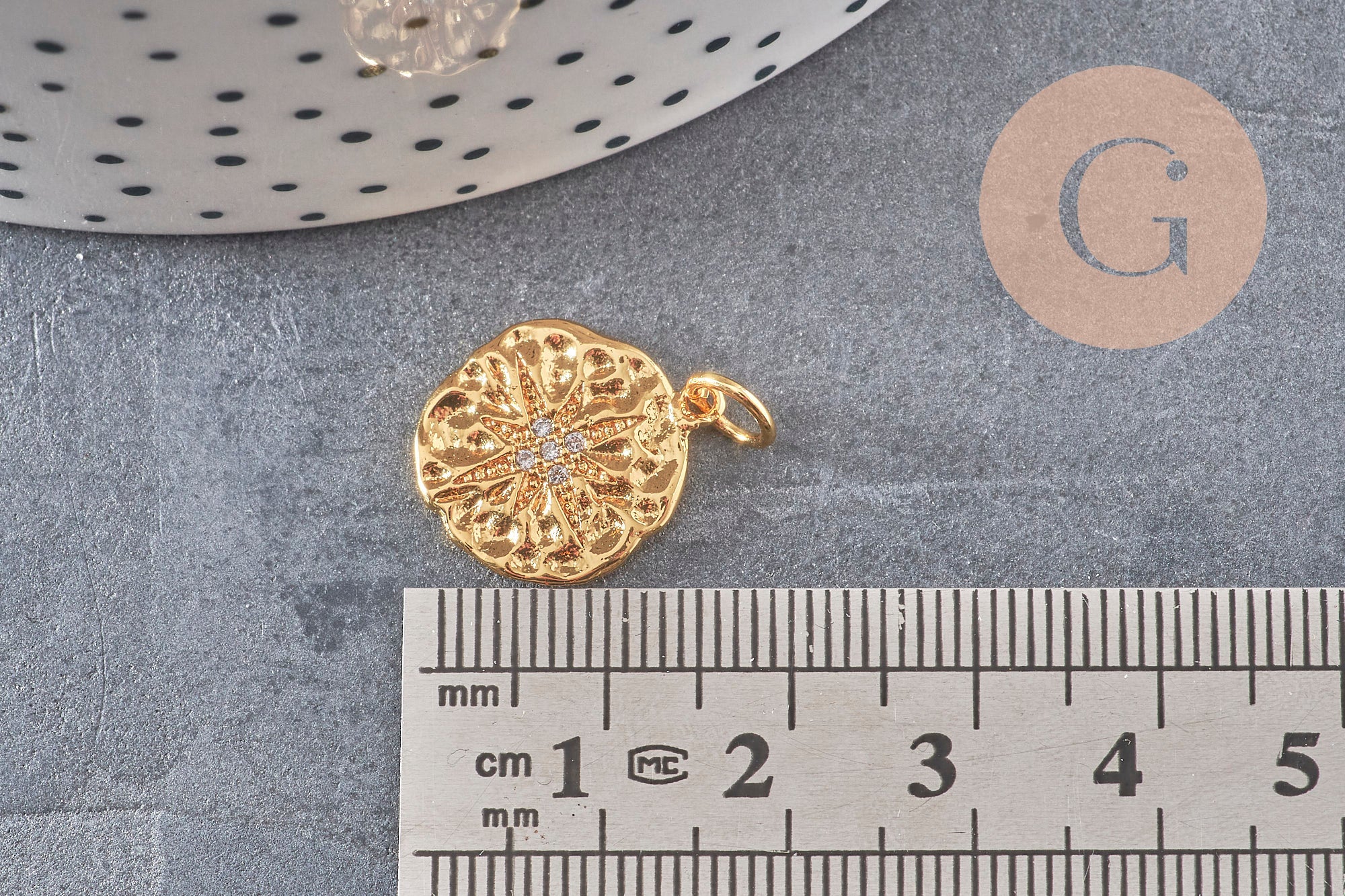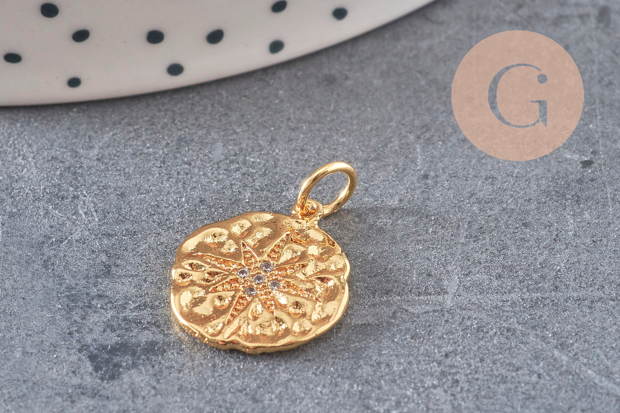 Gold medal pendant crystal zircon, golden pendant, lucky charm, golden brass, star medal jewelry, jewelry creation, 17mm, unit