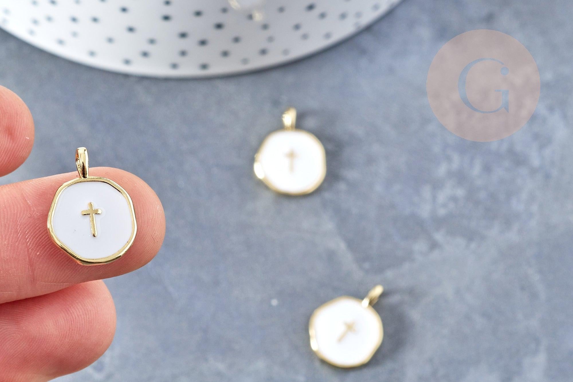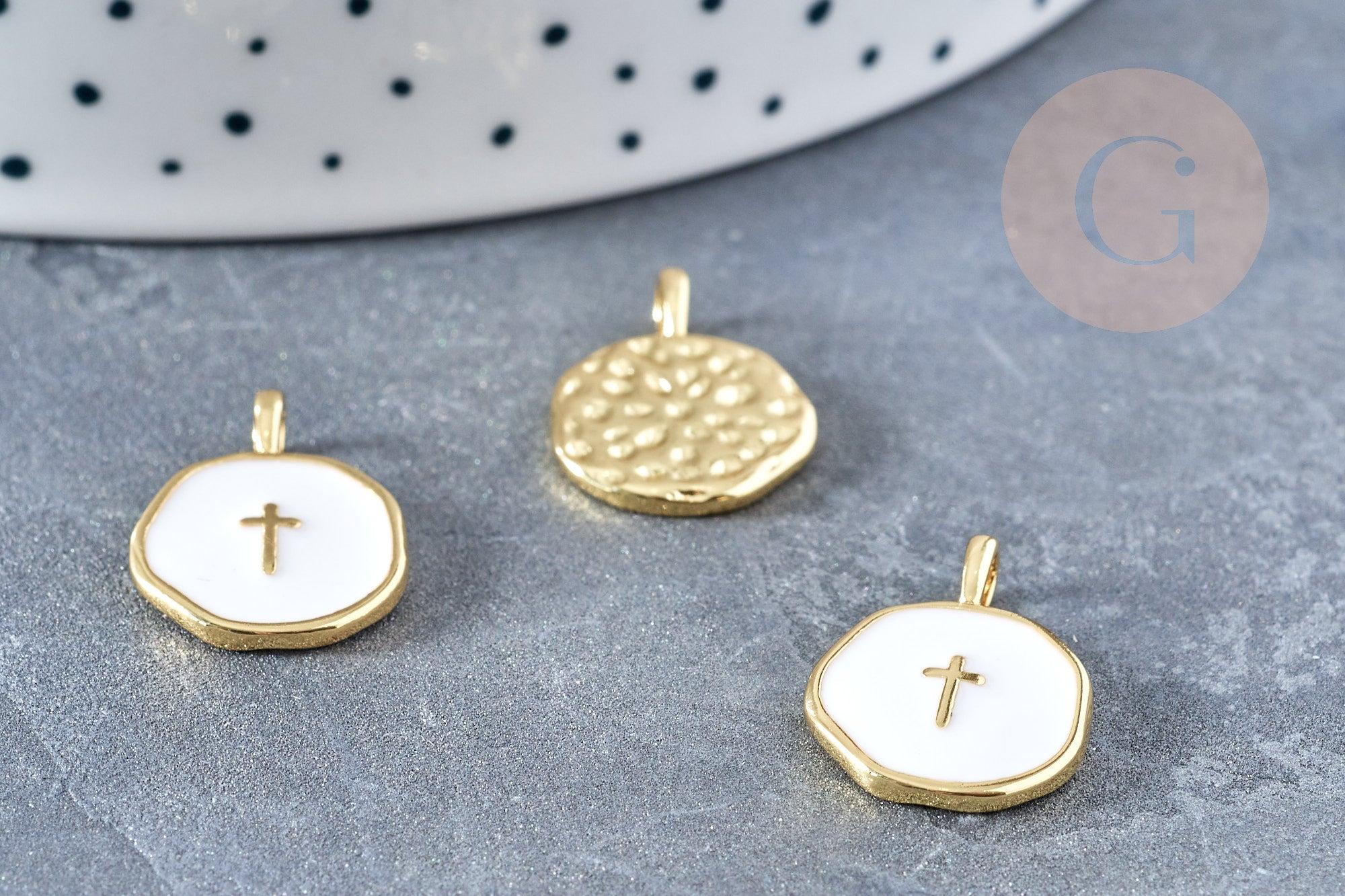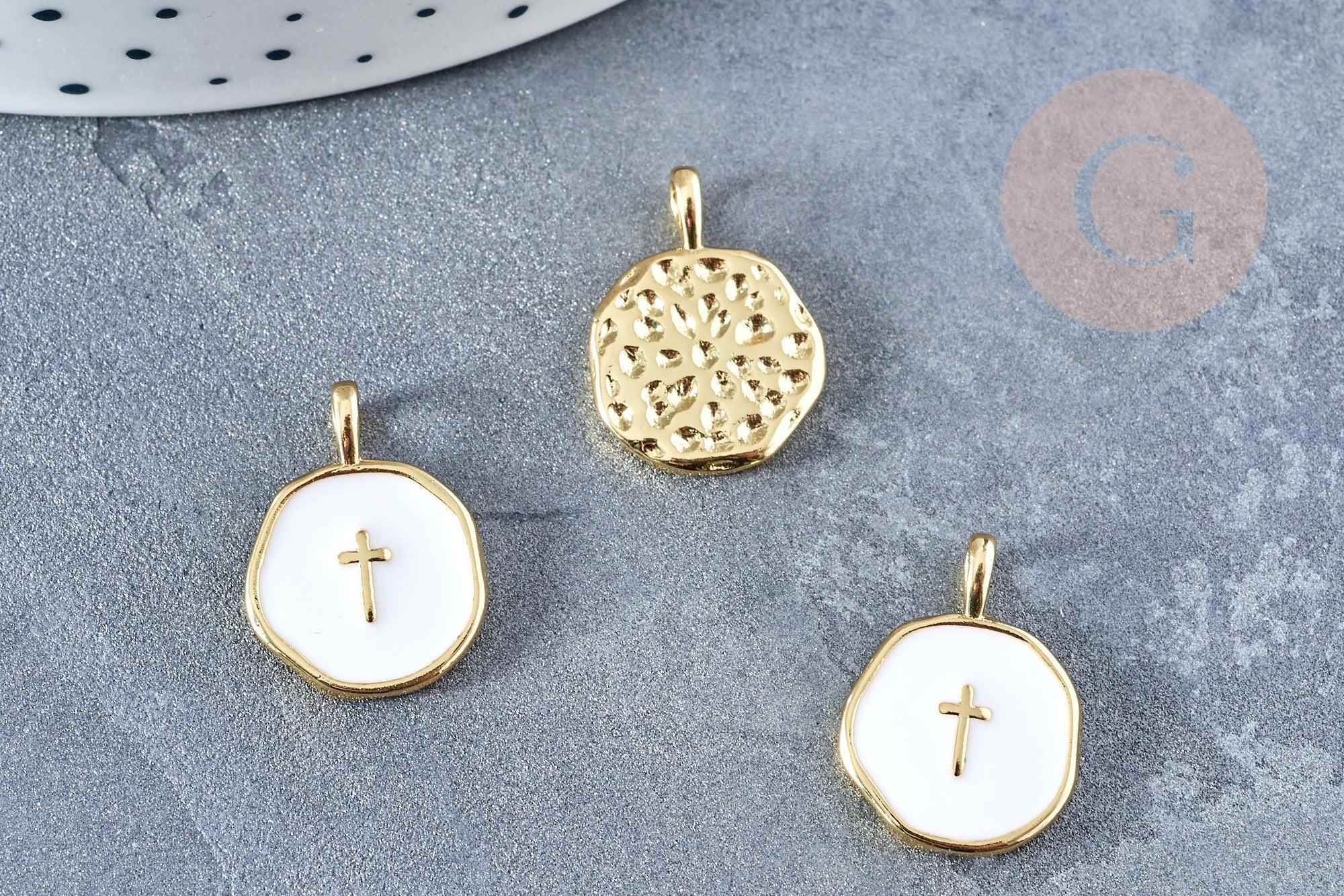 This round gold-plated brass pendant adorned with a cross with white enamel is a perfect choice for creating DIY jewelry. Each pendant is gold-tone and finished with a white enamel finish, adding a touch of elegance to your creations.