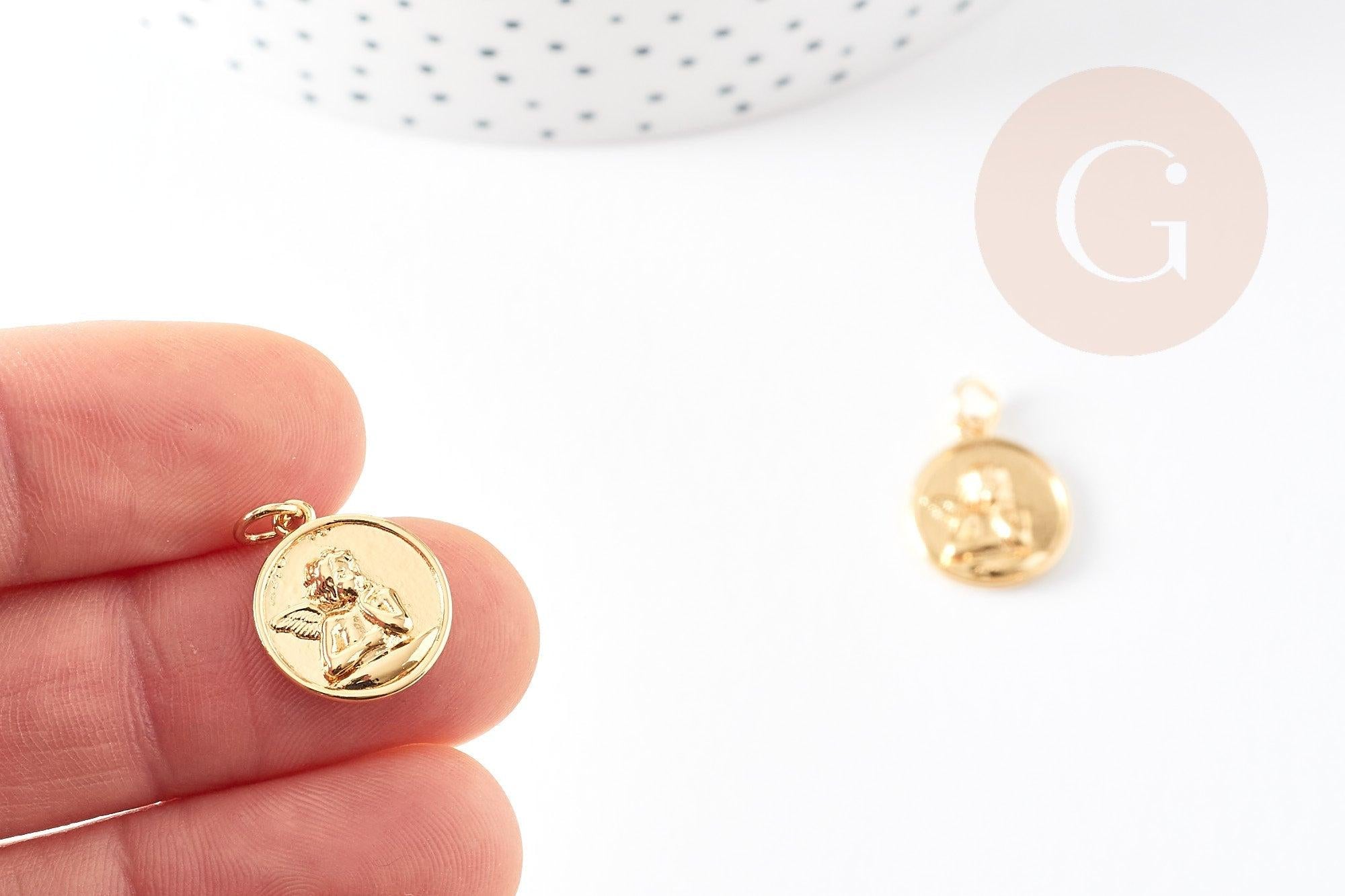 Pendentif médaille ronde ange laiton doré 18K, pendentif laiton doré pour création bijoux,médaille or,17mm, x1 G4929