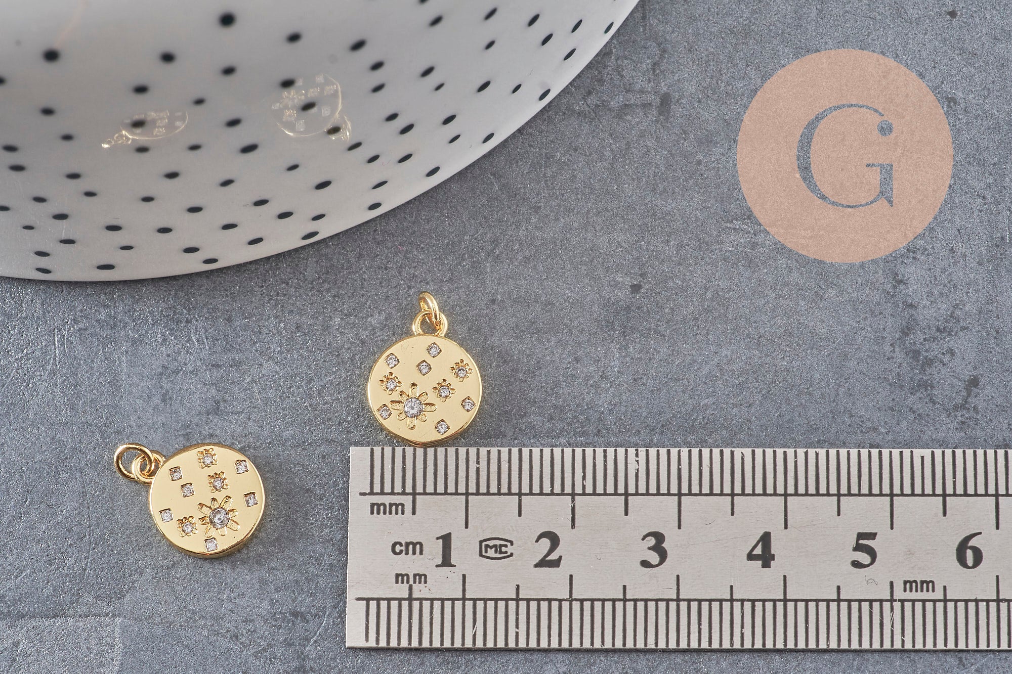 Pendentif médaille ronde étoiles laiton doré zircons, un pendentif doré avec cristaux pour création bijoux,14mm, x1 (G4748)