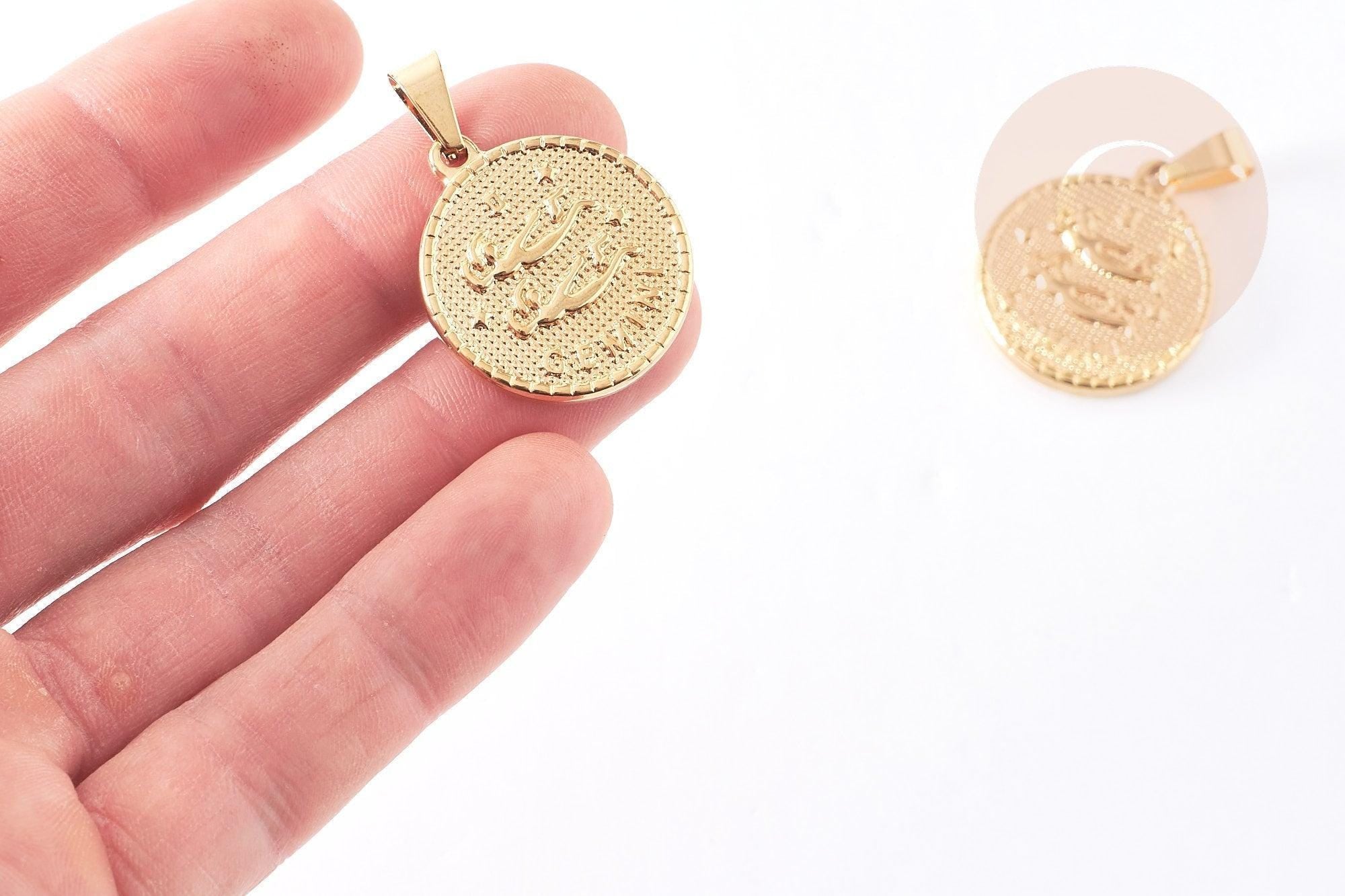 Gemini round medal pendant in golden steel, astrological sign, golden pendant, nickel-free, golden steel, jewelry creation, gold medal, 2.9cm