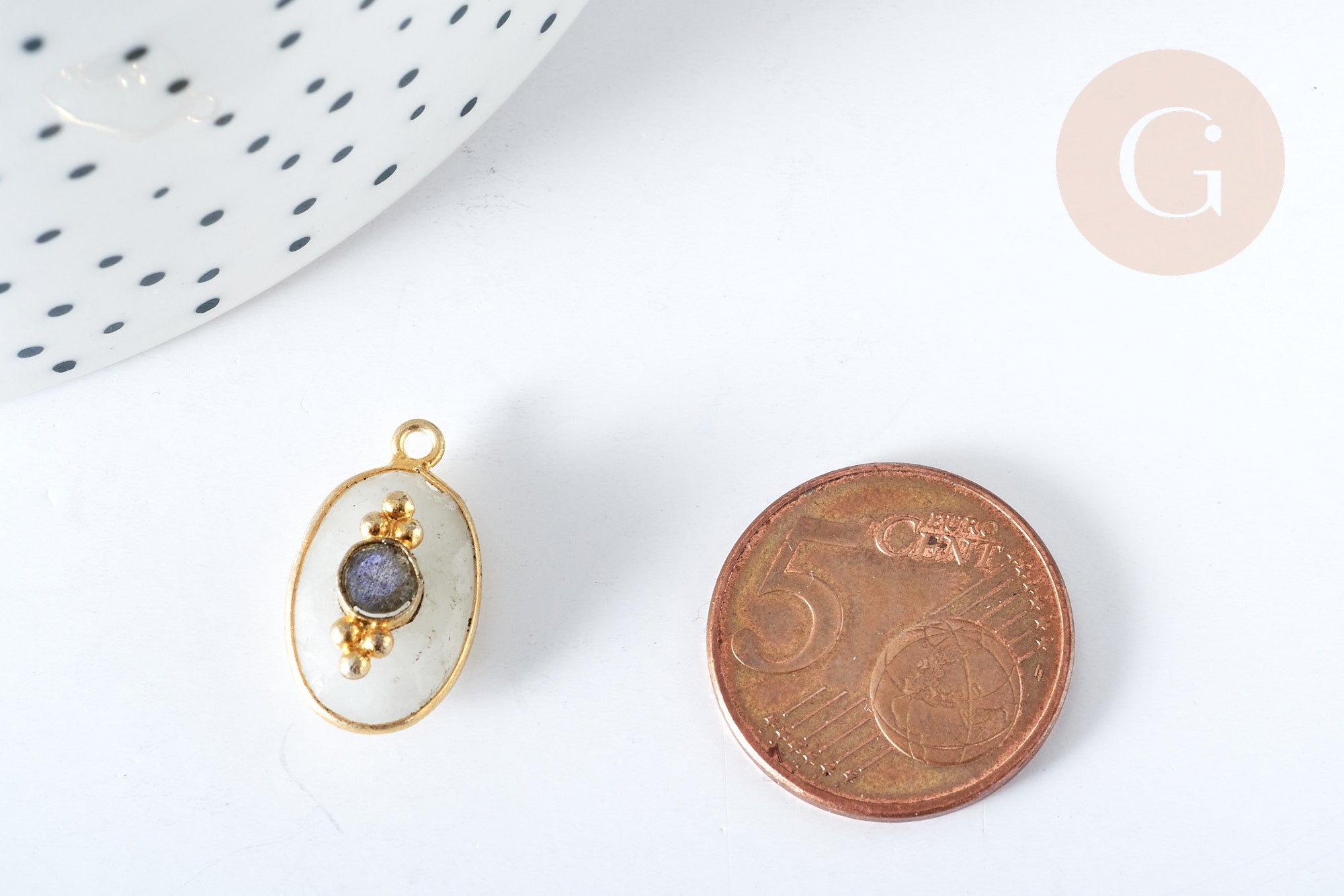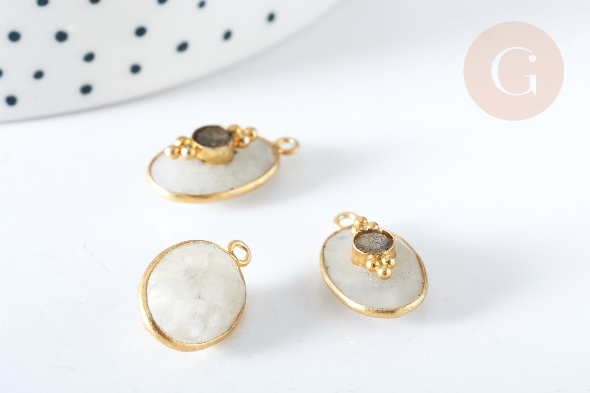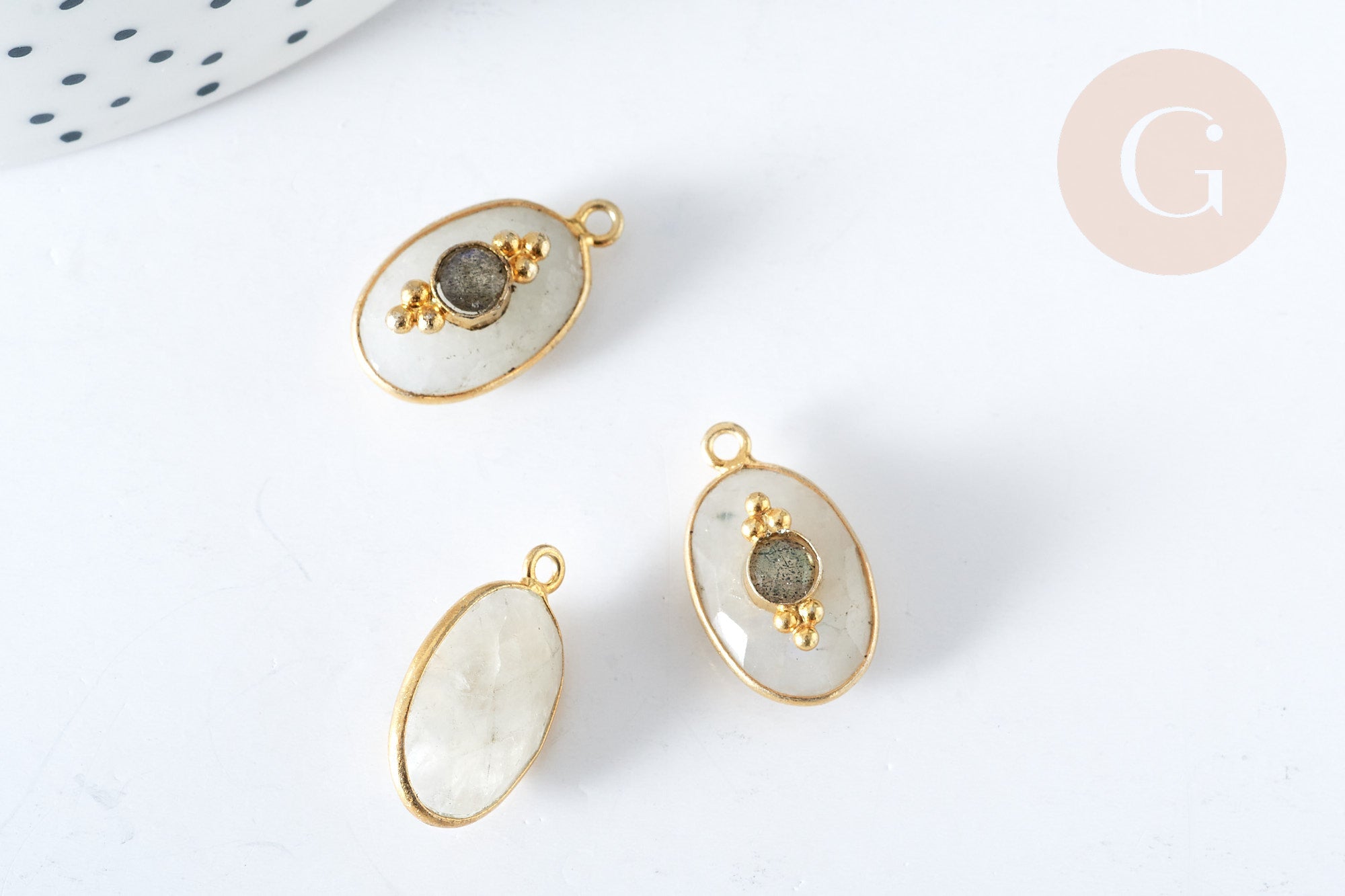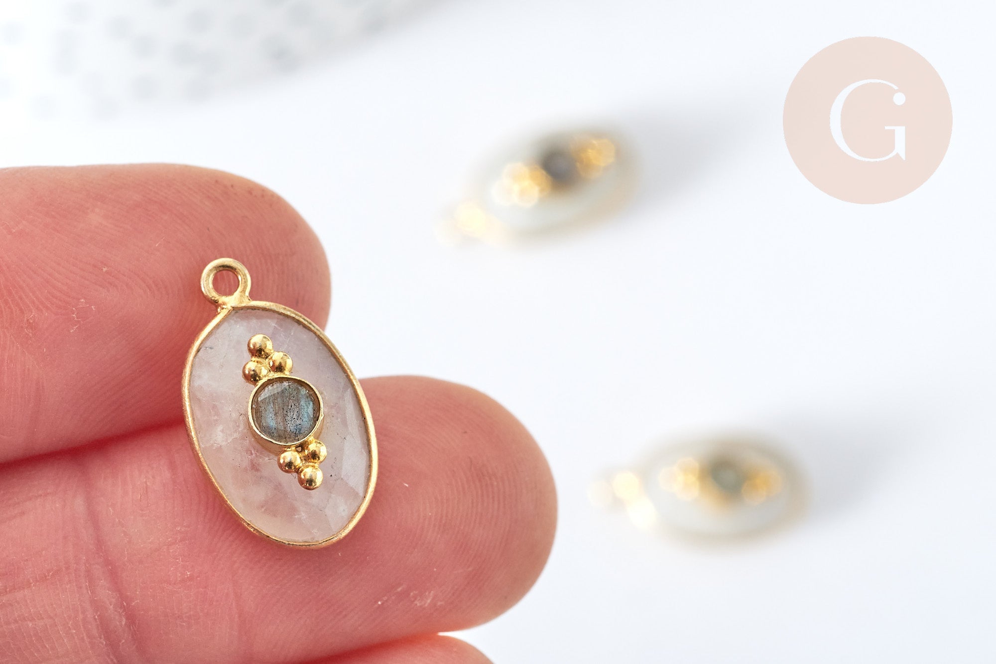 We adopt this lovely natural moonstone amulet pendant to create jewelry in the natural stone trend. It is decorated with a small labradorite cabochon which gives it a trendy and original appearance.