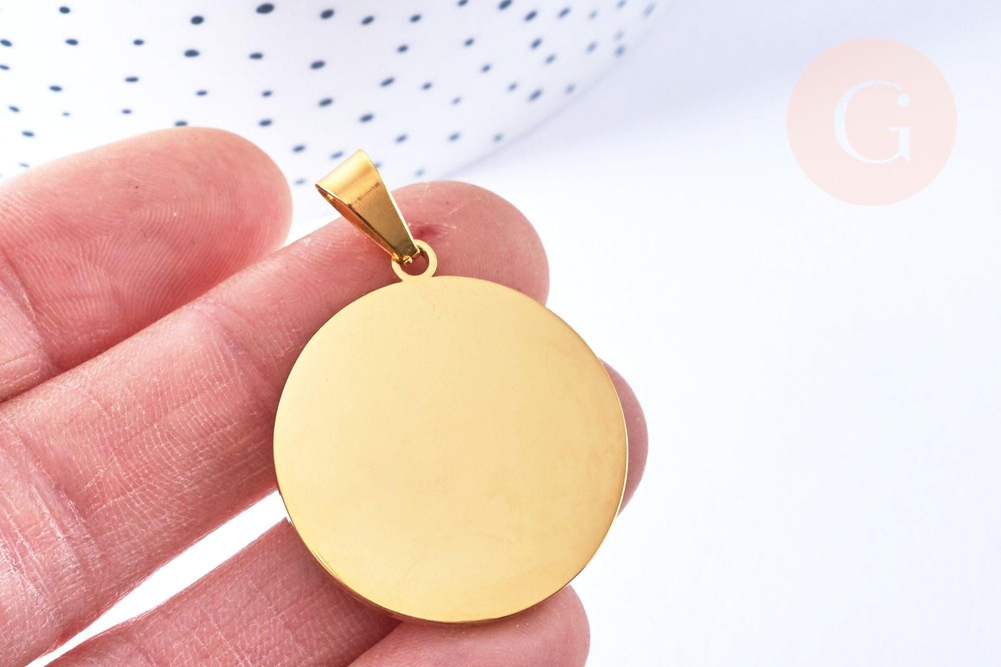 A round-shaped stainless steel gold-plated pendant . A gold-plated pendant to use for your personalized creations, to be engraved for an occasion.