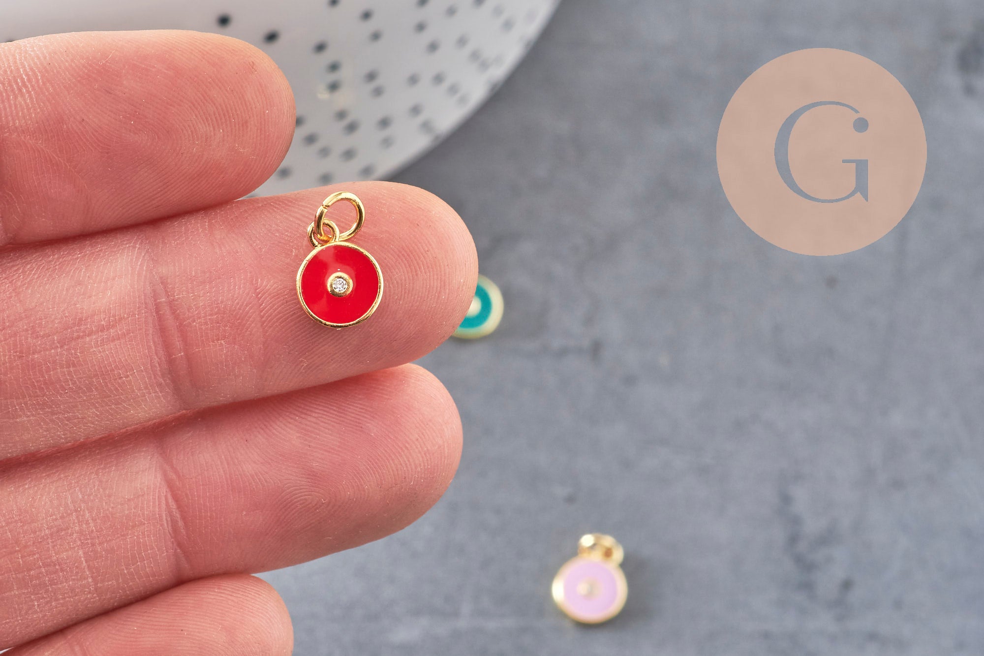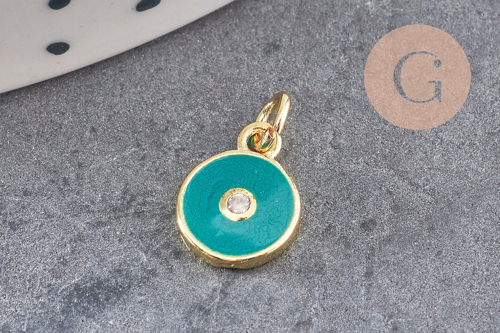 This small round pendant in 18K gold-plated brass is adorned with a sparkling white zircon in the center and enhanced with colorful enamel . Perfect for adding a touch of finesse and shine to your DIY jewelry, it will easily slip into a minimalist necklace, a charm bracelet or even a pair of asymmetrical earrings.