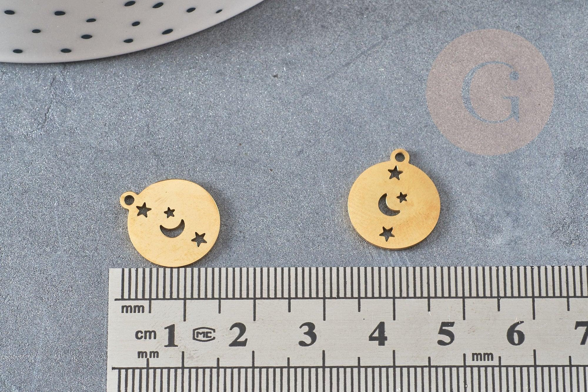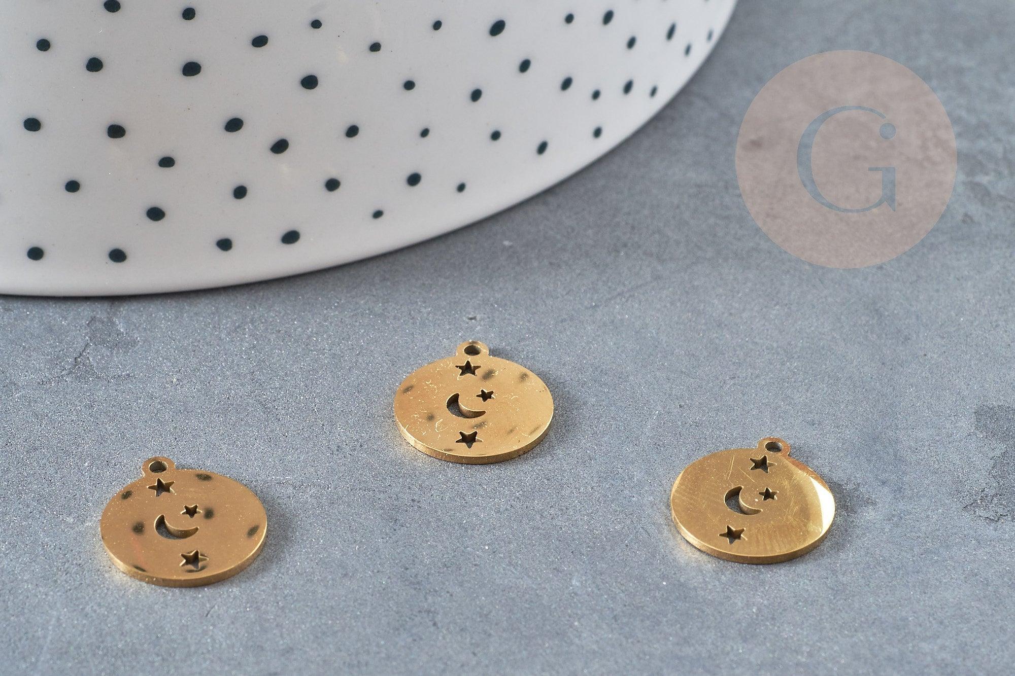 Pendentif rond lune et étoiles acier doré 15.5mm, breloque doré, acier inoxydable doré, pendentif sans nickel, x1 G6145