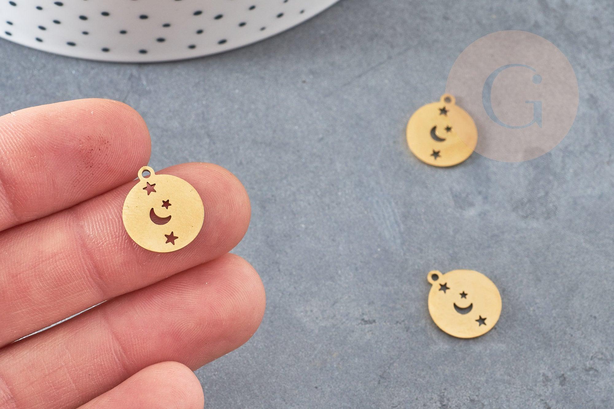 Round moon and stars pendant in gold-plated steel 15.5mm, gold-plated charm, gold-plated stainless steel, nickel-free pendant, x1 G6145