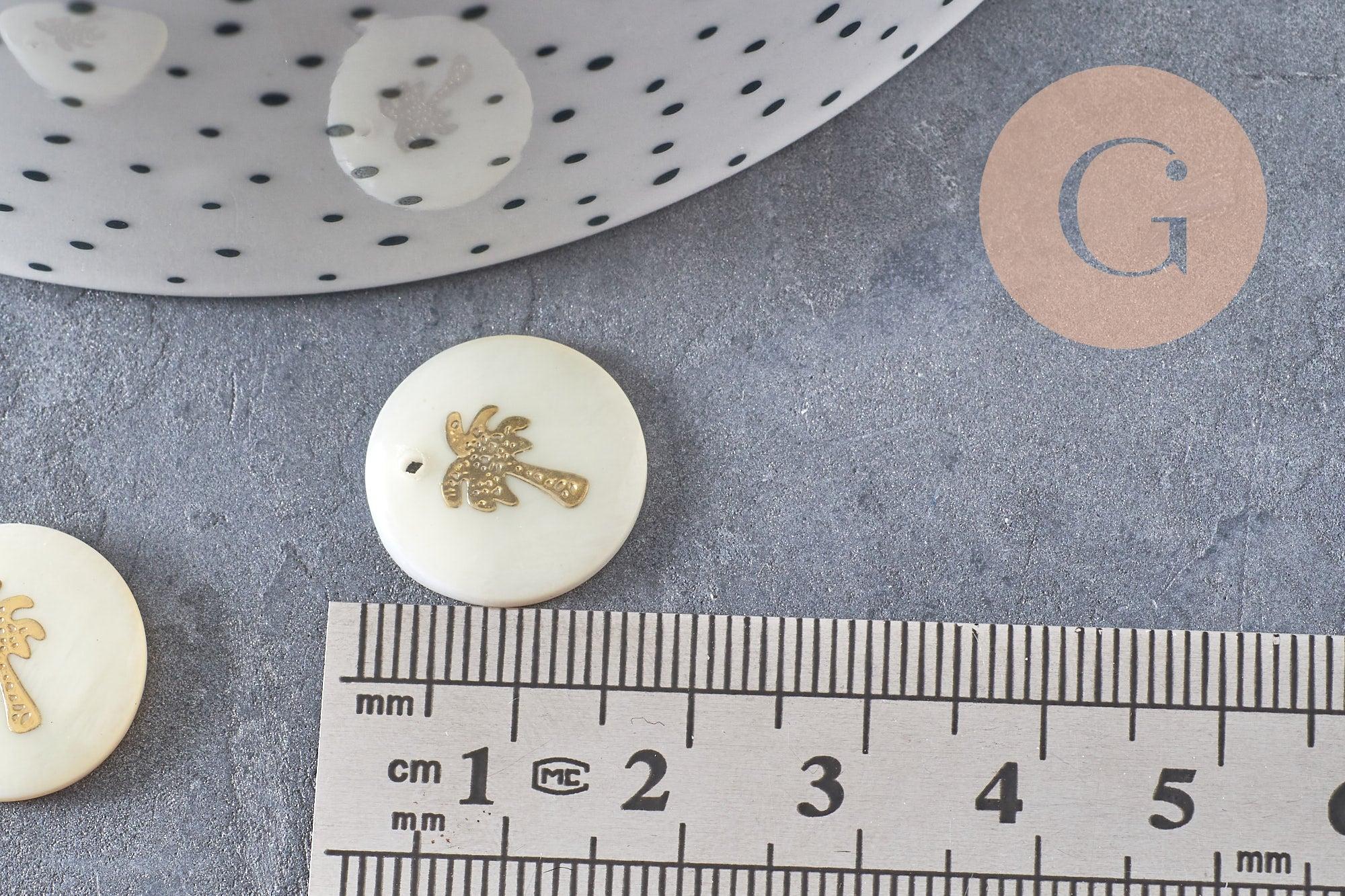 Round connector pendant in white mother-of-pearl with a golden motif of a palm tree.
