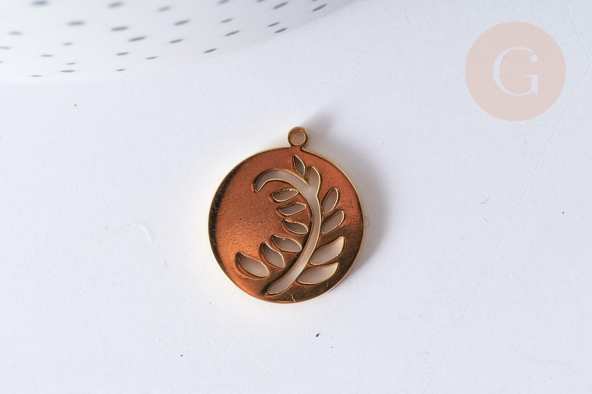 This flat round pendant with an openwork leaf is made of 201 gold-plated stainless steel . Steel is hypoallergenic and very durable.