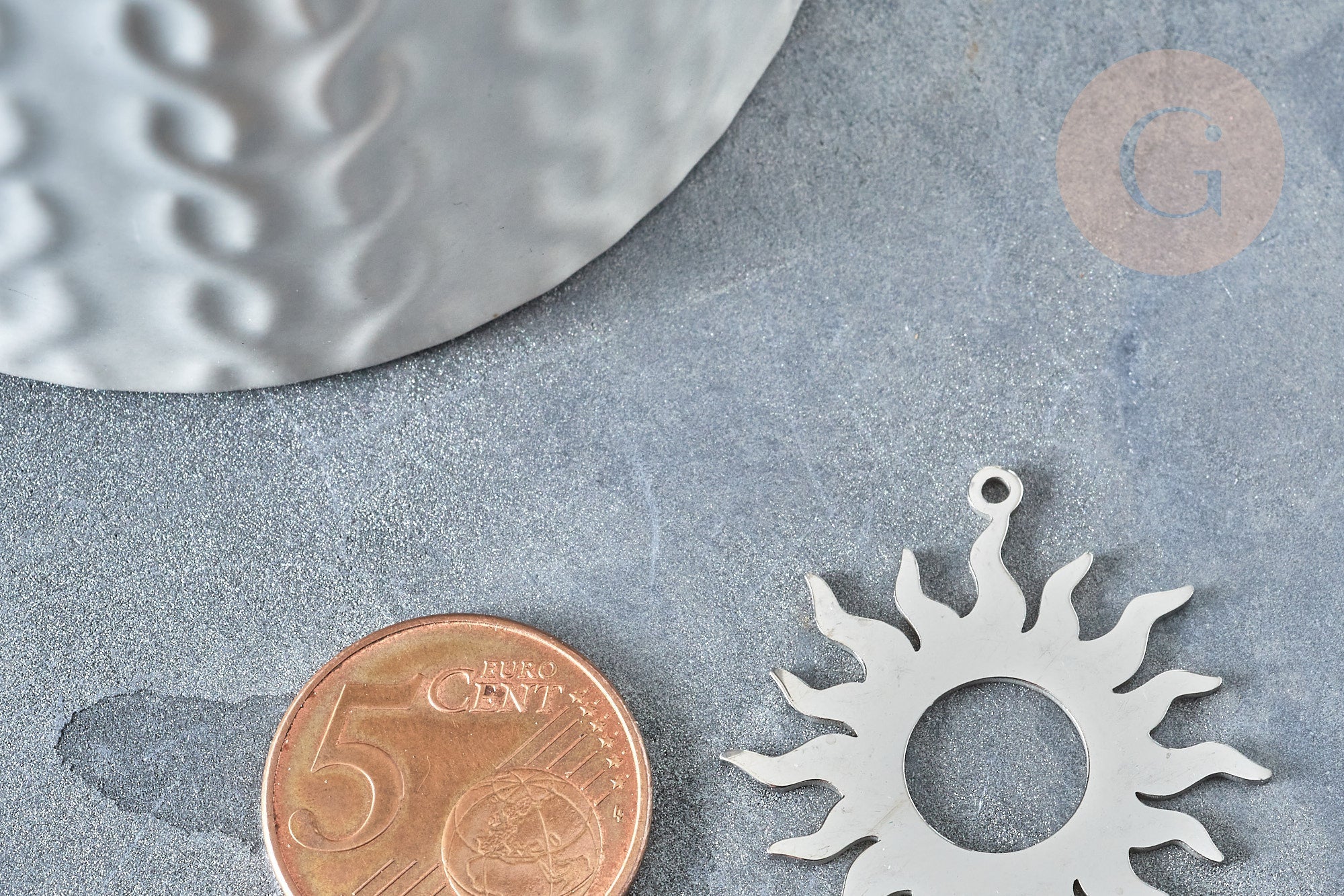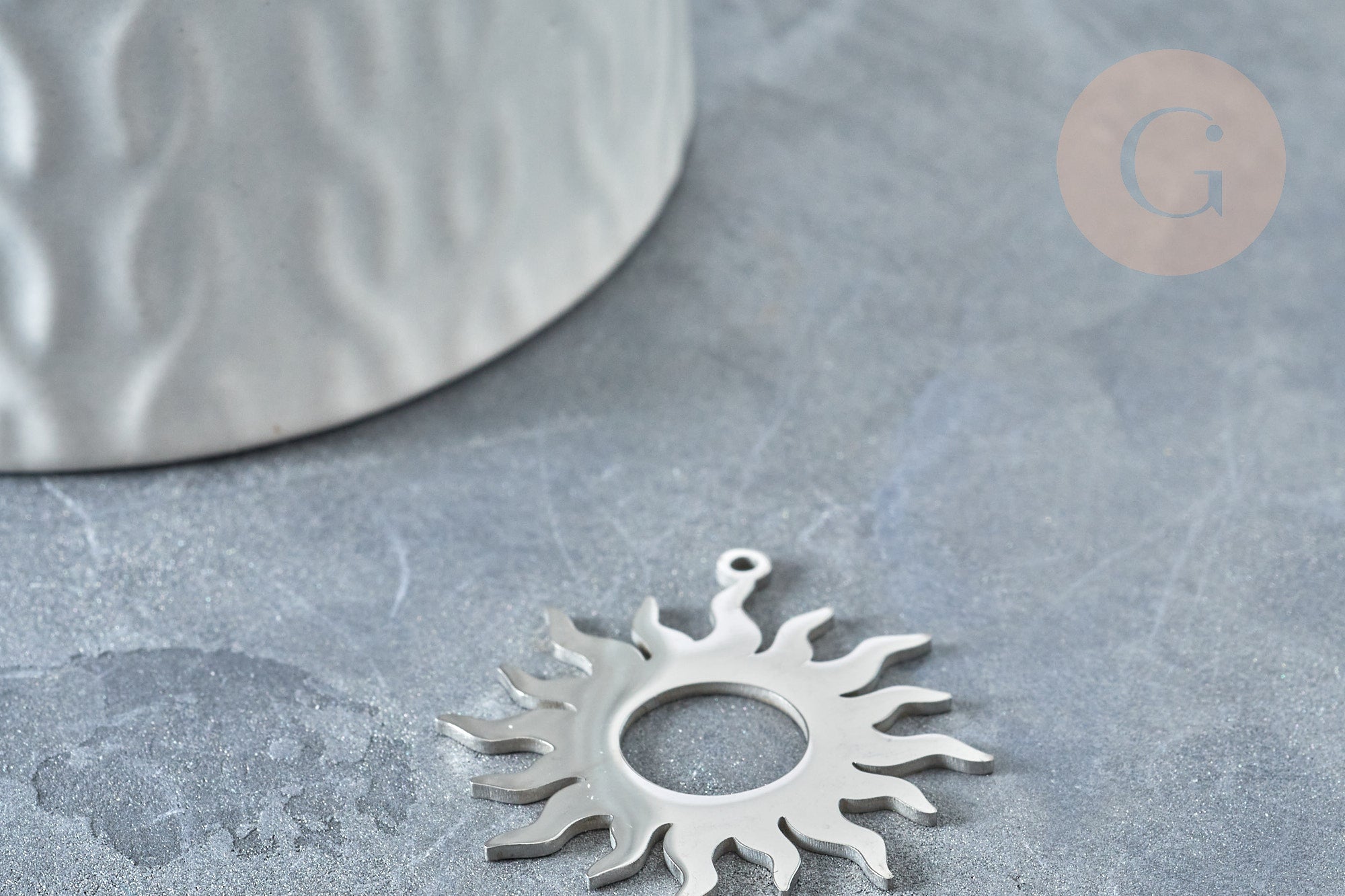A sun pendant in silver-plated gold-plated steel . An adorable gold pendant to use in all your DIY jewelry creations.