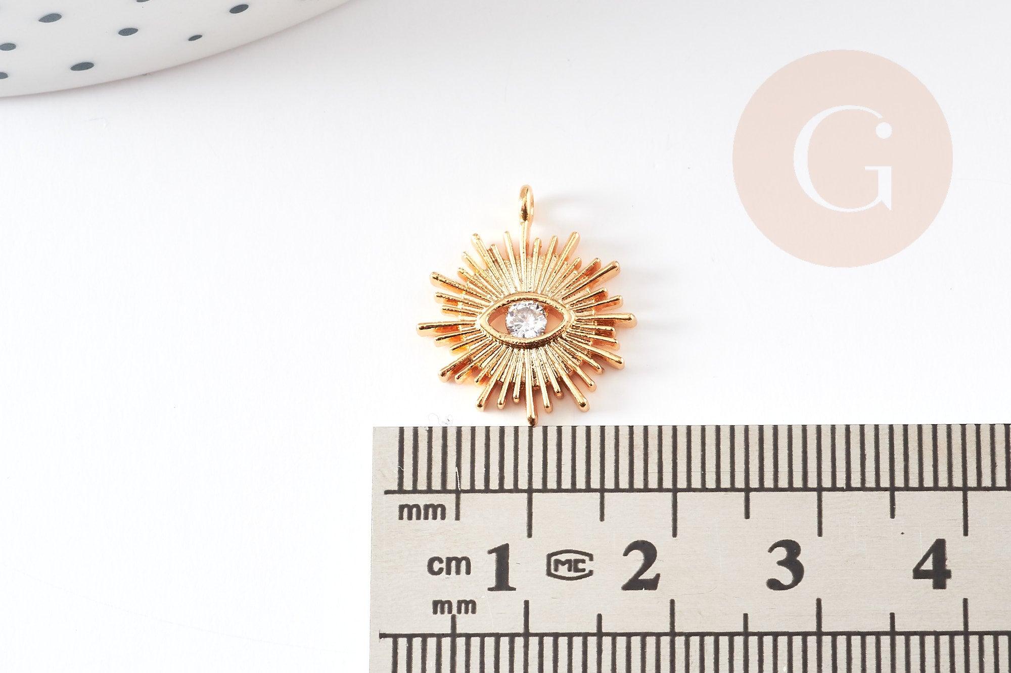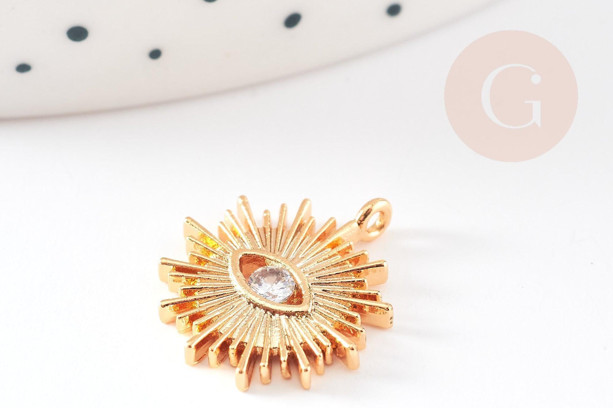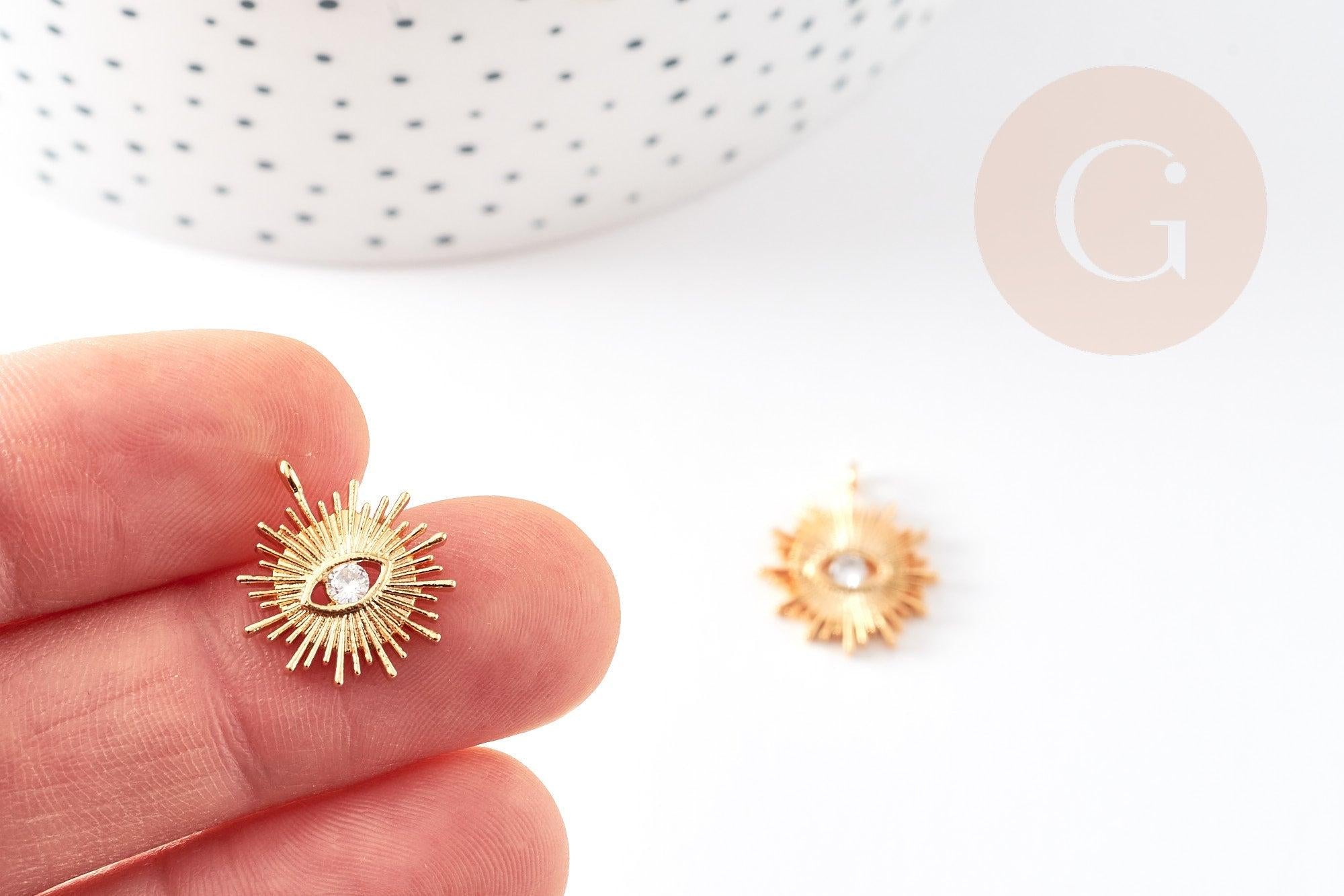Add a sunny and mystical touch to your creations with this golden zamac Sun Eye pendant , adorned with a sparkling crystal rhinestone. Its symbolic design and beautiful shiny finish make it a key element for elegant, protective and luminous jewelry.