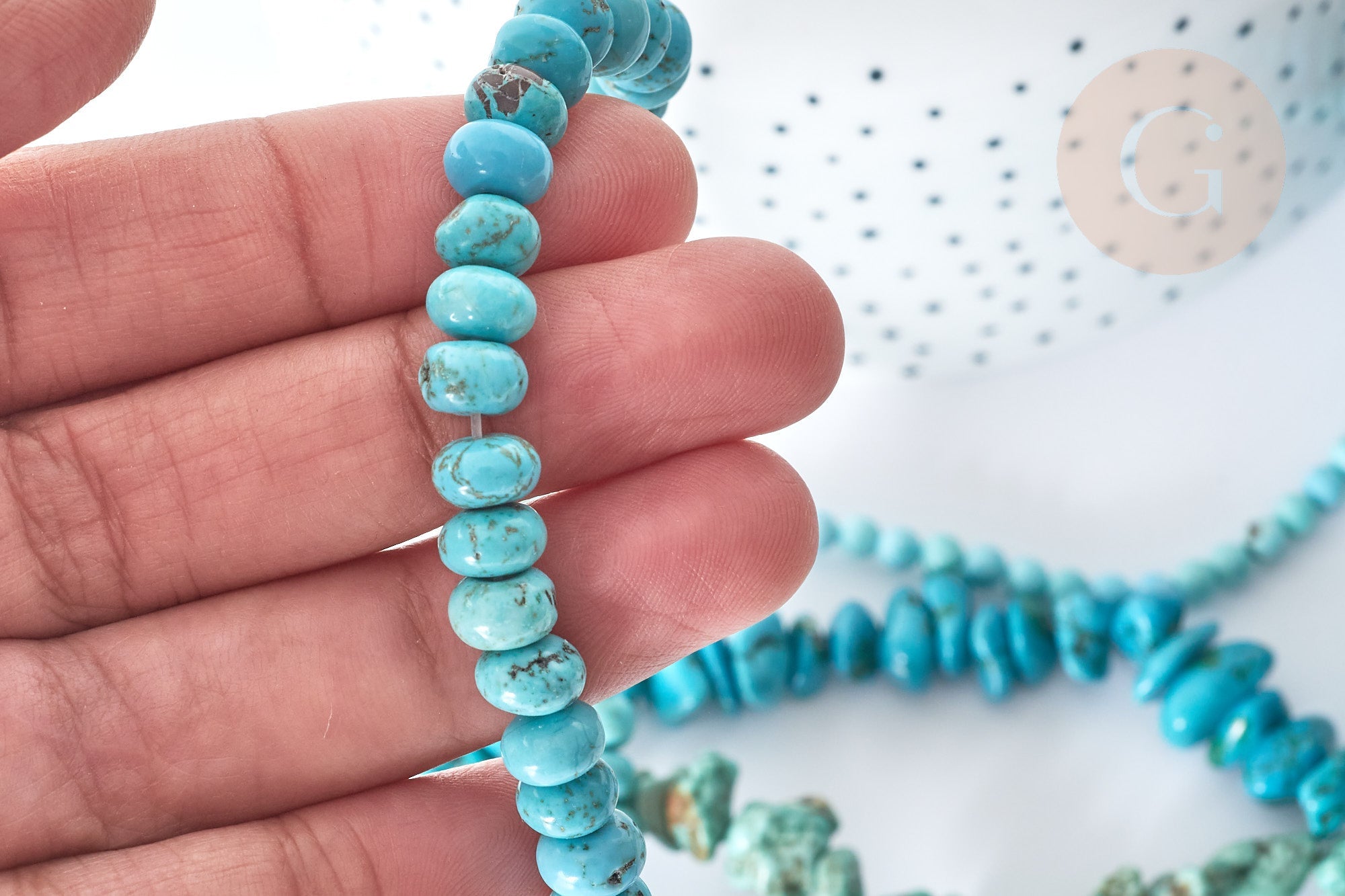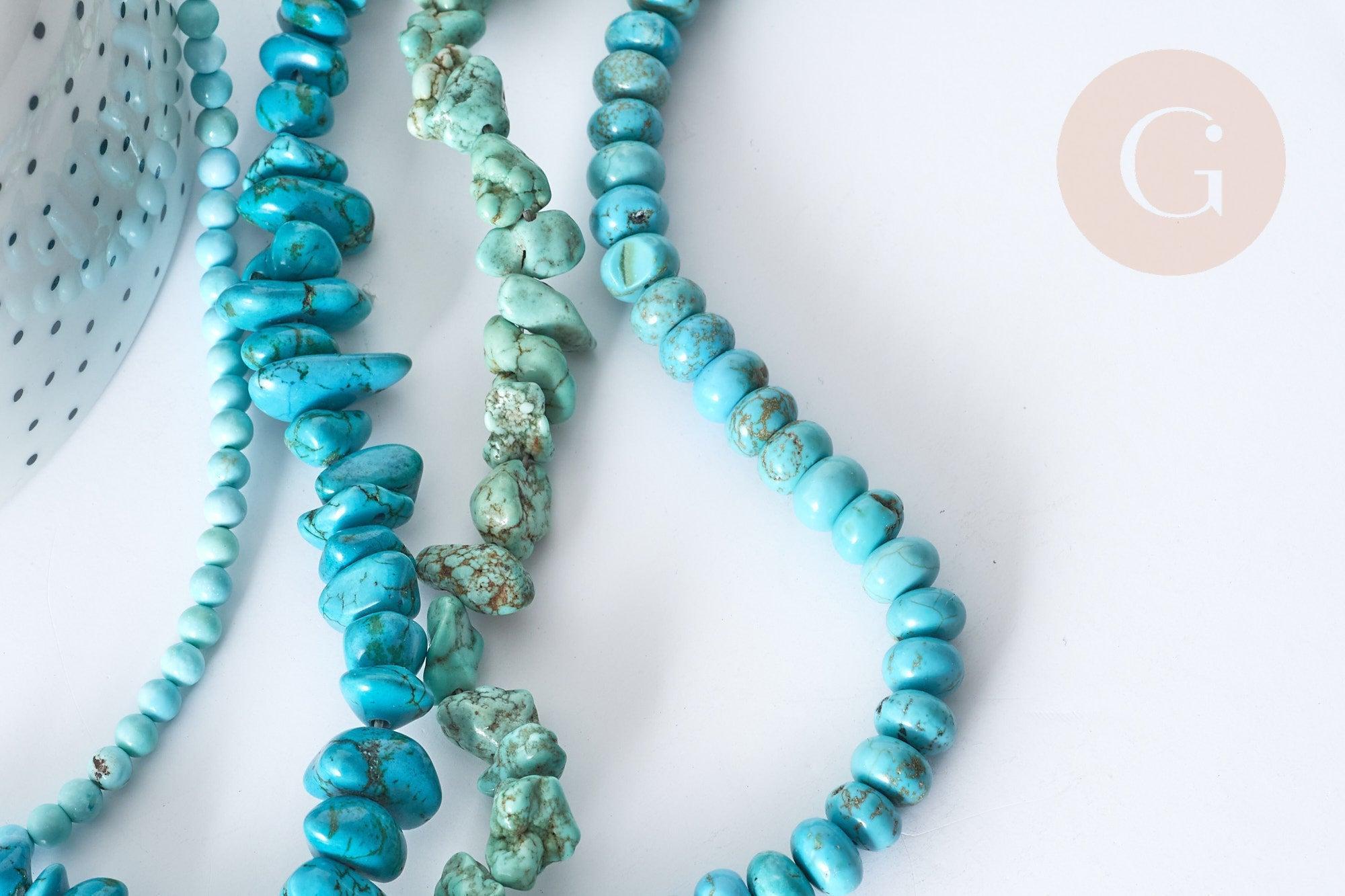 These natural tinted howlite jewelry beads will allow you to create unique and original jewelry. These are turquoise blue and the shapes available are nuggets, washers or round beads