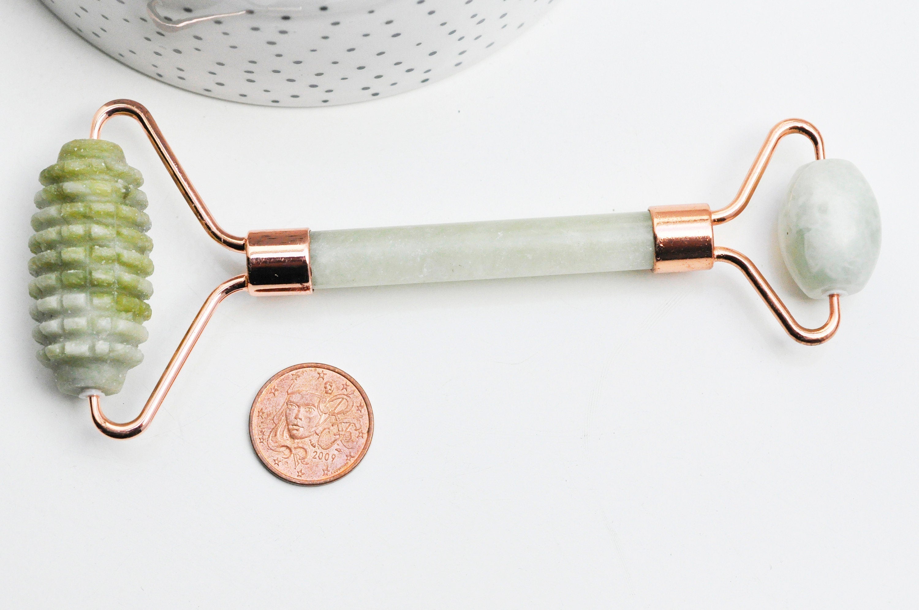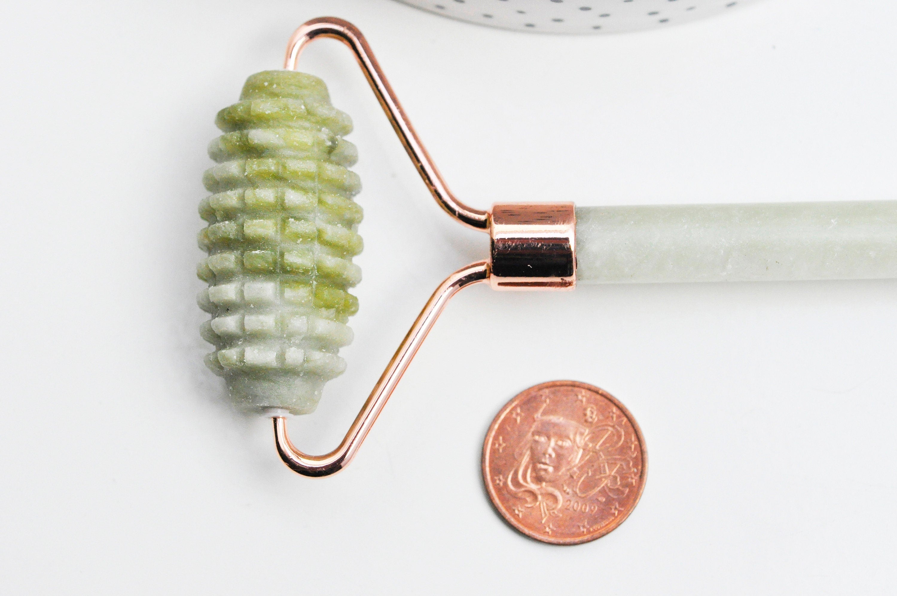 A natural jade massage roller that will stimulate tissues, promote blood circulation and lymphatic drainage.