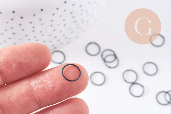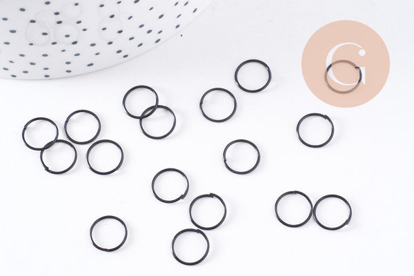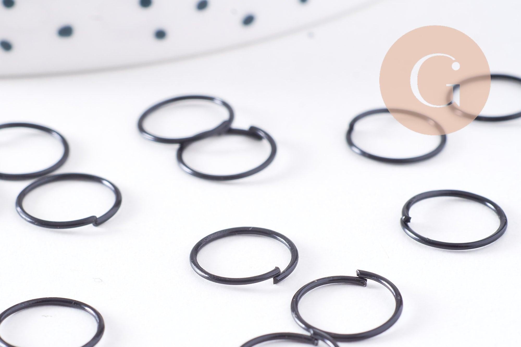 Un juego de 20 anillas abiertas de hierro negro intenso. Estas anillas son esenciales para todas tus creaciones de bisutería. Su acabado negro les dará un toque elegante y moderno.