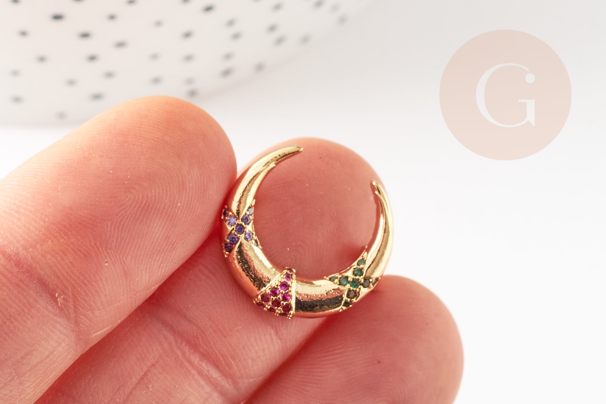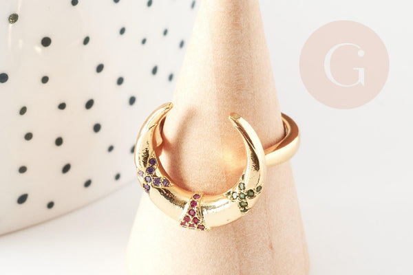 Un anillo muy bonito de latón bañado en oro decorado con una gran luna decorada con circonitas multicolores.