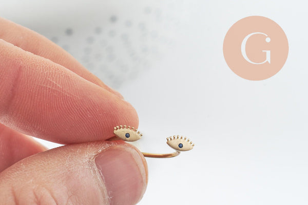 Un muy bonito porta anillos ajustable en latón en bruto compuesto por una mano de 2 ojos con incrustaciones de un cristal azul en cada uno de ellos.