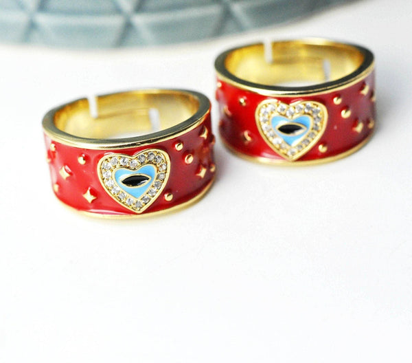 Anillo ajustable de latón bañado en oro con esmalte rojo y ojo protector, creación de joyas, anillo de mujer, regalo de cumpleaños, 18mm, unidad Precioso porta anillos de latón esmaltado bañado en oro, decorado con un ojo protector en forma...