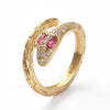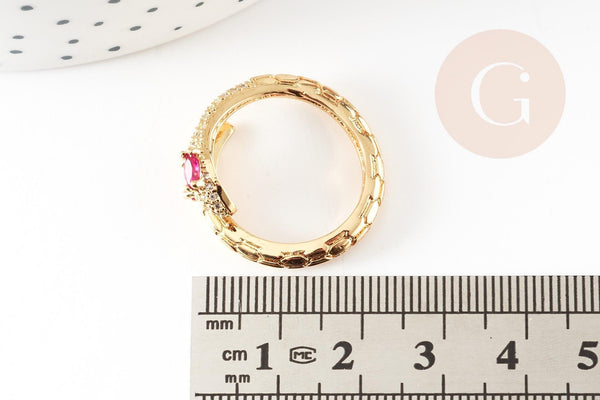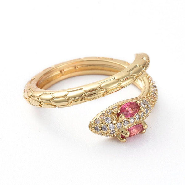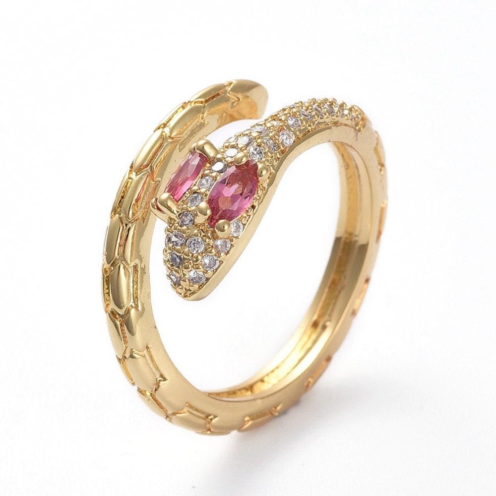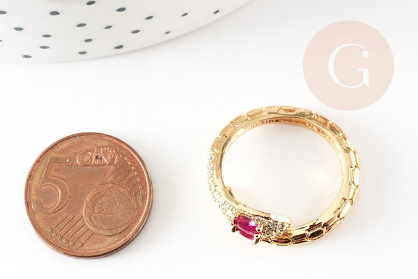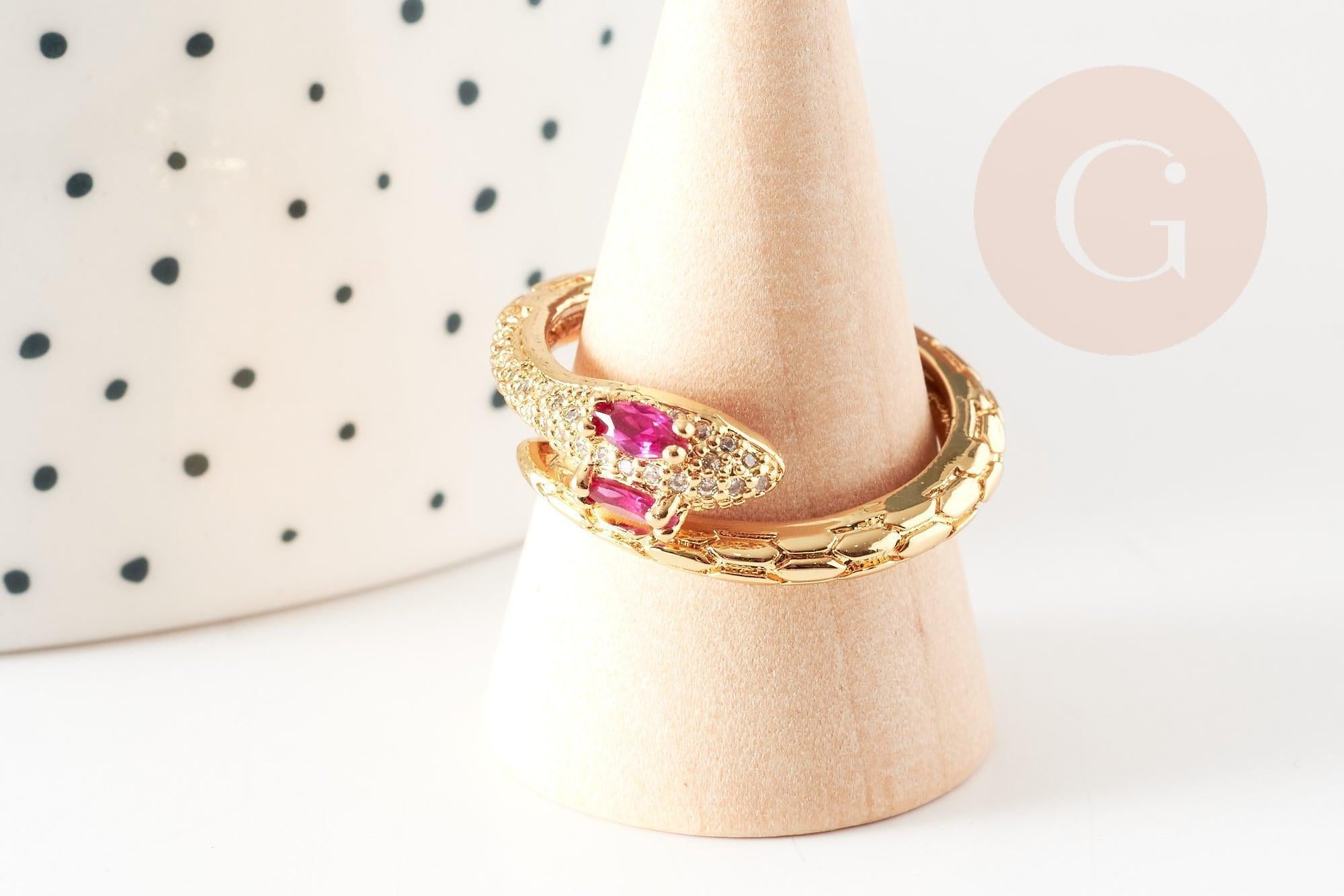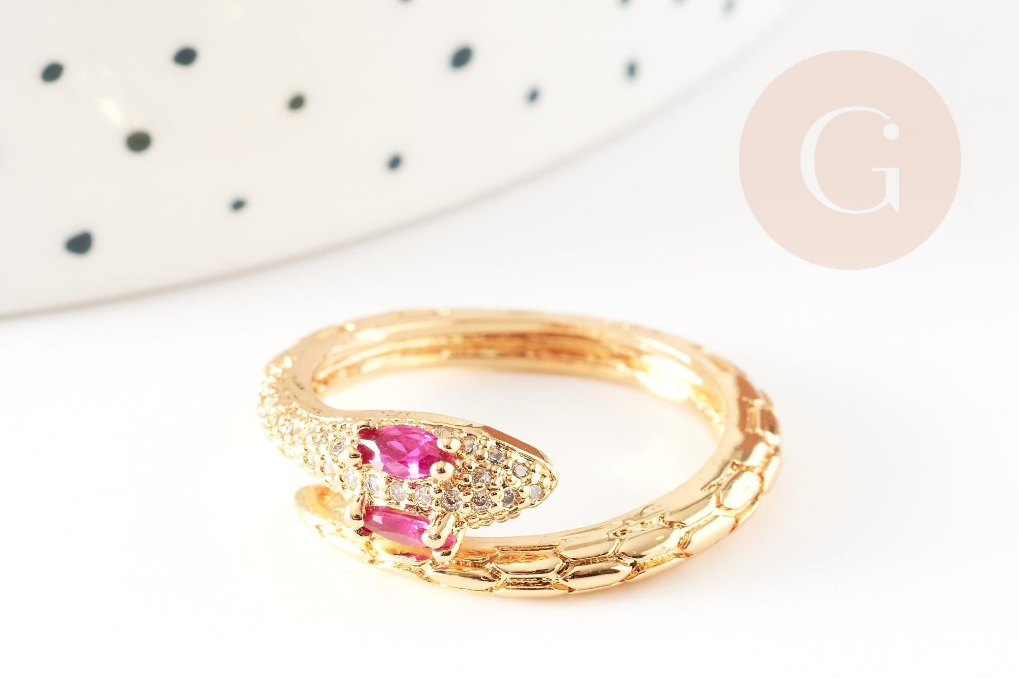 Añade un toque místico y audaz a tus creaciones con este anillo ajustable de latón bañado en oro , que representa una serpiente con circonitas rojas y blancas . Esta joya simbólica seduce con su elegante diseño y su brillo refinado.