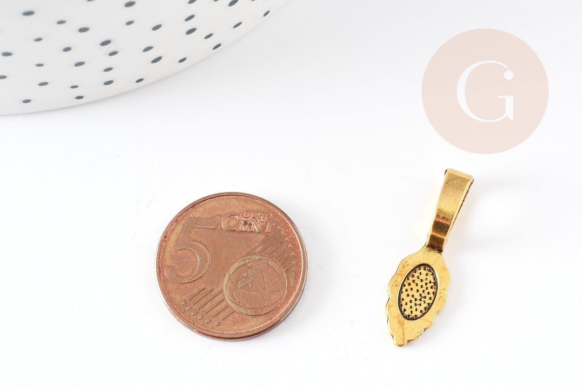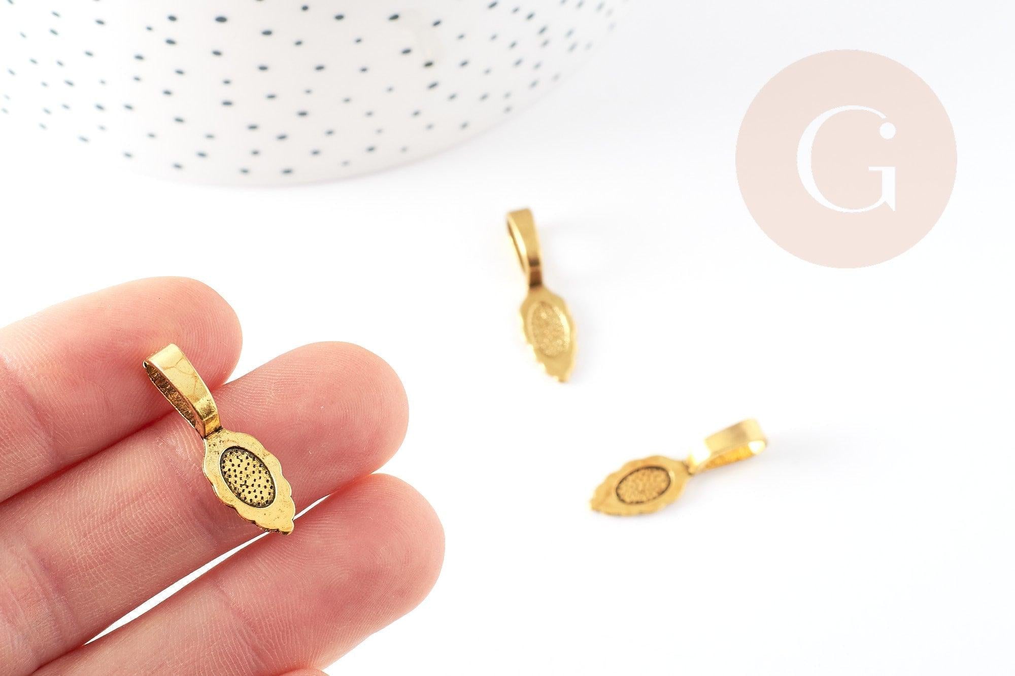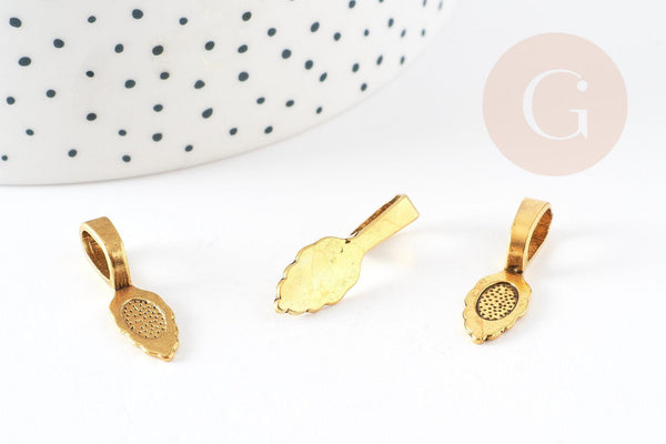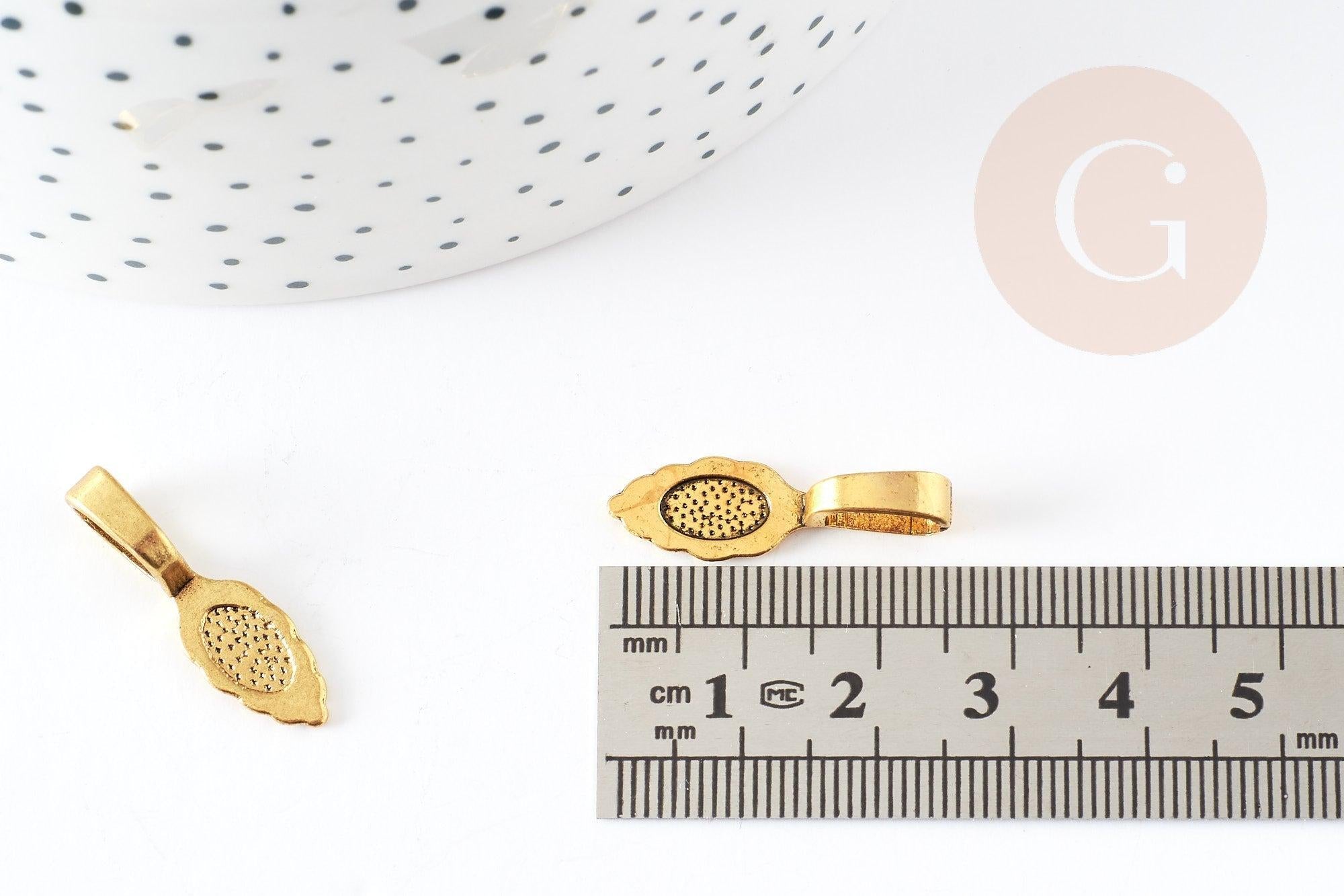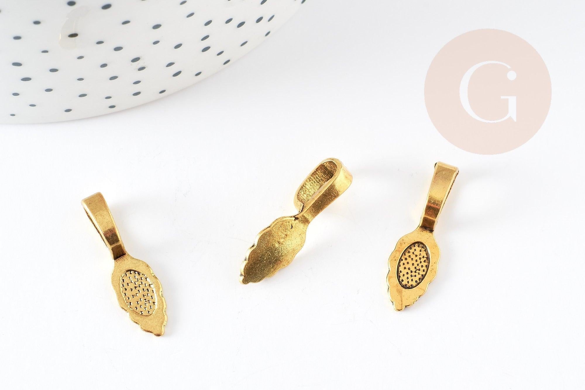 Fianza (de metal dorado) para pegar, su acabado es perfecto gracias a su bonito diseño que dejará ver un accesorio en forma de hoja en la parte posterior de tus creaciones.