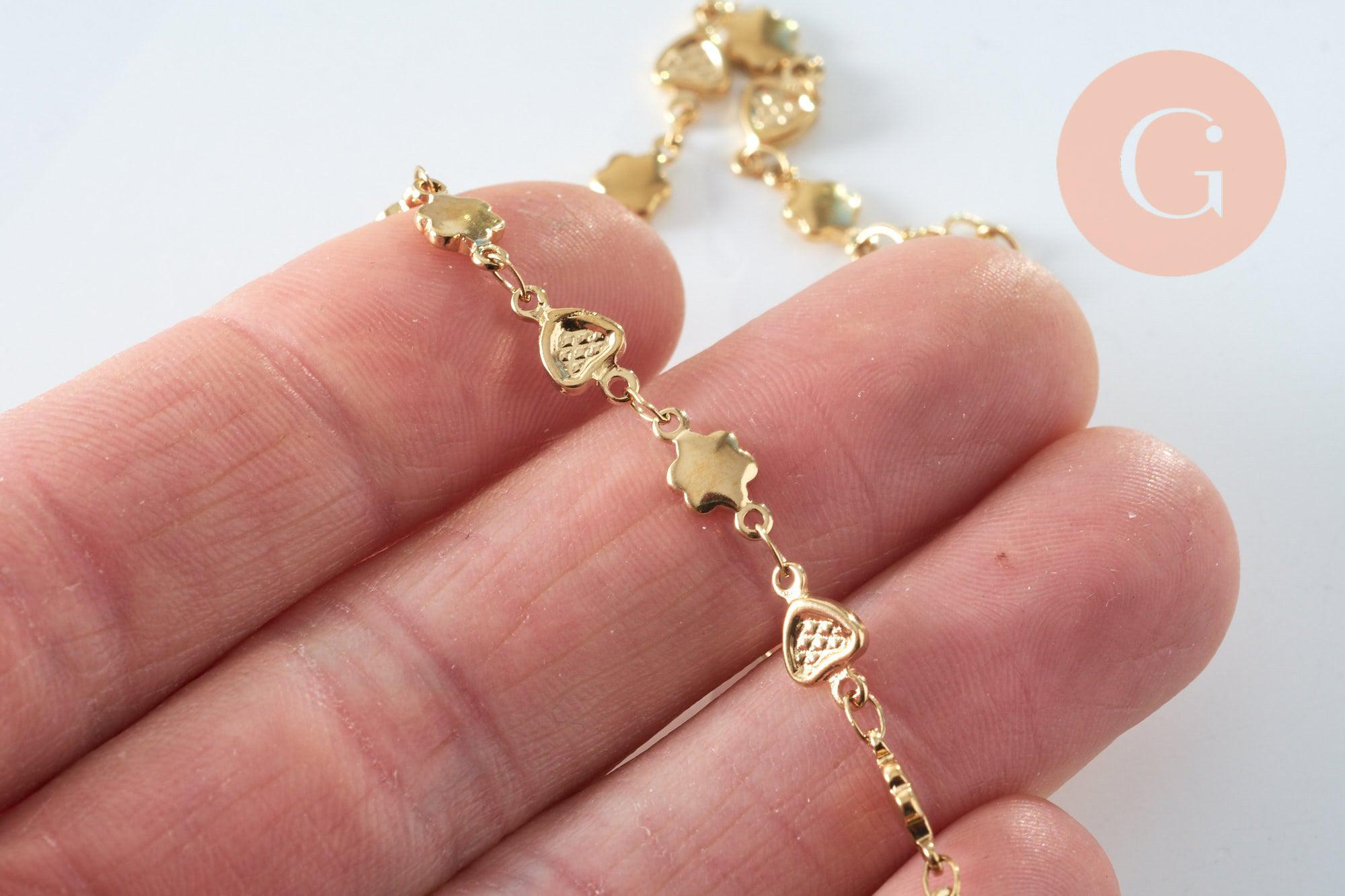 Adopta esta pulsera hecha de eslabones de flores y corazones en acero bañado en oro de 14k. Está equipado con una cadena de extensión lo suficientemente larga como para adaptarse a todos los tamaños de muñeca o incluso usarla como cadena de tobillo.