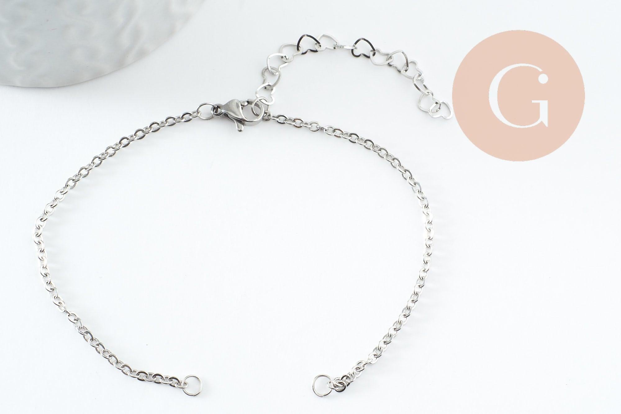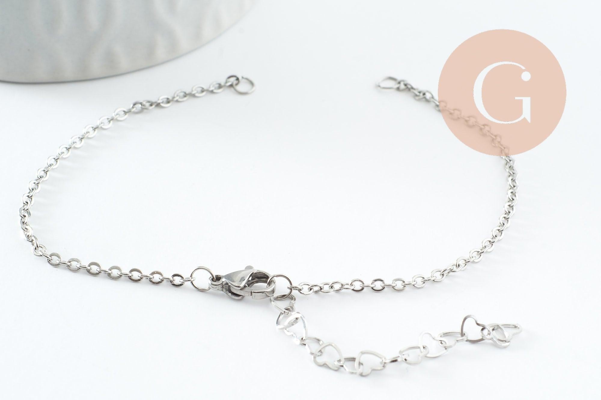 Pulsera de cadena de eslabones base de acero inoxidable 304 con acabado de platino, anillos y cadena de extensión de corazón de 18 mm, x1 (G9499)
