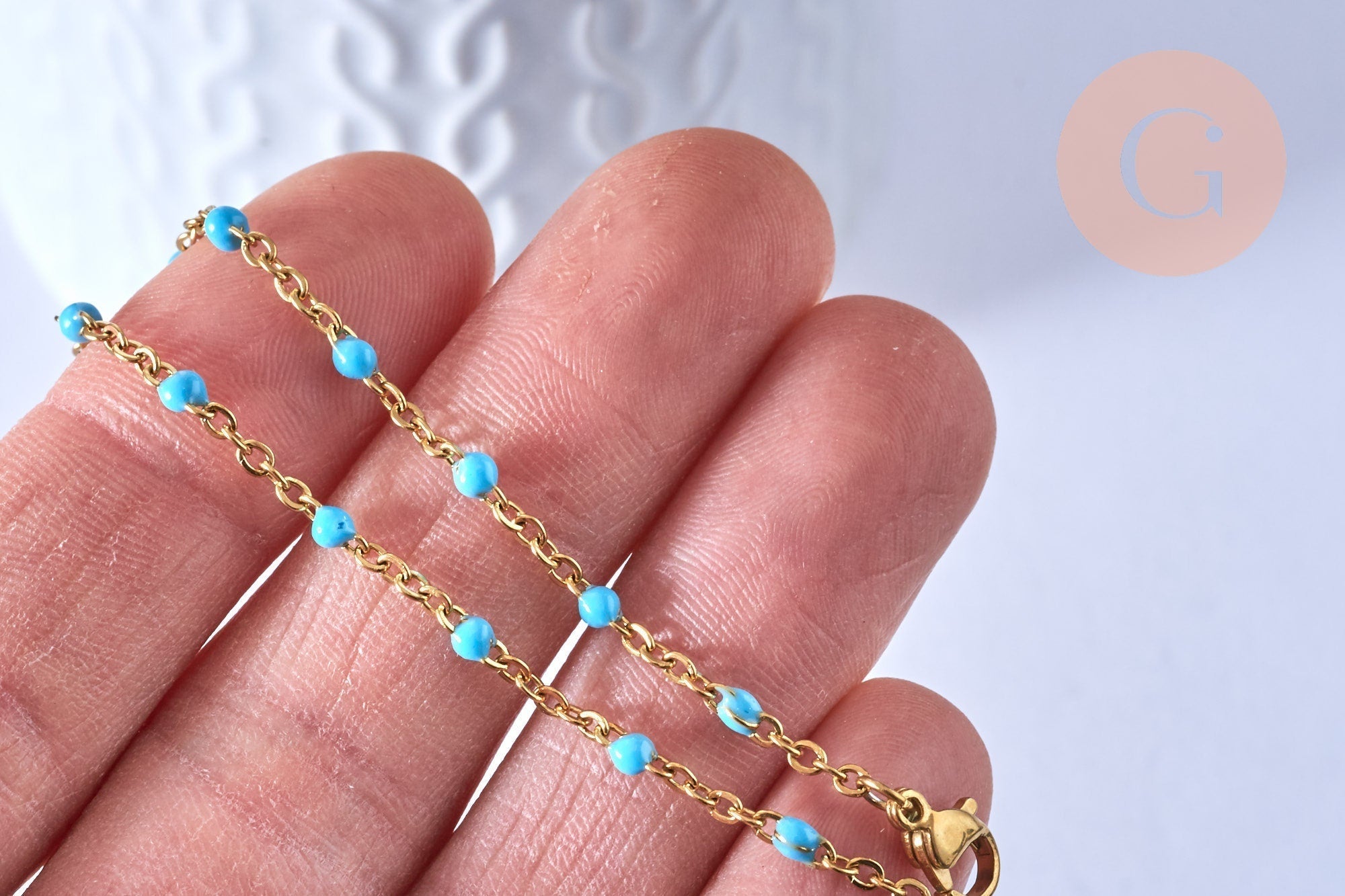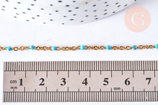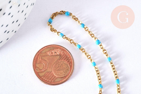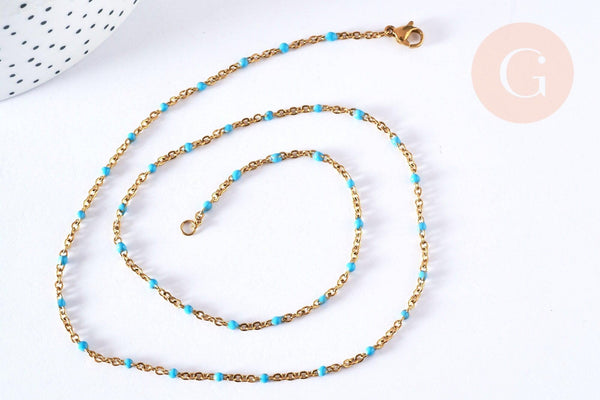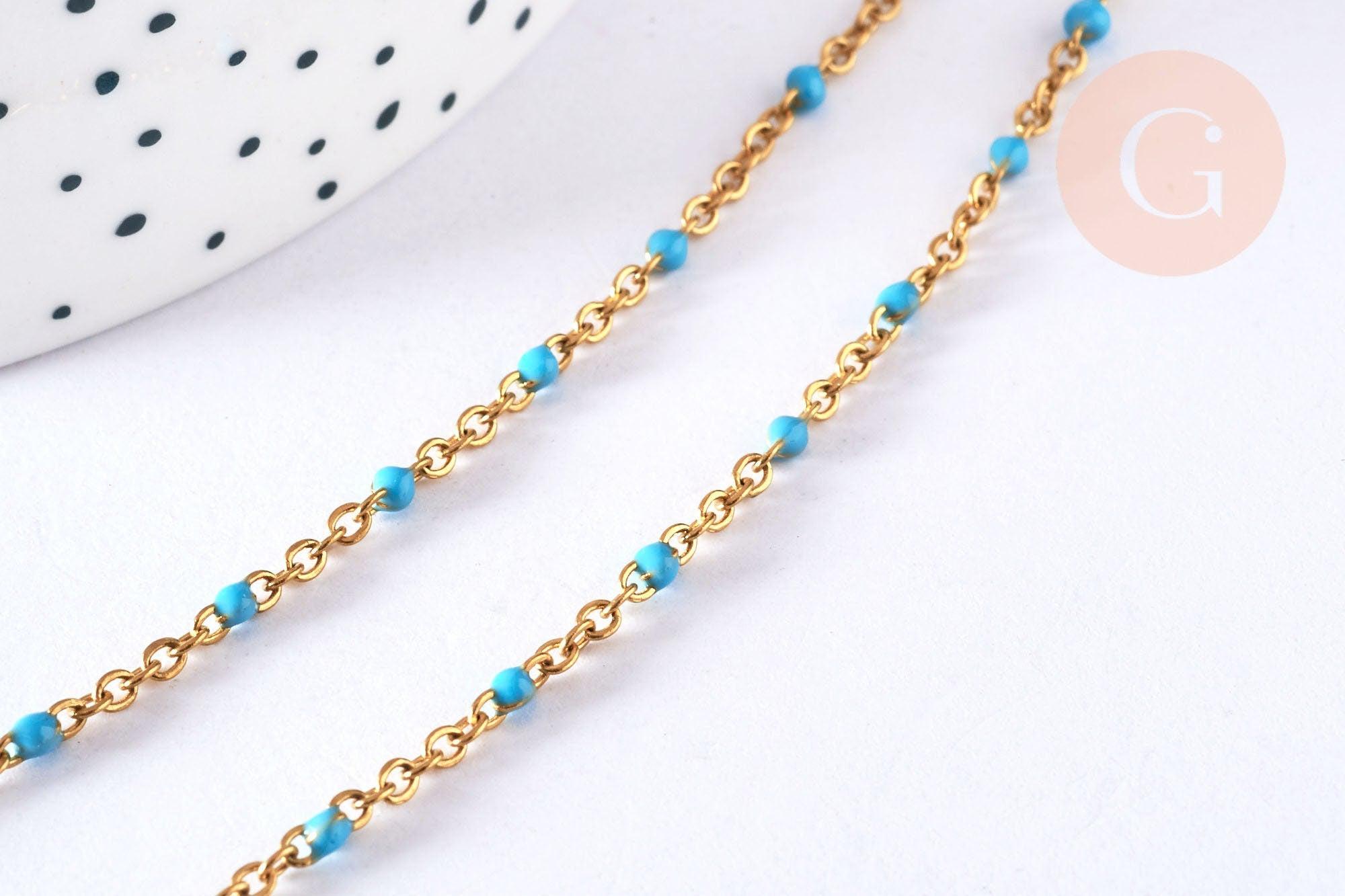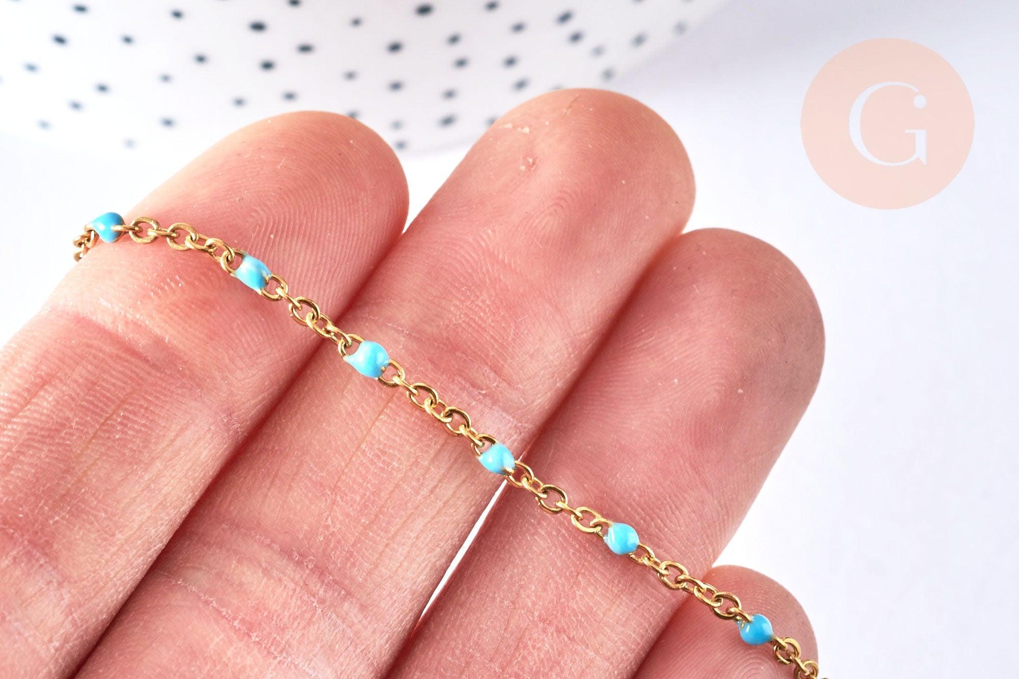Aporta una nota fresca y colorida a tus creaciones con esta pulsera de acero inoxidable bañada en oro de 14K , adornada con una fina cadena de resina turquesa . Listo para usar, permite crear fácilmente joyas DIY modernas y luminosas.