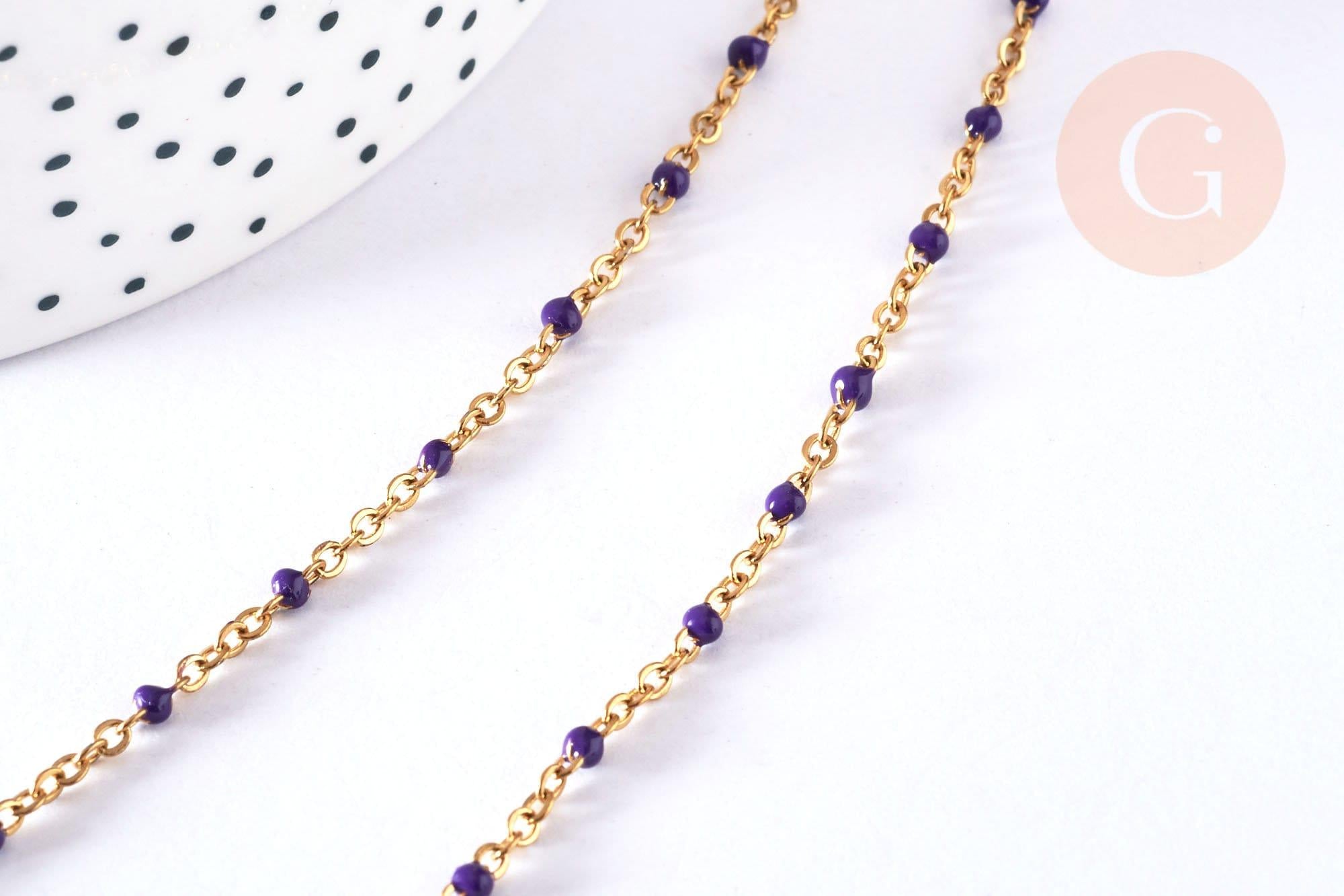 Aporta un toque de misterio y elegancia a tus creaciones DIY con esta pulsera o collar de acero inoxidable bañado en oro de 14 quilates , revestido de resina de color morado intenso . Su color vibrante combina maravillosamente con el oro para una apariencia elegante y moderna.
