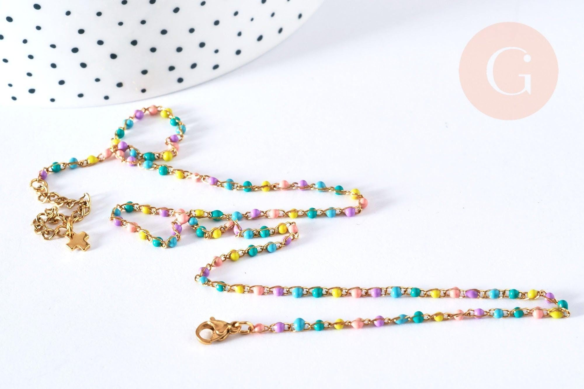 Para realizar rápidamente tus joyas, Gingerily te propone una pulsera/cadena en fino acero bañado en oro de 14 quilates con cuentas de resina multicolor.