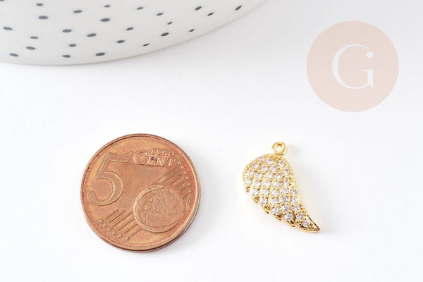 Para crear magníficos collares, pendientes y pulseras, adopte este colgante de ala, un pequeño colgante de la suerte de latón dorado, decorado con pequeñas circonitas blancas brillantes.