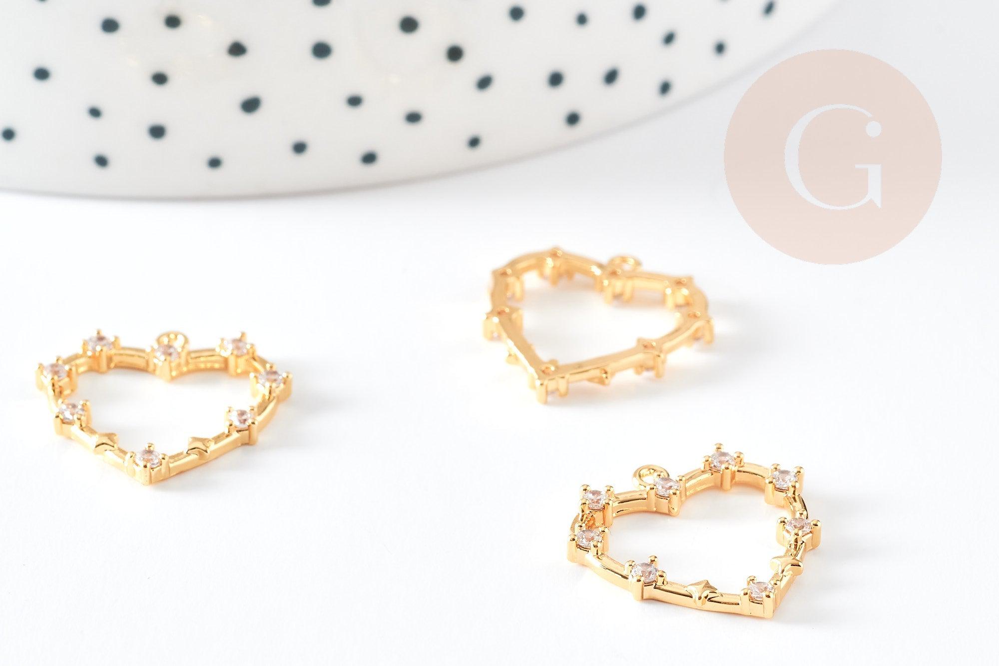 Para crear magníficos collares, pendientes y pulseras, adopte este lindo colgante en forma de corazón, pequeño amor, de latón dorado, decorado con circonitas de colores.