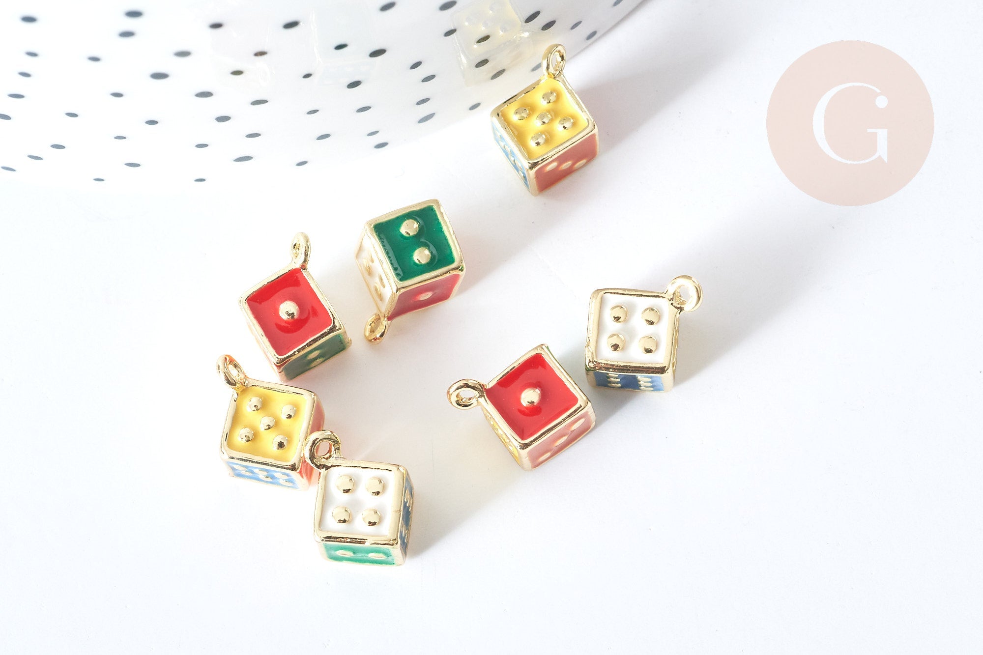 Charm dado dados de zamac dorado esmaltado de colores 13,5mm, creación de bisutería con temática juego de azar, x1 G8071