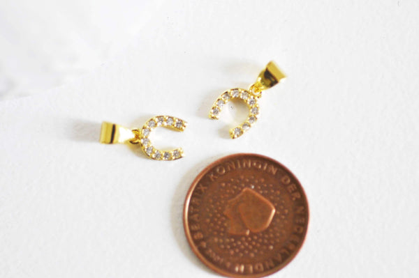 Para crear magníficos collares, pendientes y pulseras, adopte esta herradura, un pequeño colgante de la suerte de latón dorado, decorado con pequeñas circonitas blancas brillantes.
