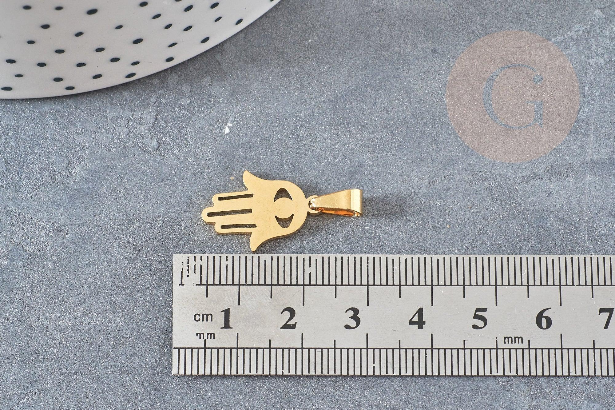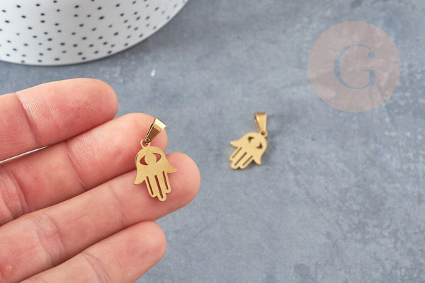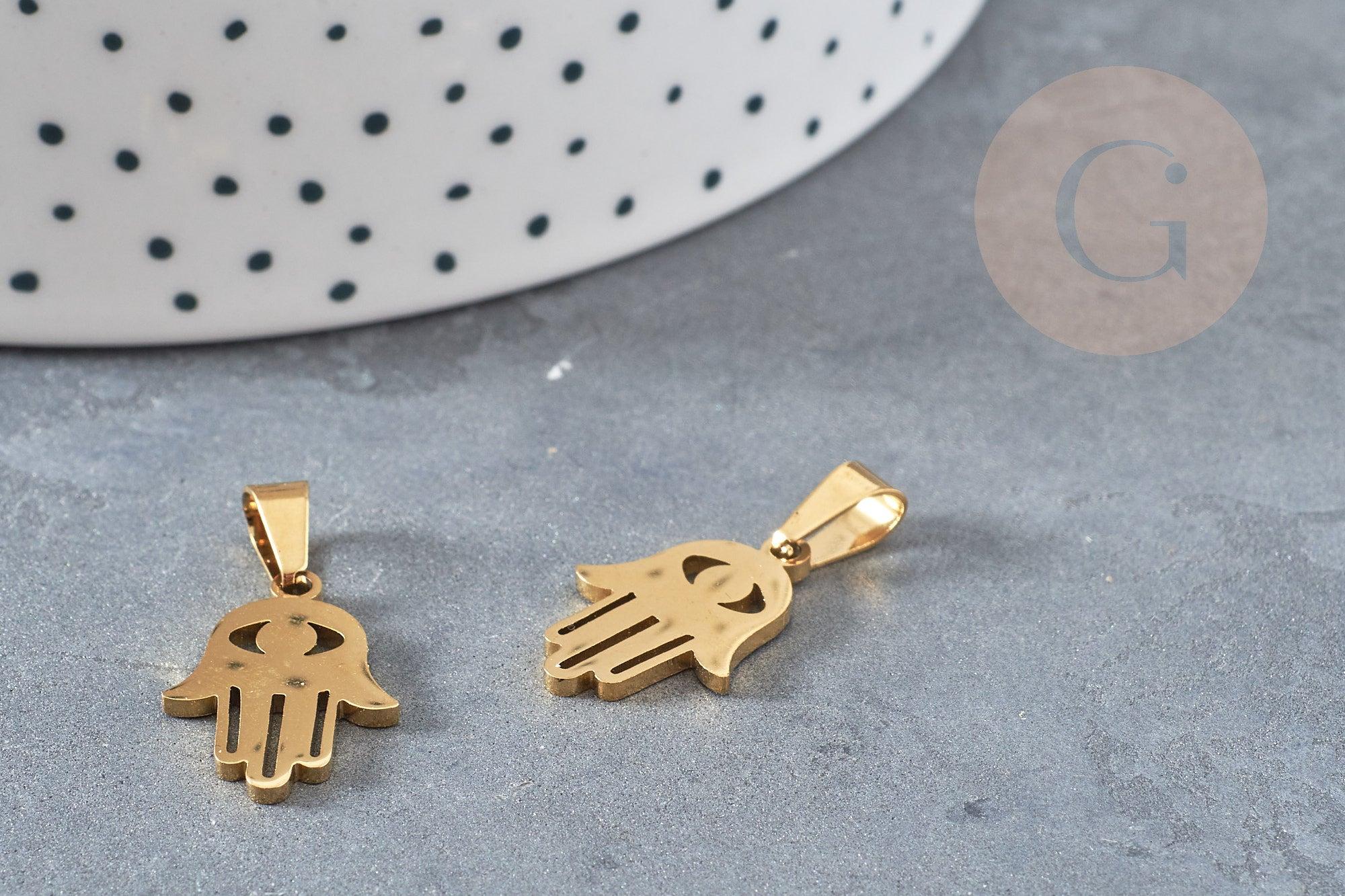Para realizar magníficos collares, pendientes y pulseras, adopta esta mano de fatma, un pequeño colgante religioso y amuleto de la buena suerte en acero inoxidable dorado.
