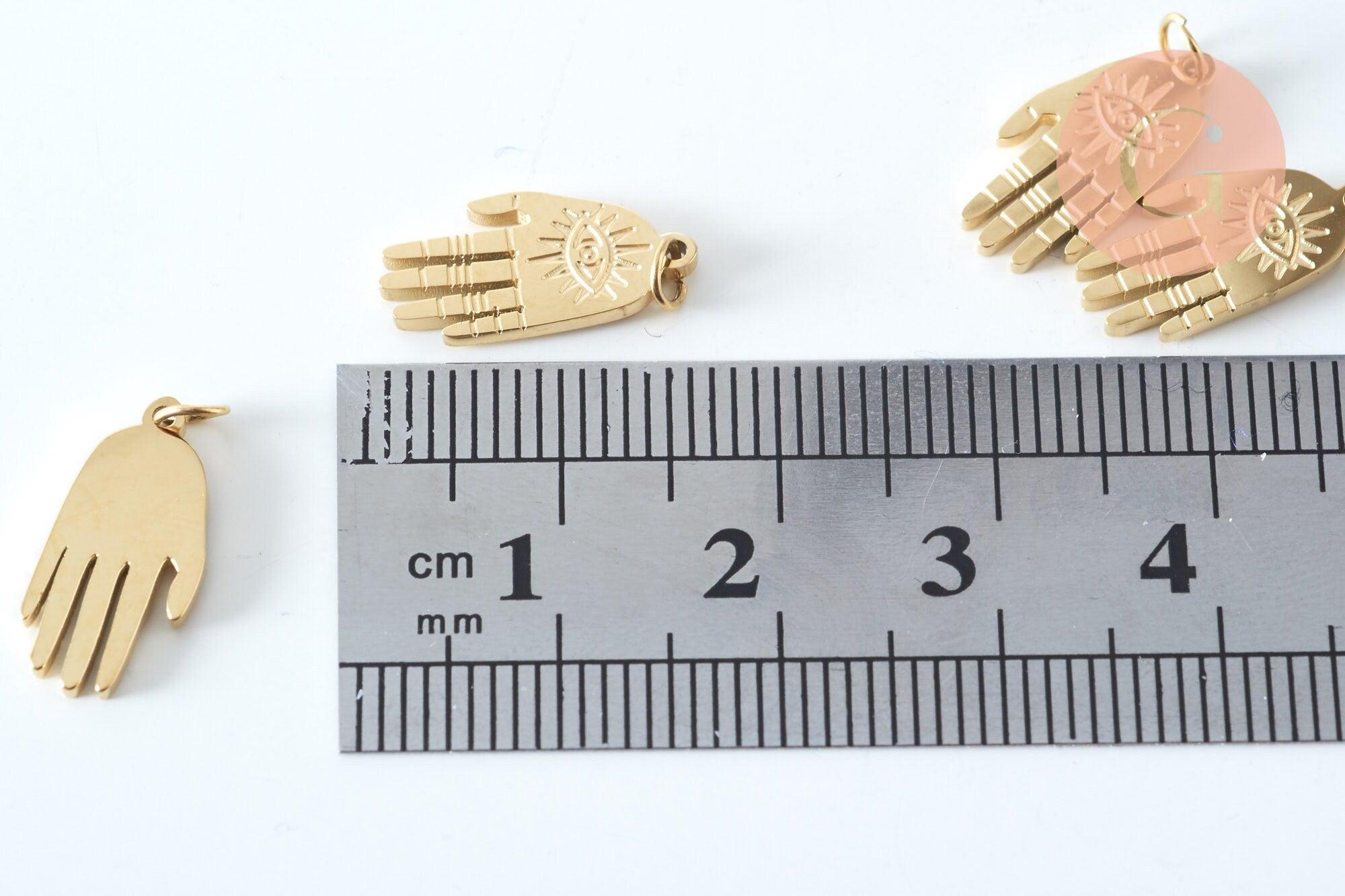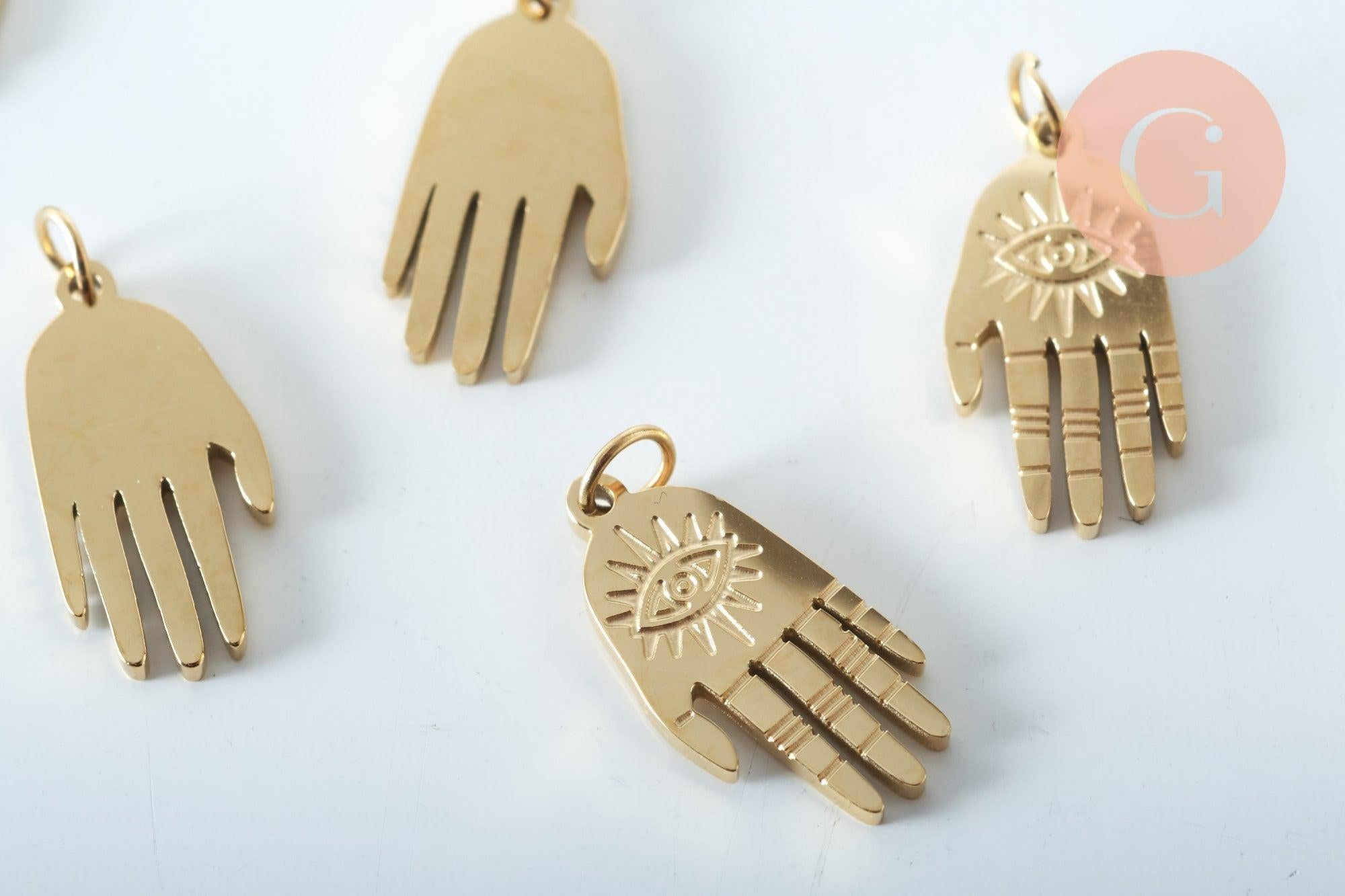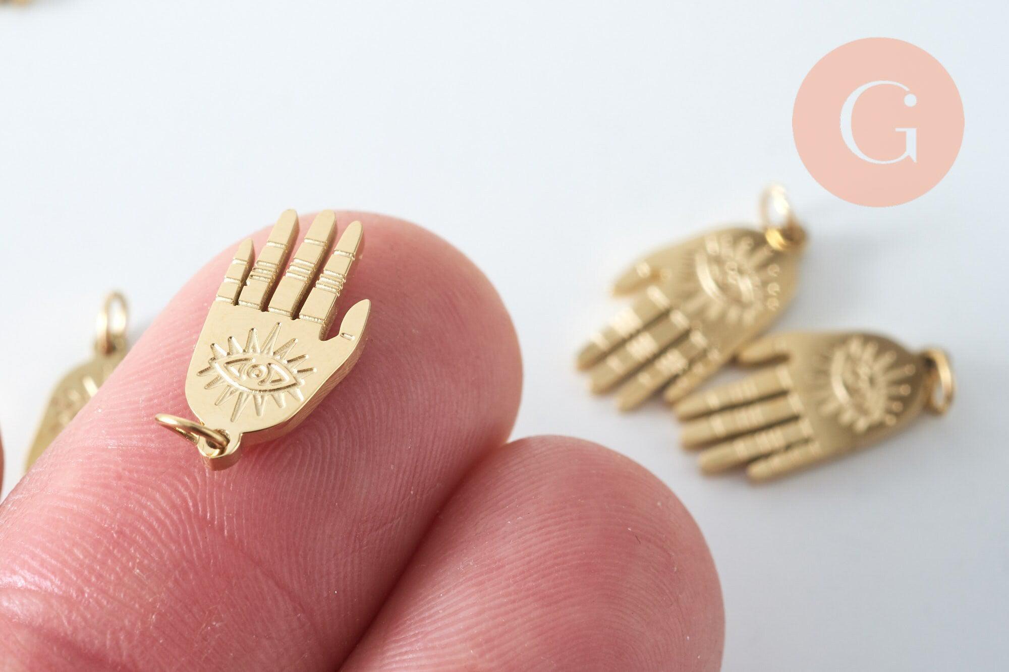 Para realizar magníficos collares, pendientes y pulseras, adopte esta mano de fatma grabada con un ojo protector, pequeño colgante de la suerte en acero inoxidable dorado.