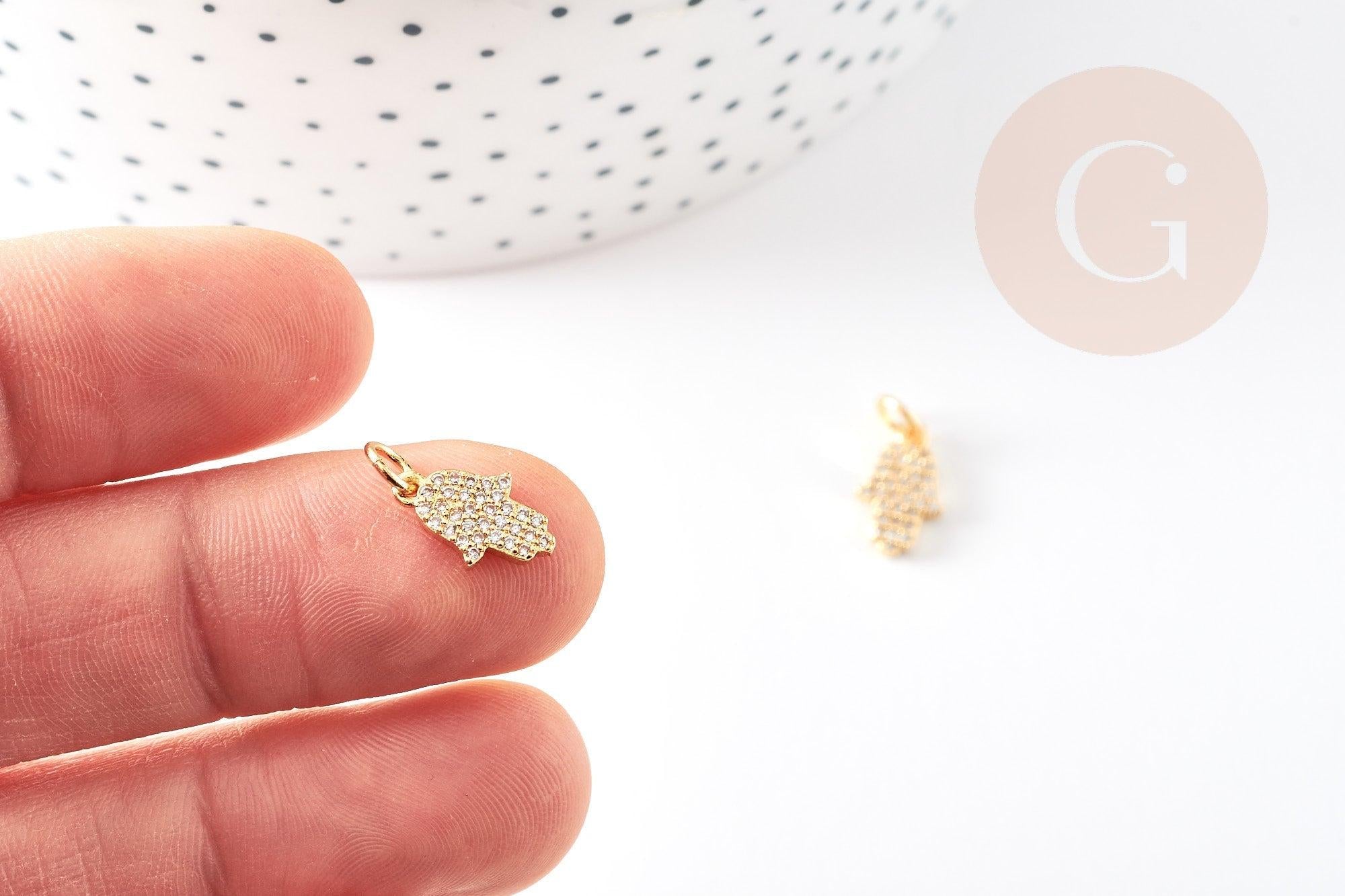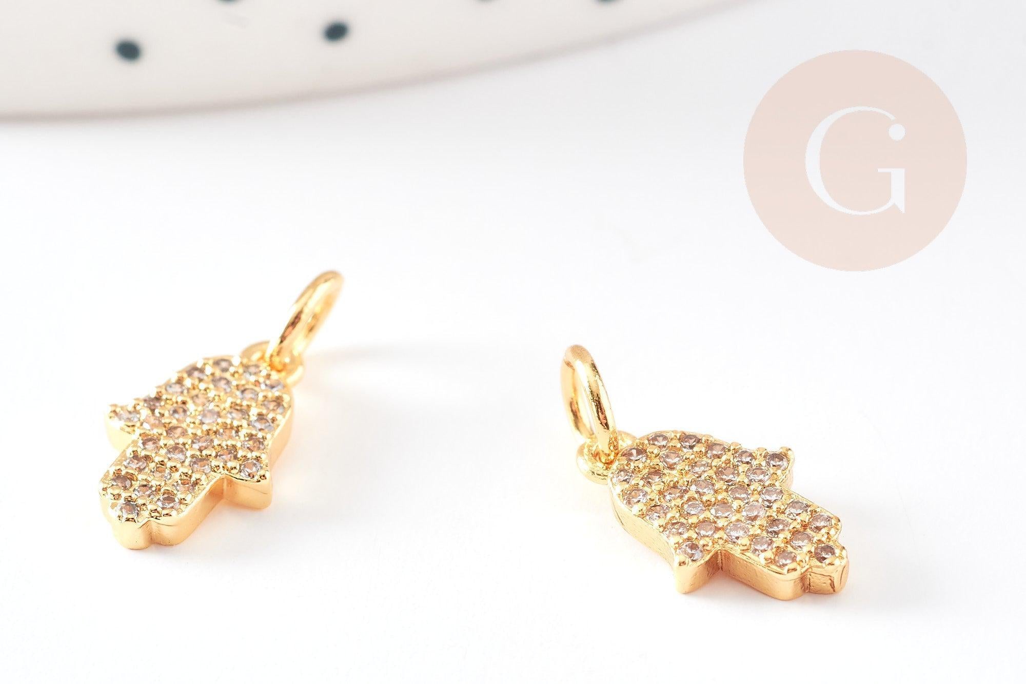 Para realizar magníficos collares, pendientes y pulseras, adopte esta mano de fatma, un pequeño colgante religioso y amuleto de la suerte de latón dorado, decorado con pequeñas circonitas blancas brillantes.