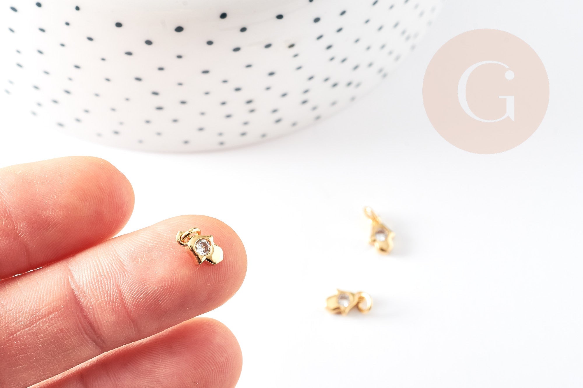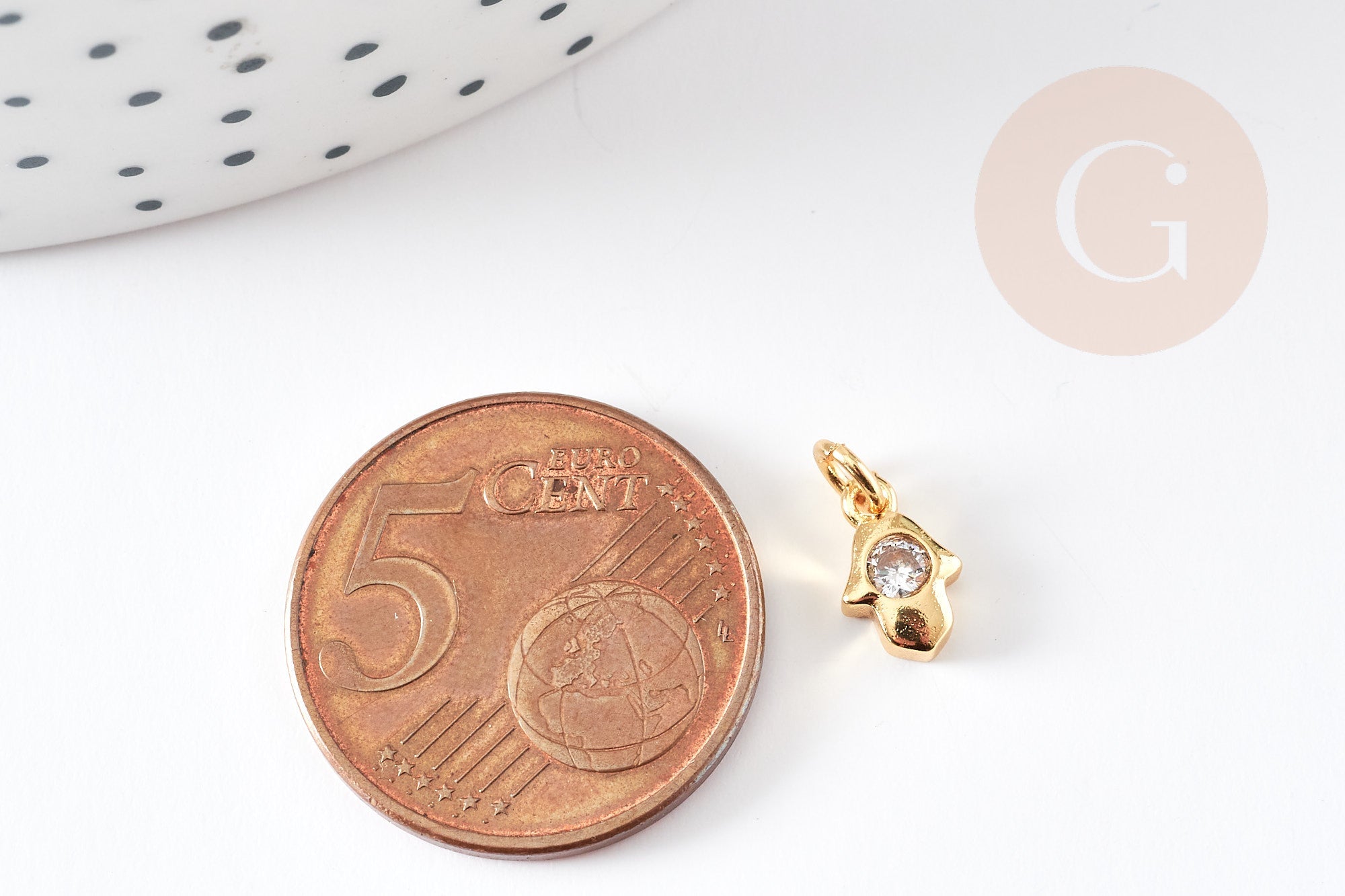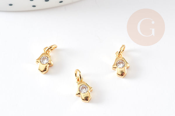 Para realizar magníficos collares, pendientes y pulseras, adopte esta mano de fatma, un pequeño colgante religioso y amuleto de la suerte de latón dorado, decorado con una pequeña circonita blanca brillante.