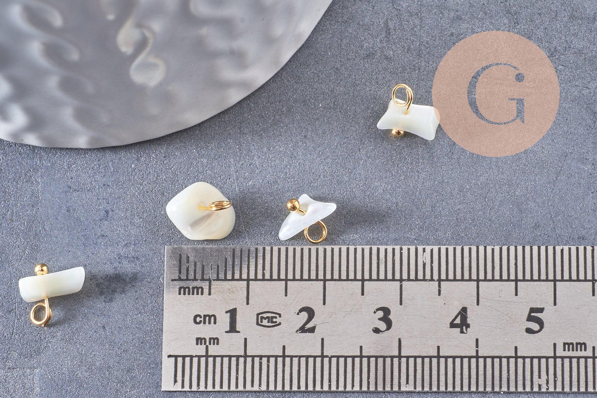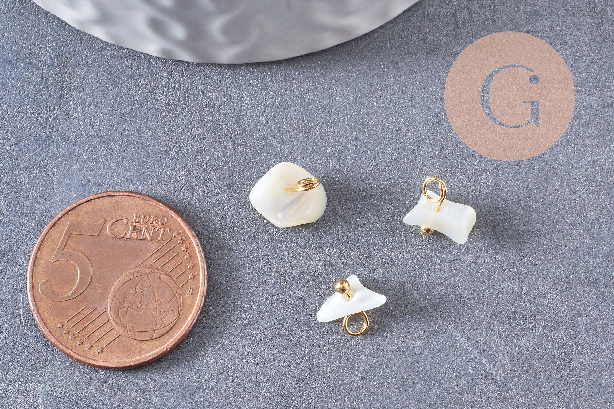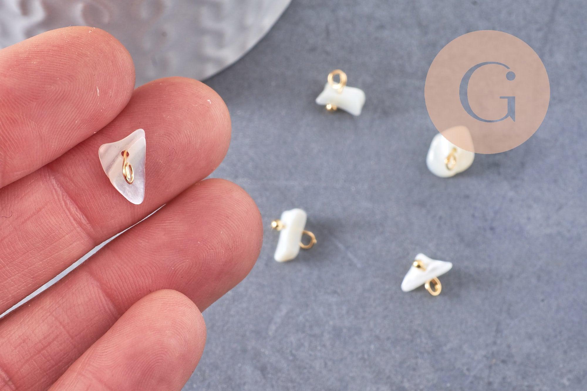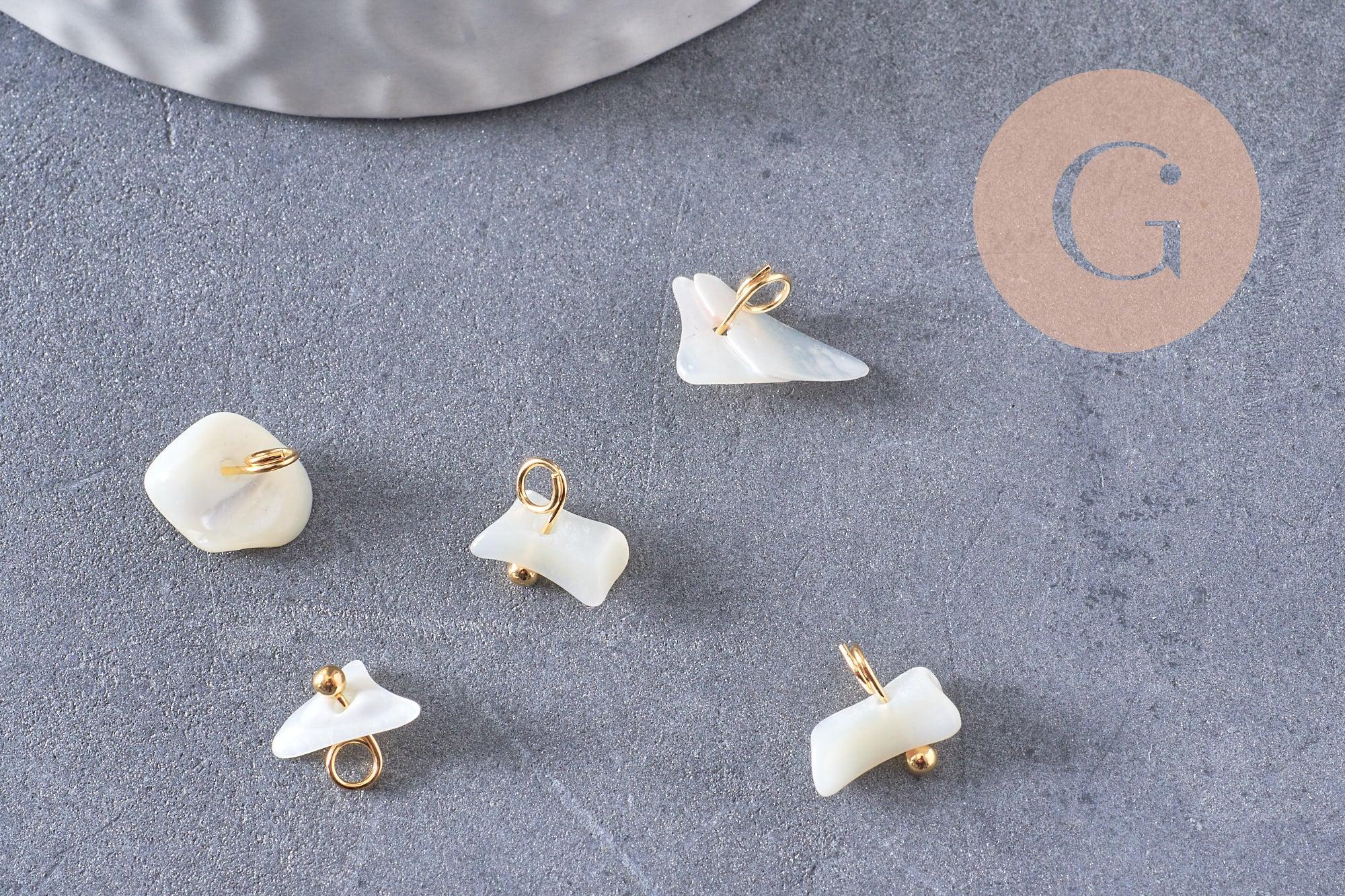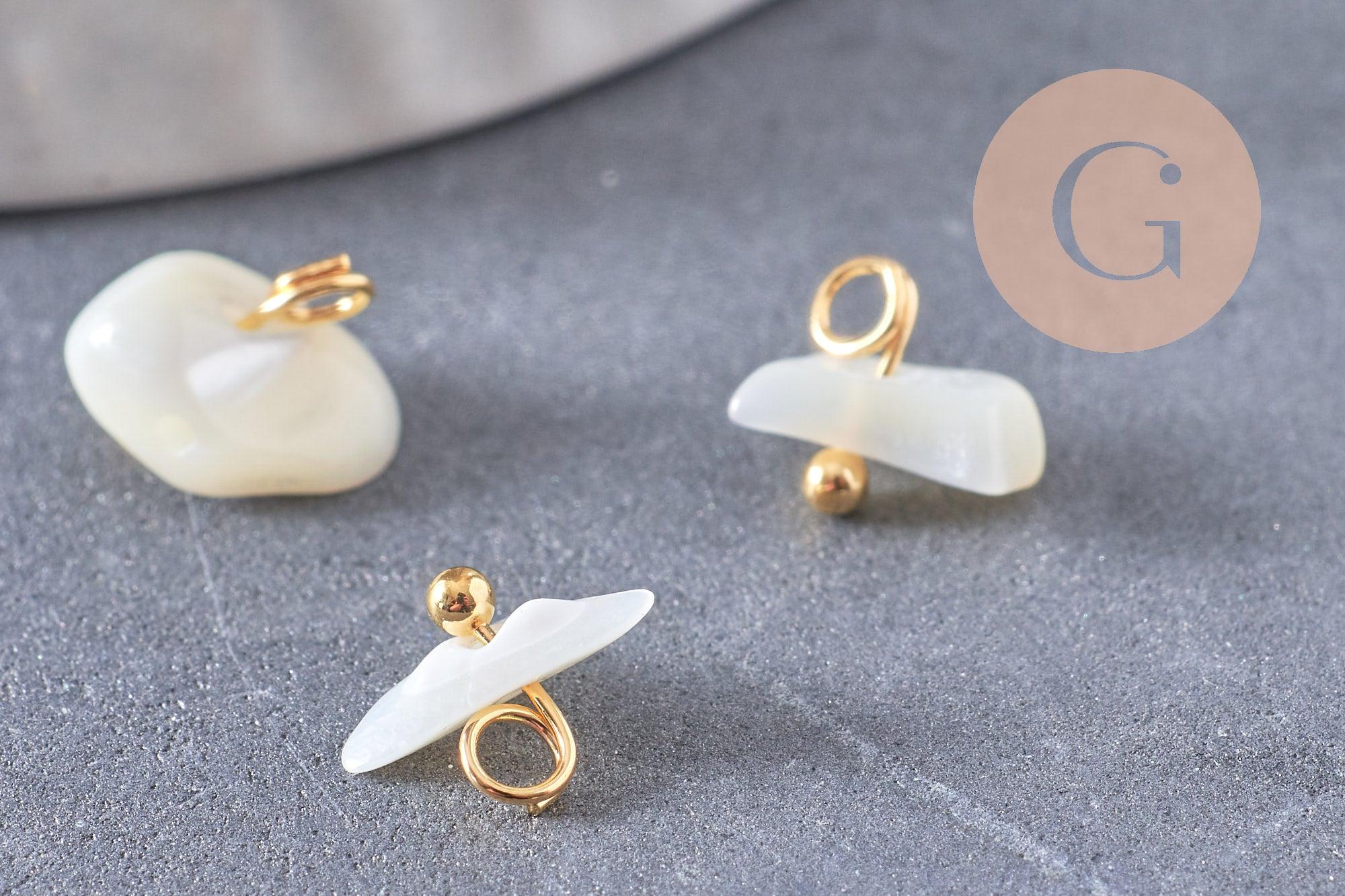Realza tus creaciones con estos charms de pepitas de nácar natural , montados en un anillo de latón bañado en oro . Cada pieza es única gracias a los reflejos iridiscentes del nácar , aportando un toque orgánico, elegante y luminoso a tus joyas.