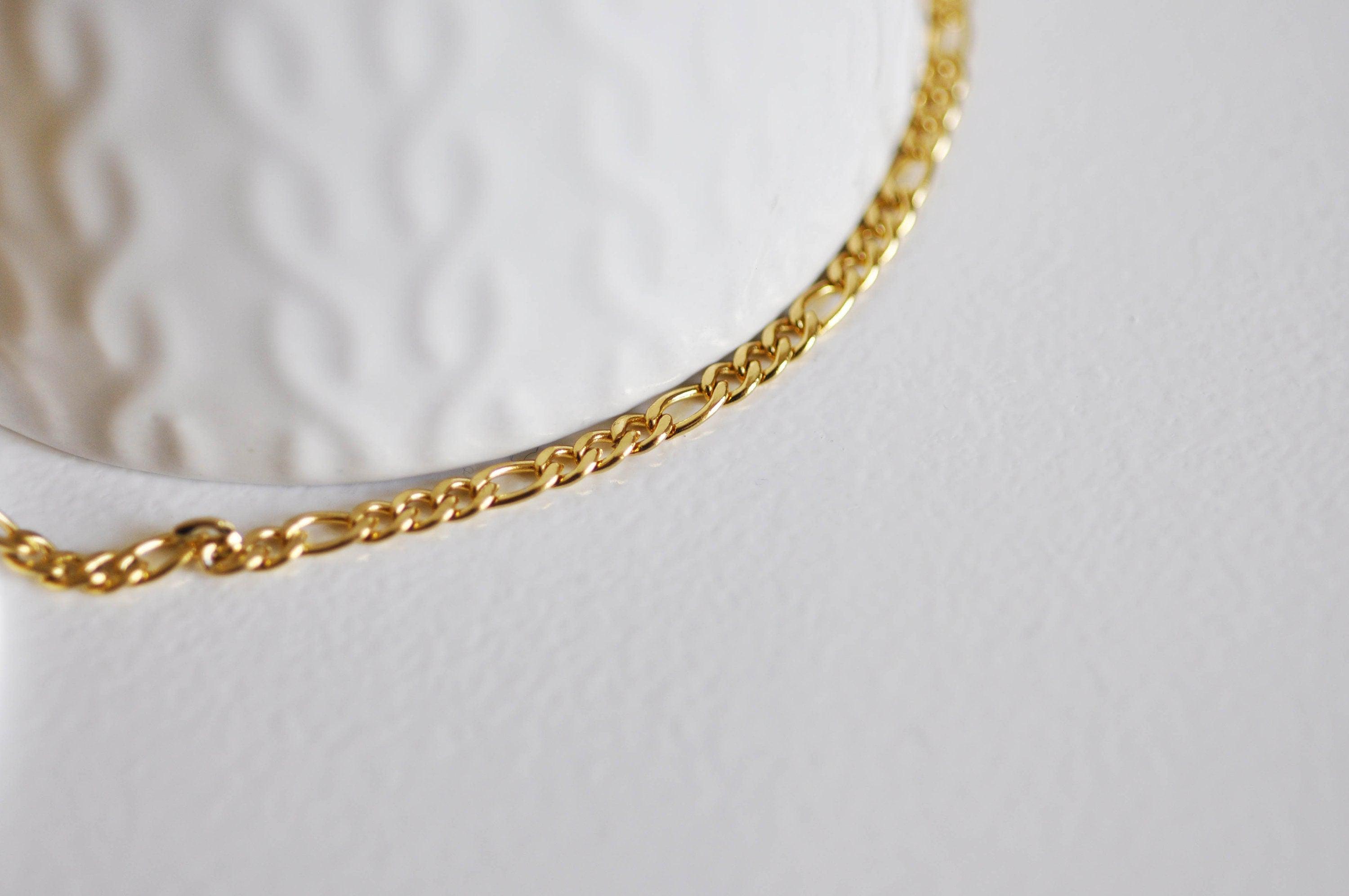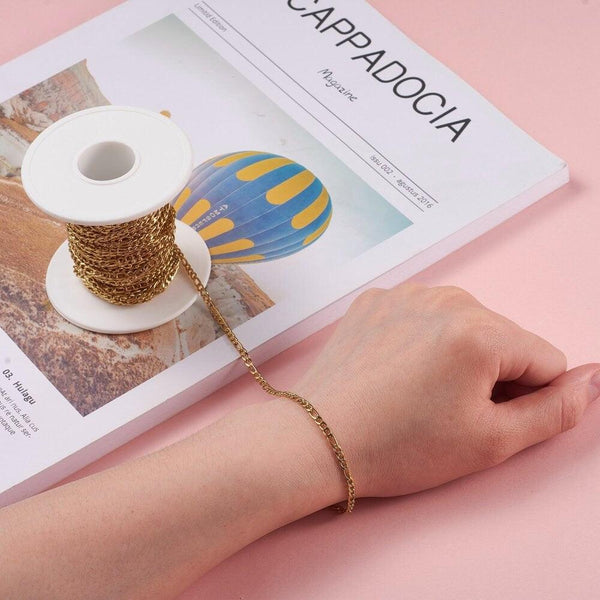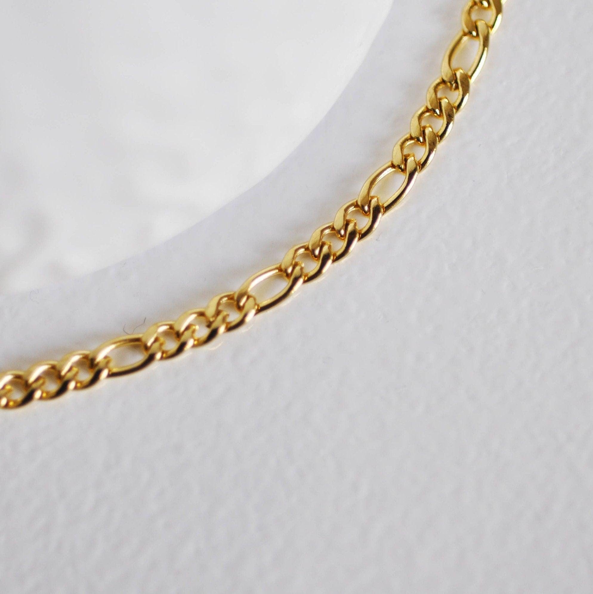 Para realizar rápidamente tus joyas, Gingerily te ofrece esta cadena figaro bañada en oro de acero de muy alta calidad.