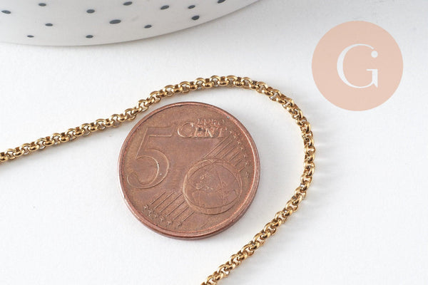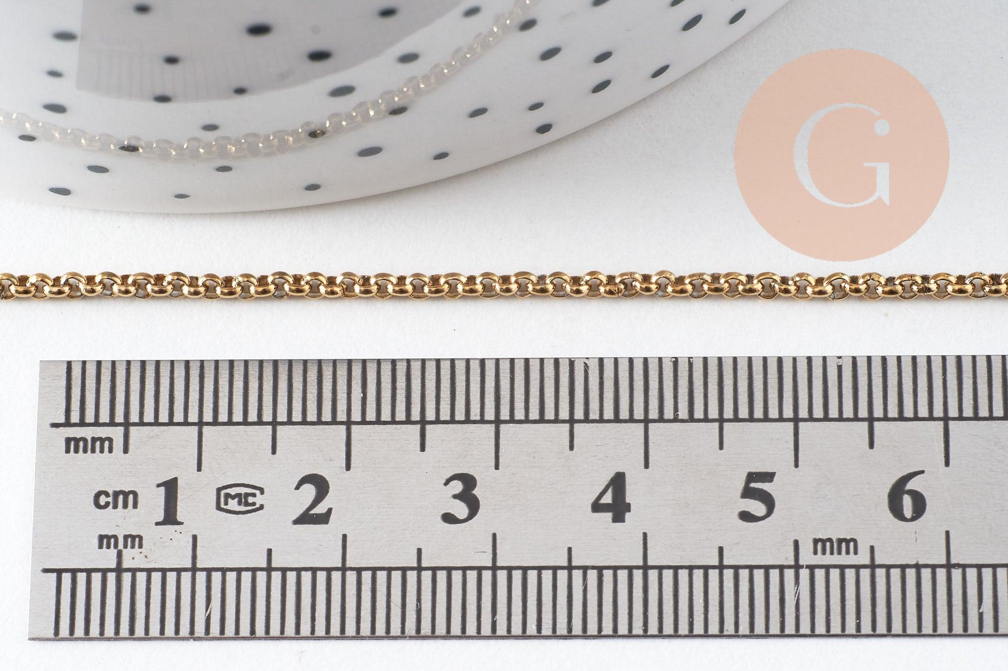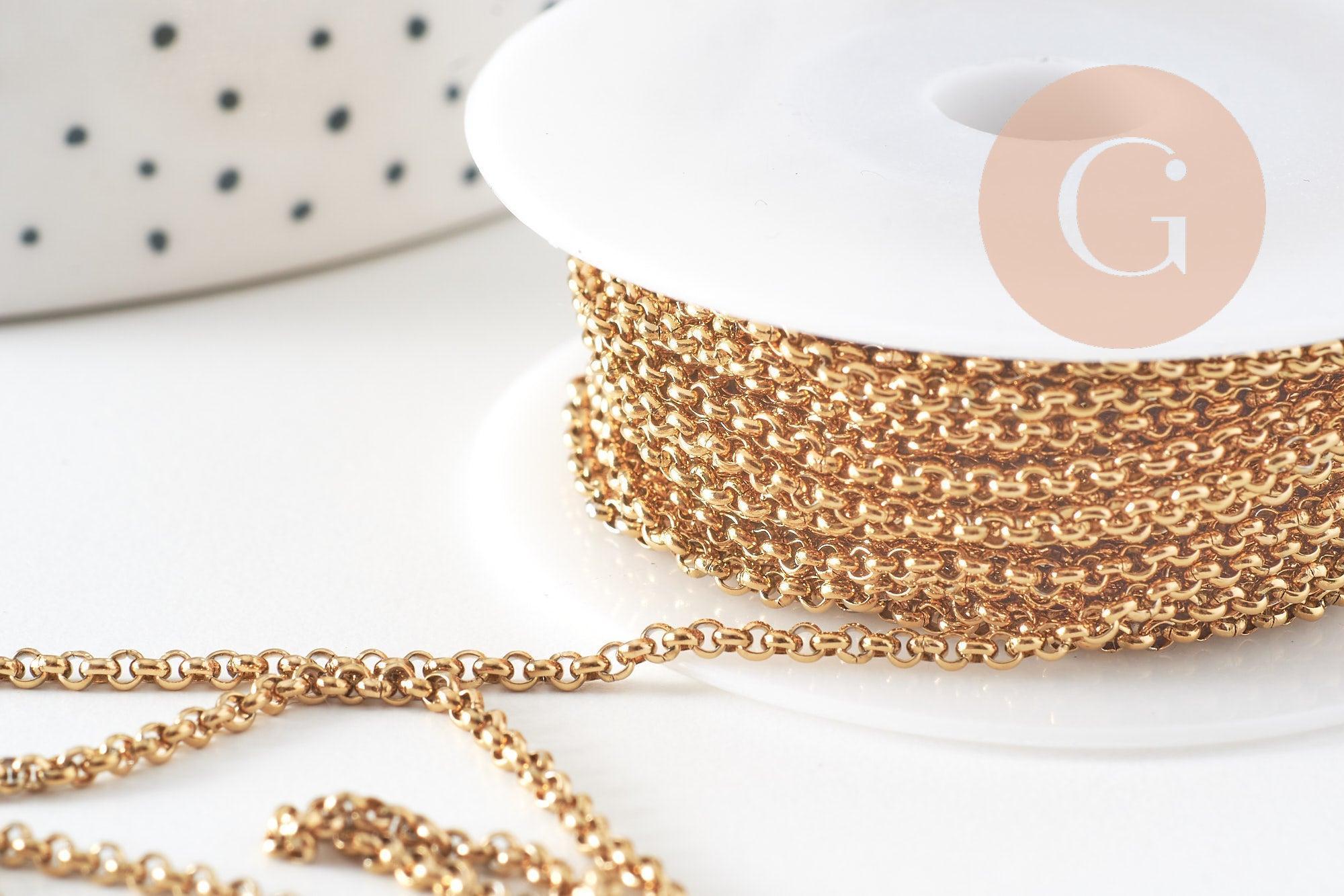 Añade un toque de elegancia atemporal a tus creaciones con esta cadena de eslabones rollo en acero inoxidable 304, chapada en oro de 18 quilates mediante Ion Plating (IP) .