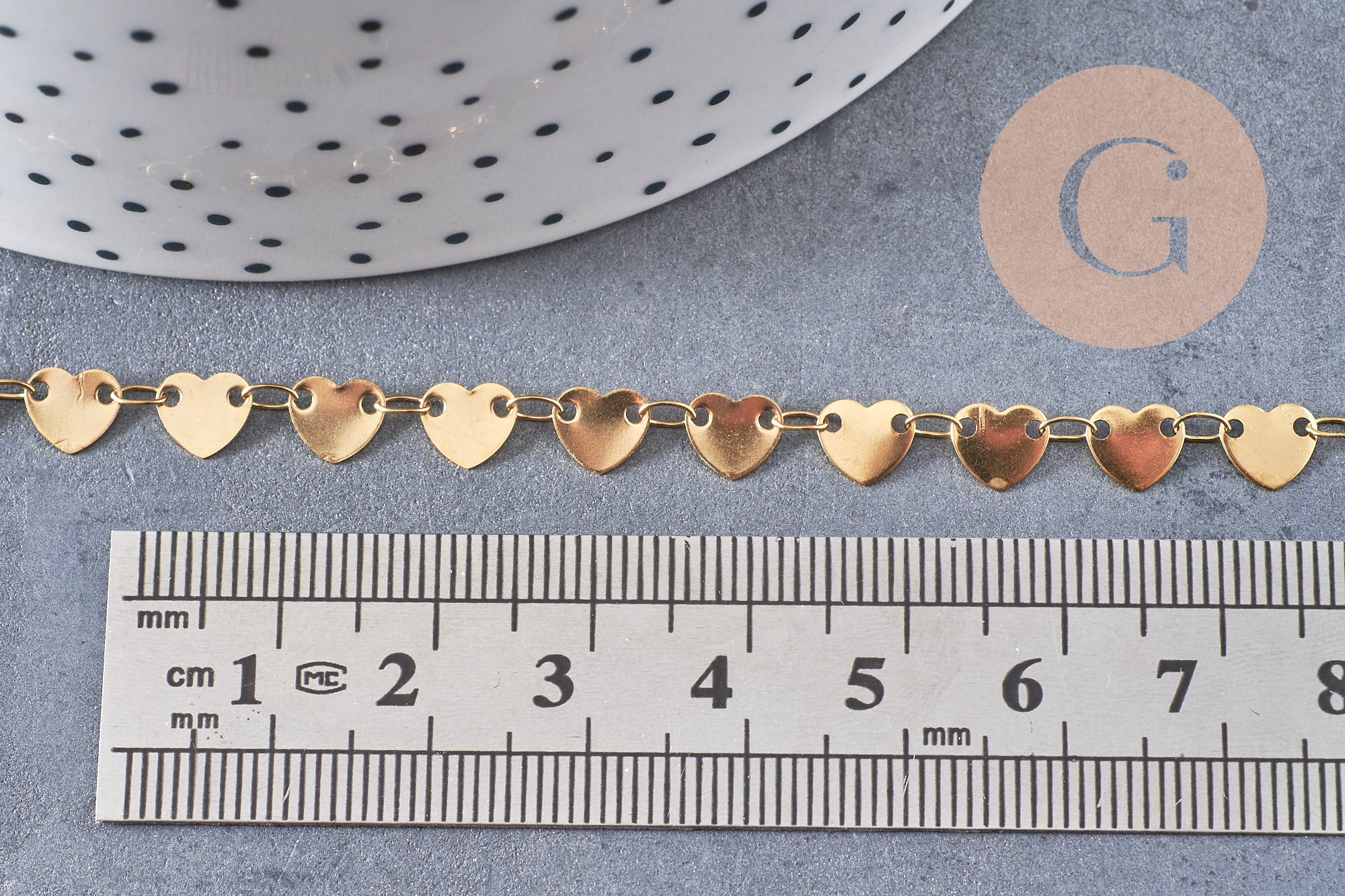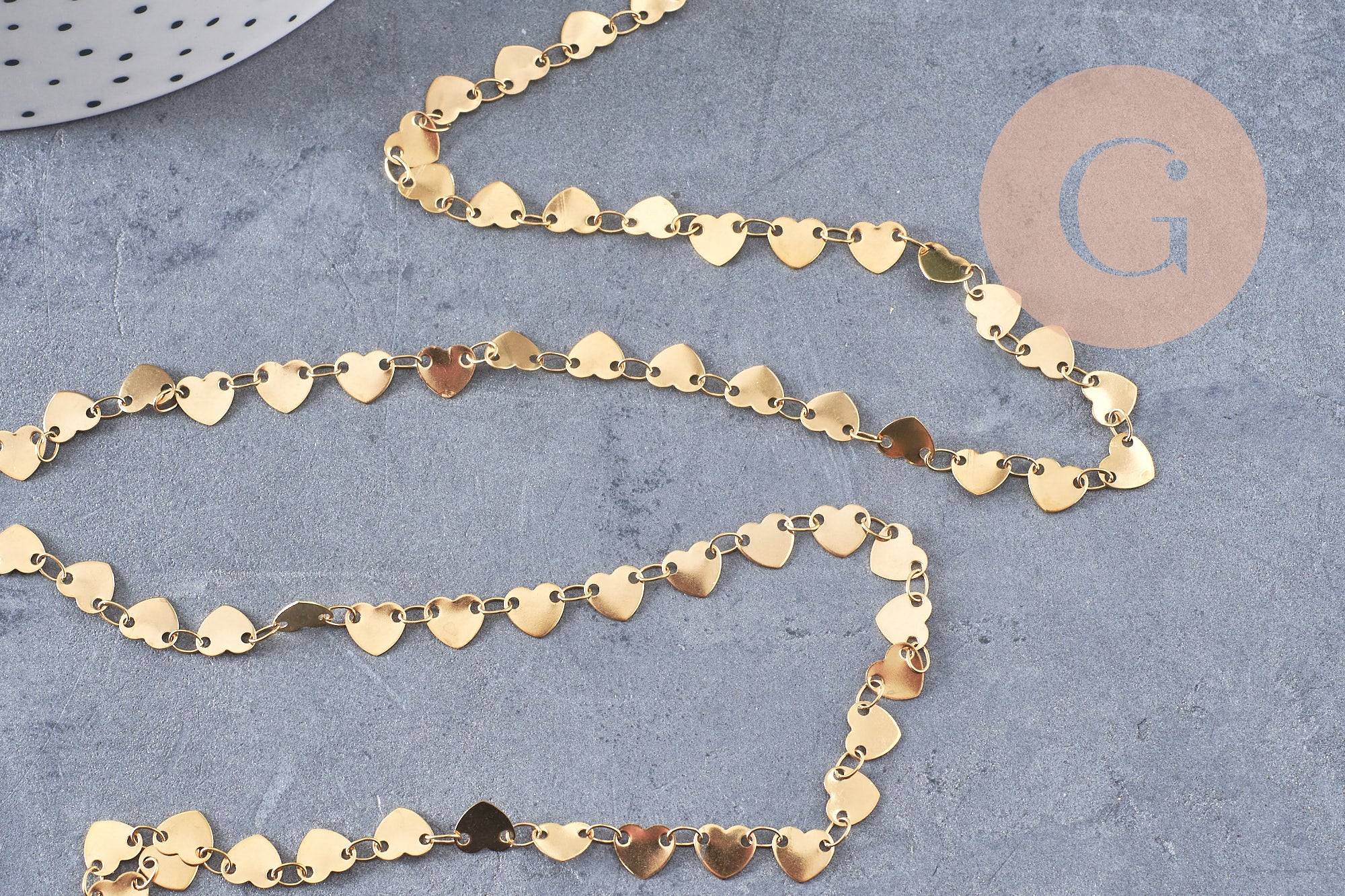 Una elegante cadena de oro de 14 quilates con pequeños corazones vendida por metros