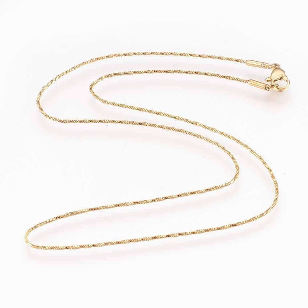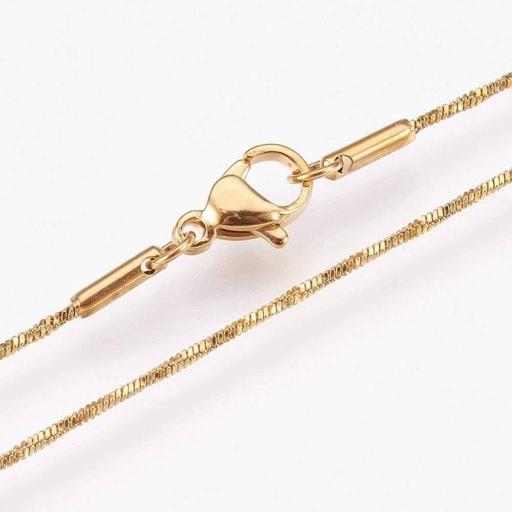 Aporta un toque de elegancia atemporal a tus creaciones con esta cadena de serpiente de acero inoxidable bañada en oro de 14 quilates , ligeramente retorcida para un efecto luminoso y refinado. Su diseño fluido y fino lo convierte en un imprescindible para un look minimalista y sofisticado.