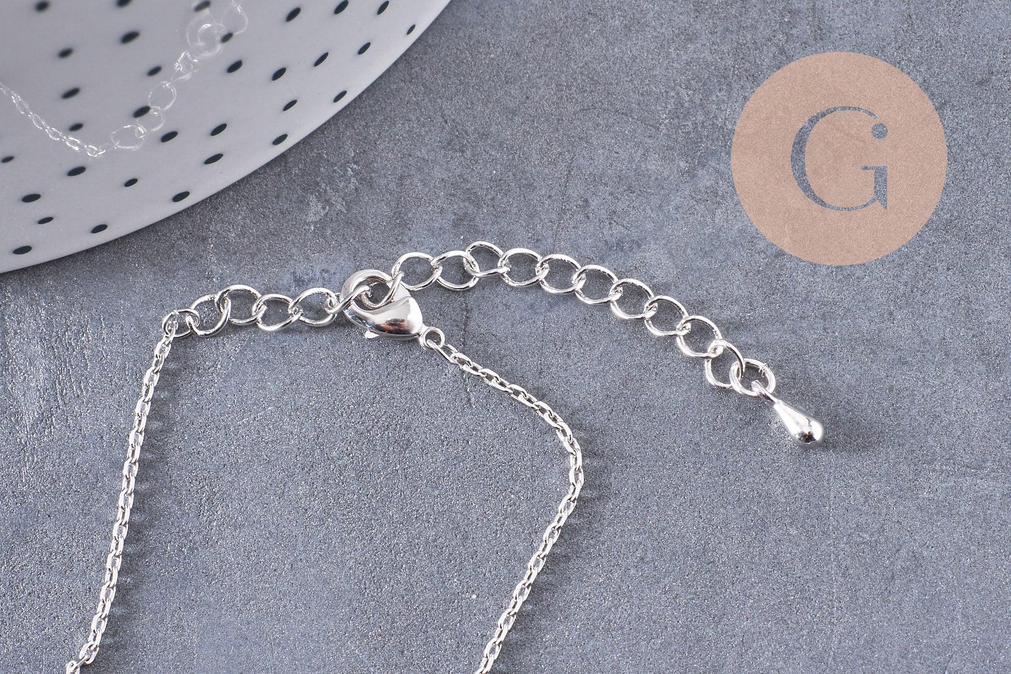 Cadena de latón bañada en oro blanco (Rodio), conocido por ser un metal muy resistente. Se vende completo con cierre y cadena de extensión, también chapada en rodio.