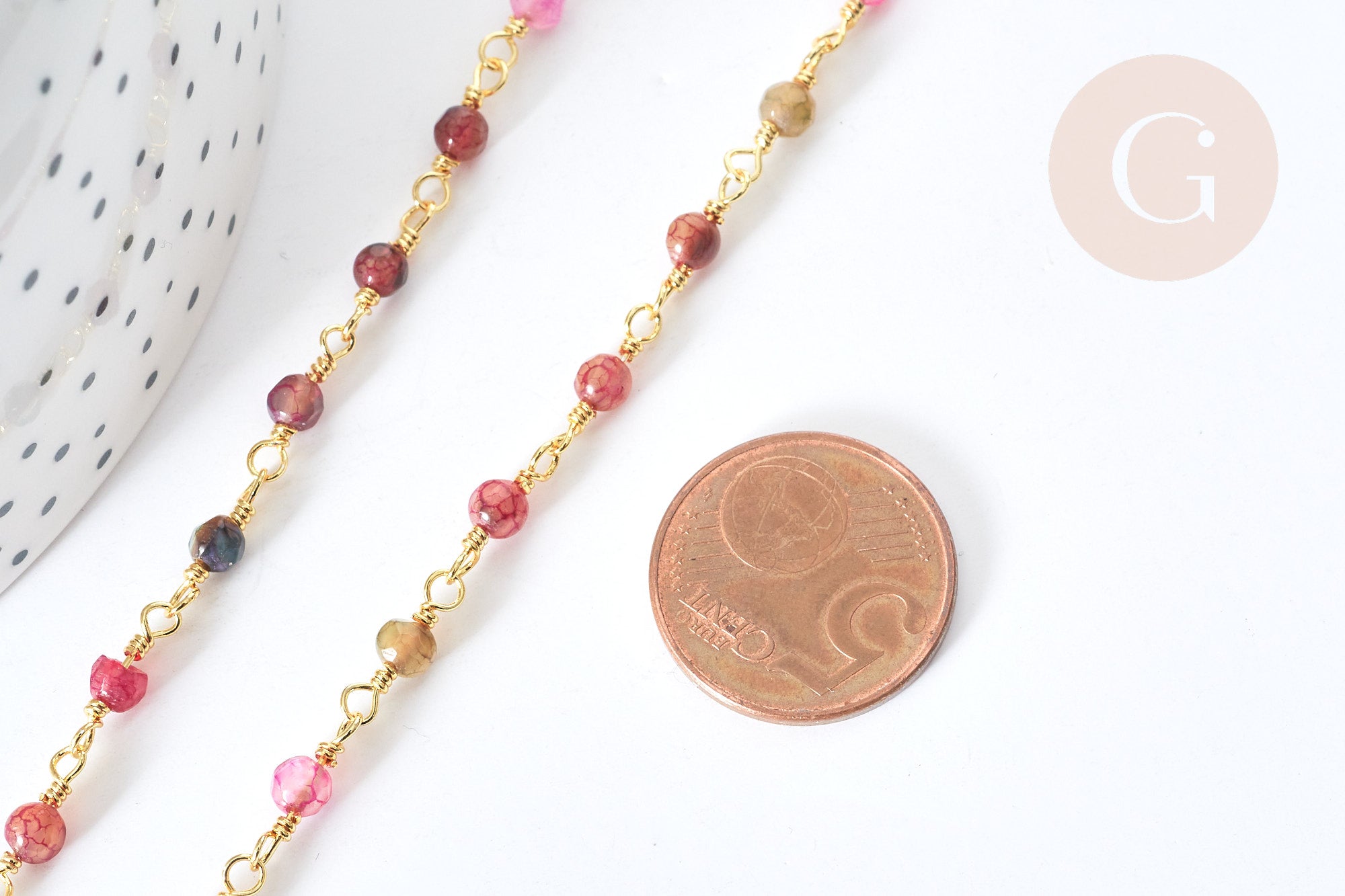 Déjate seducir por esta elegante cadena de latón bañada en oro , elaborada con ágatas naturales de varios colores, translúcidas y facetadas. Ideal para realizar numerosos accesorios de bisutería y moda.