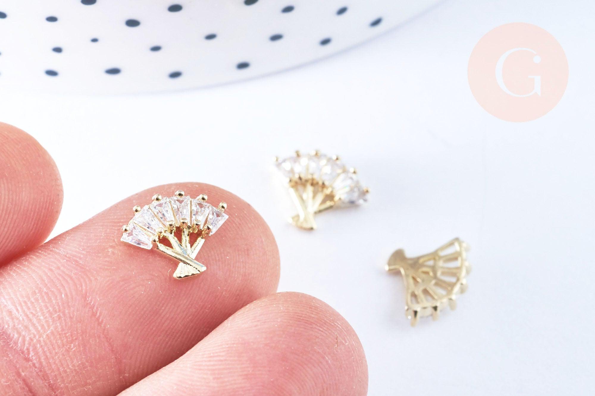 Adopte este elemento abanico de zamac dorado decorado con circonitas blancas, para pegar en sus joyas y piedras. Una base original para crear magníficos collares, pendientes y pulseras personalizados.